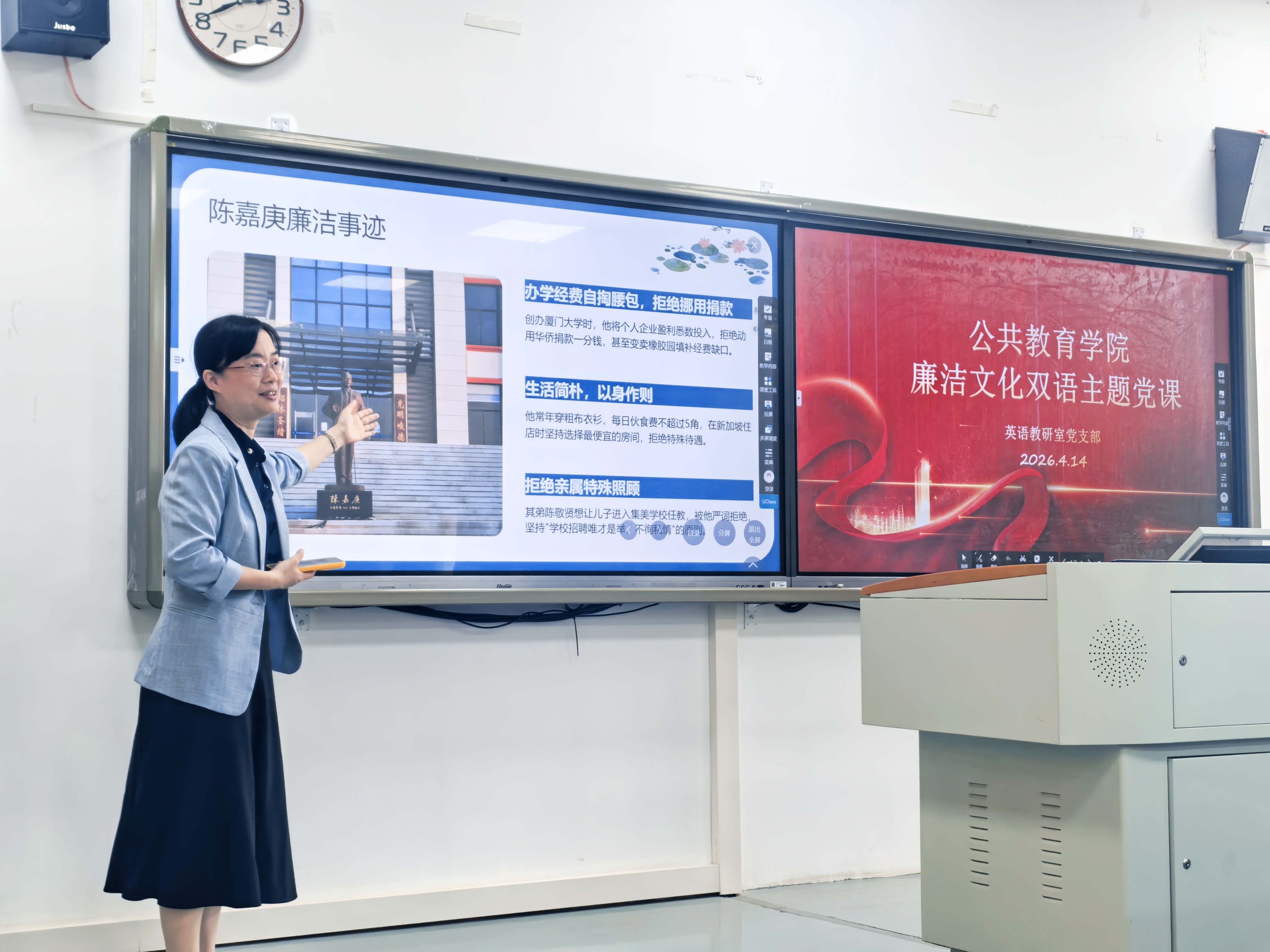 为深化廉洁文化教育,推动中华优秀传统文化与现代教育技术深度融合,4月14日,我校公共教育学院英语教研室党支部组织开展“嘉行惟廉 庚远惟俭”廉洁文化双语主题党课。英语教研室党员教师、校英语协会师生共同参与,以双语传播、AI赋能的创新形式,传承廉洁基因,弘扬嘉庚精神。