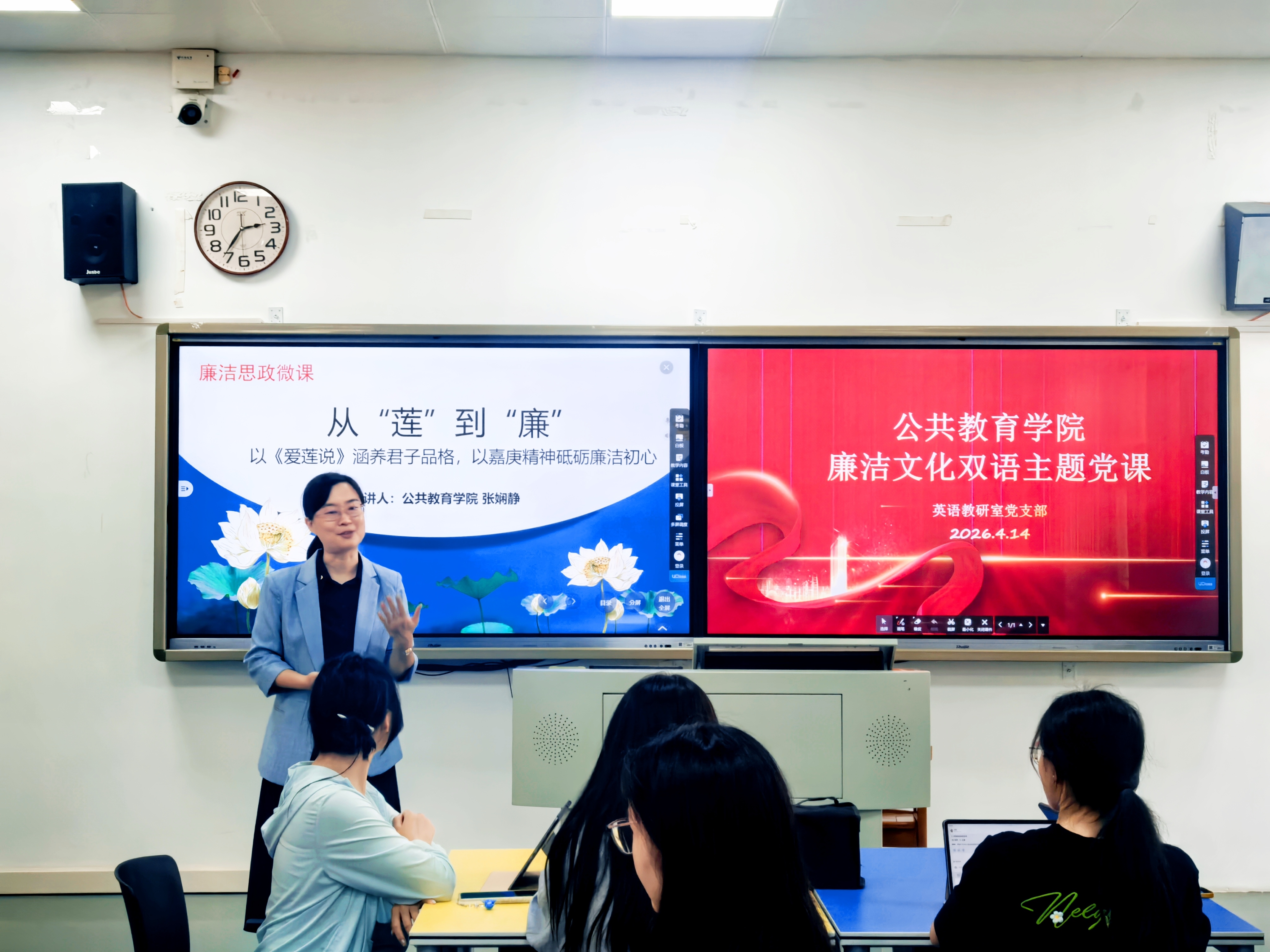 英语教研室党员教师封虹虹围绕《爱莲说》经典名句开展英译赏析,对比翟理斯、林语堂、许渊冲等名家译本,讲解东方廉洁意象的跨文化表达技巧,帮助同学们用英语精准传递“莲即君子、廉以修身”的价值理念,拓宽廉洁教育的国际视野。