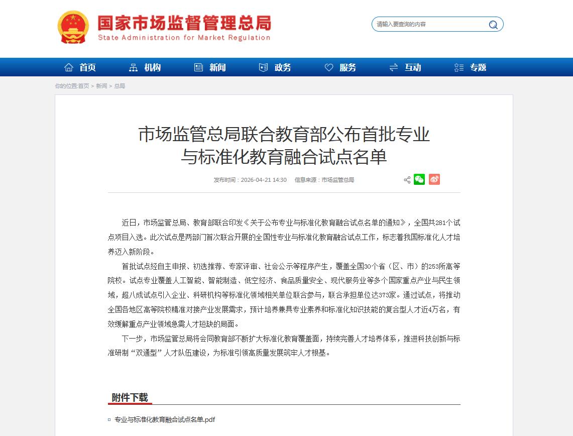此次试点是市场监管总局与教育部首次联合开展的全国性专业与标准化教育融合工作,旨在贯彻落实《国家标准化发展纲要》《教育强国建设规划纲要(2024—2035年)》等部署,培养兼具专业能力和标准化知识技能的高素质人才。试点专业覆盖人工智能、智能制造、低空经济、现代服务业等重点领域,超八成试点引入企业、科研机构等联合参与,联合承担单位达373家。