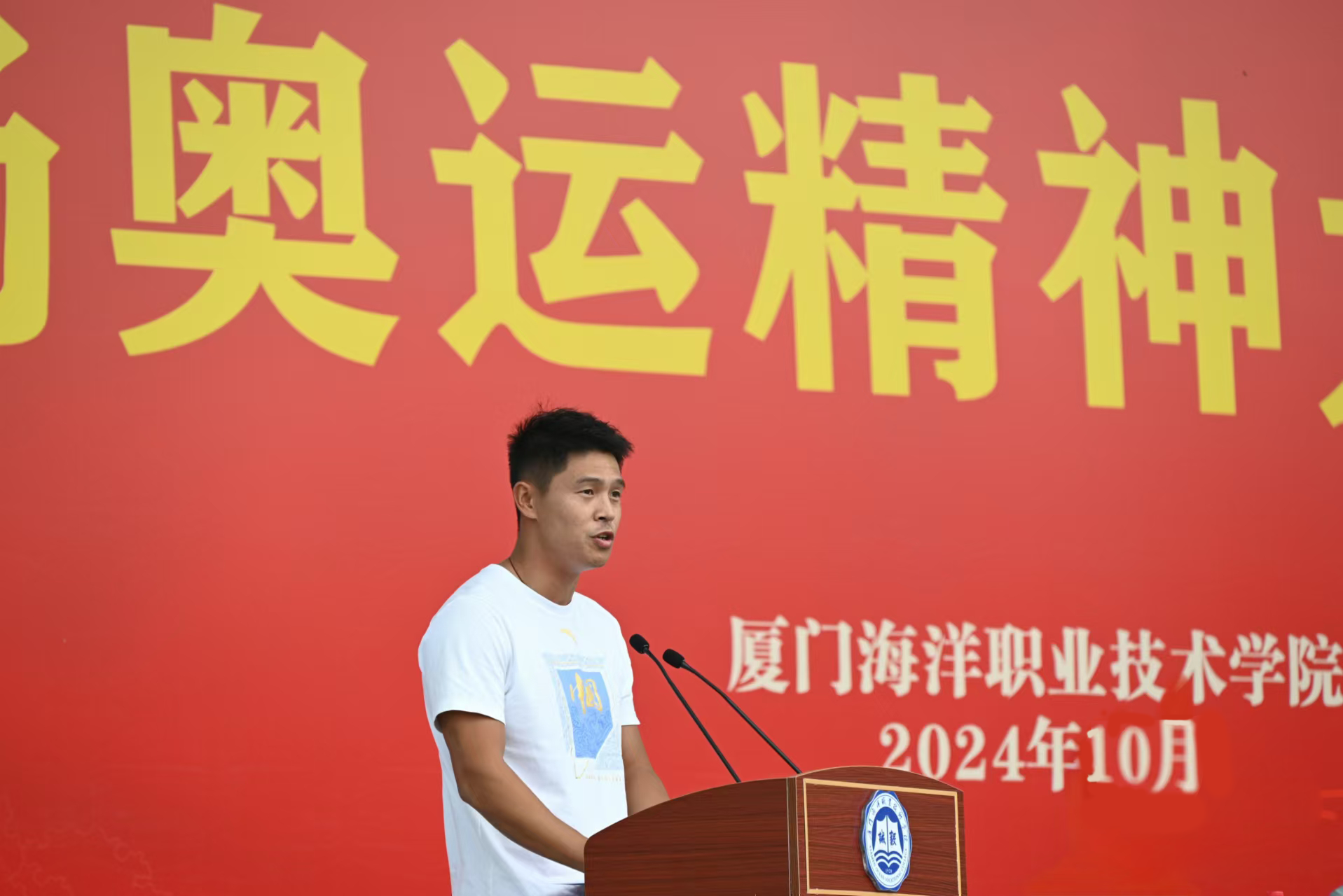 第十九届杭州亚运会男子单人划艇冠军谢远聪、第十九届杭州亚运会男子赛艇八人单桨有舵手冠军陈弦峰,及厦门海洋职业技术学院体育教师、原国家帆船队队员、帆船亚锦赛冠军陈和池,厦门海洋职业技术学院体育教师、原国家皮划艇队、龙舟队队员、龙舟世锦赛冠军郑家欣进行现场宣讲奥运精神。来自西部及福建省的8所大中小学、三万余名学生,通过线上线下相结合的方式同上一堂大思政课。