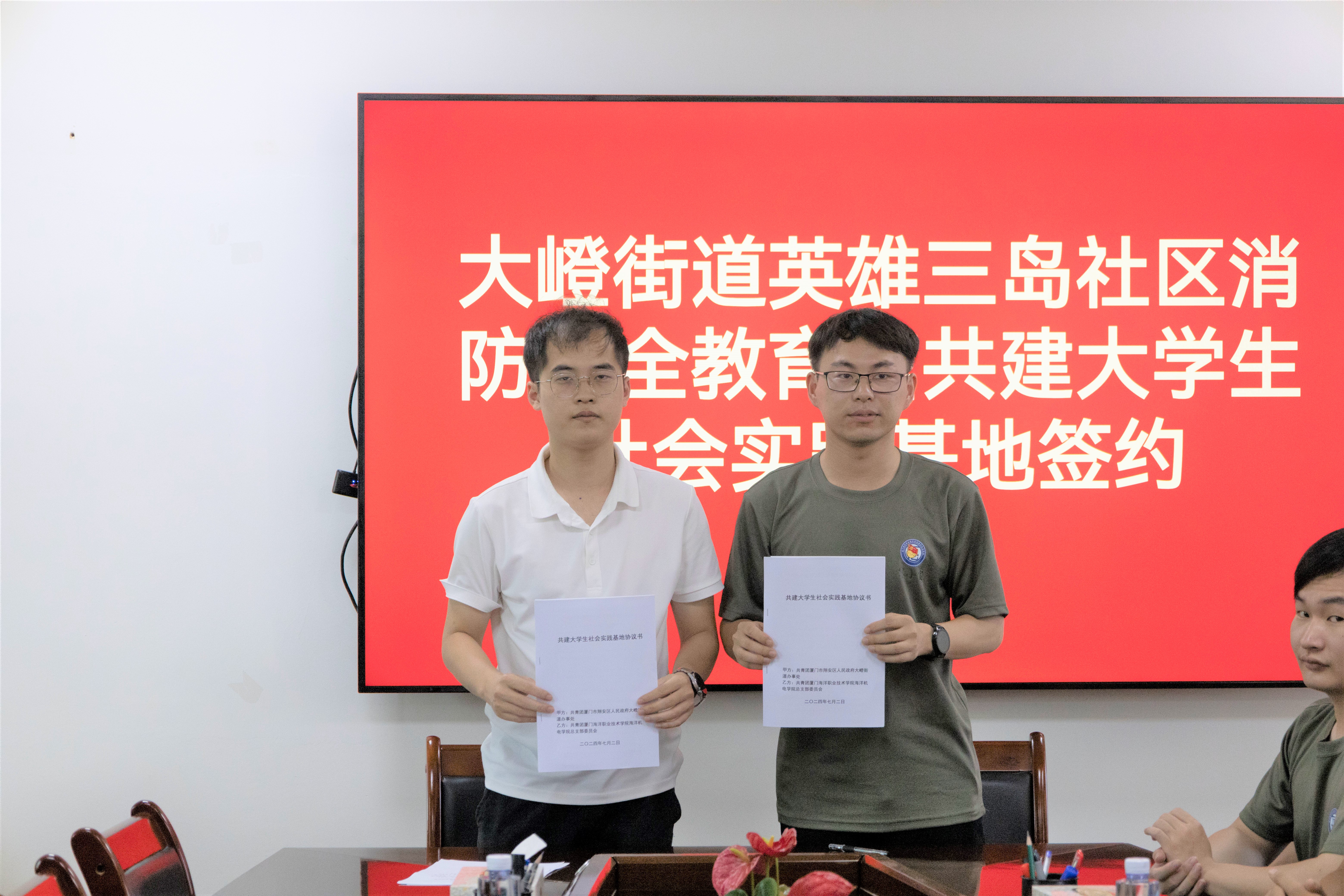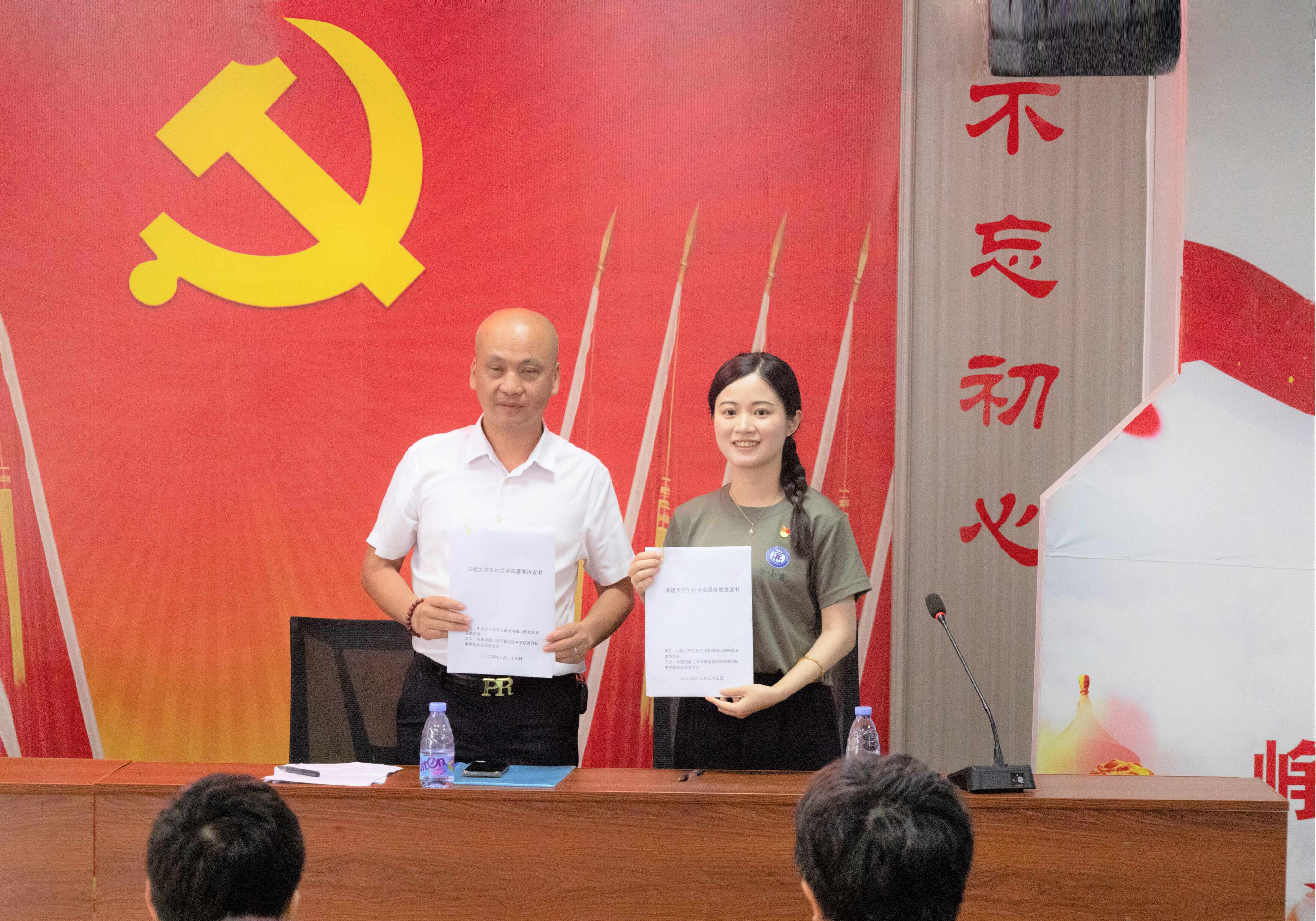 晋江市安海镇山兜村村支书苏子崖与厦门海洋职业技术学院“军小宣”宣讲团指导老师苏小青就人才培养、共建内容、志愿服务等多个方面进行详细深入的沟通交流,并签订共建协议书。双方一致认为,共建大学生社会实践平台,能够帮助大学生走出校园、走向社会,将所学理论应用到实践,加强实践锻炼,增强本领才干,为建设平安乡村贡献青春力量。