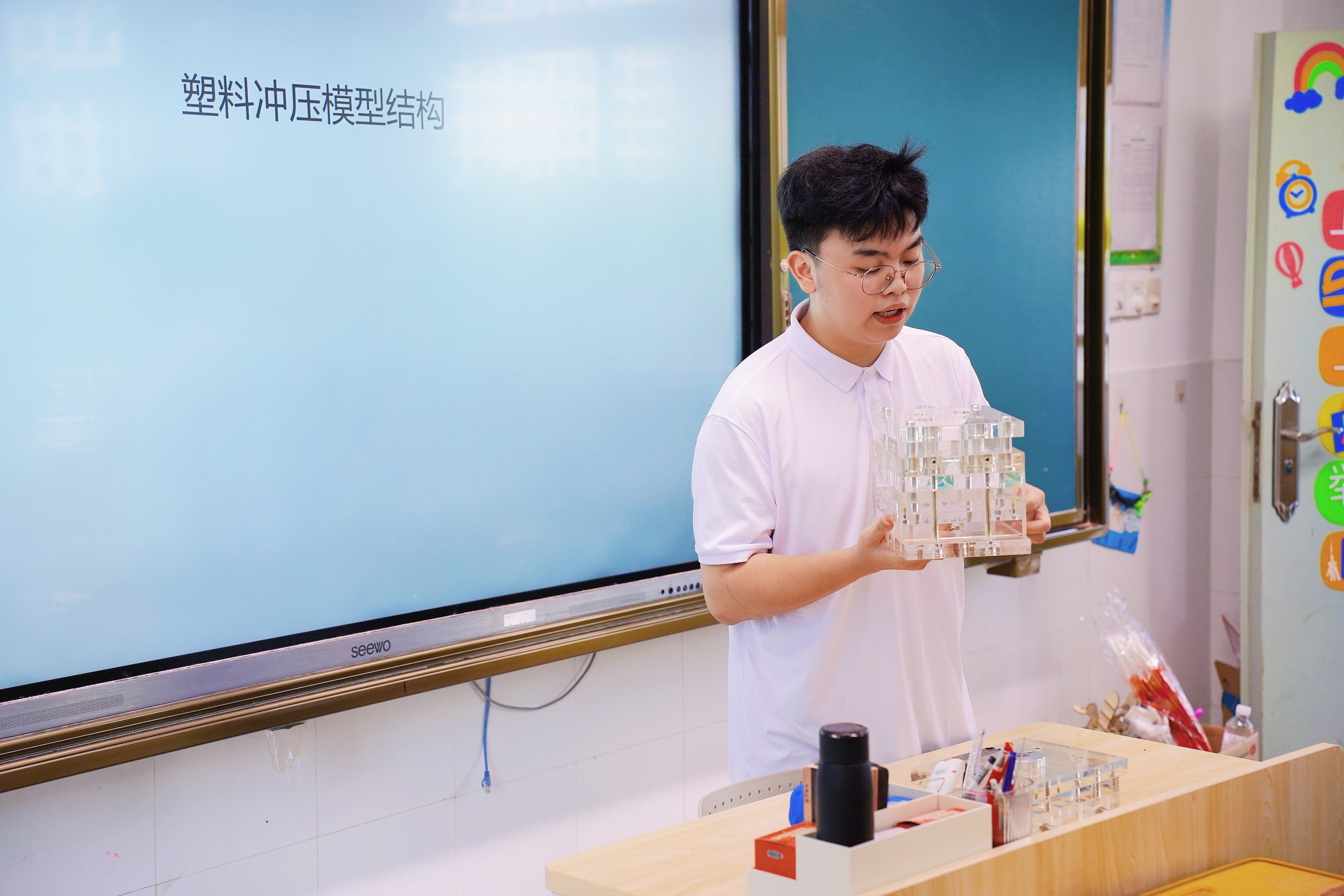 巧设问题,引起思考。实践队让同学观察自己的水杯、矿泉水瓶等塑料用品,思考这些物品是如何把原材料制作成一定形状的。接着队员通过动画、视频等形式简要介绍了塑料成型过程,塑料成型主要有注塑、吹塑、模压成型等方法,模具的制造方法有CNC加工、3D打印等。而后列举了常见塑料种类与应用,比如PP、PS、ABS、新型塑料等。 讲授过程将知识点与日常生活结合起来,生动有趣,引起同学们的学习兴趣,实现专业启蒙。接着,另一位队员向同学们介绍了塑料污染的现状并提出减塑行动倡议,鼓励学生们从日常小事做起,减少塑料使用。