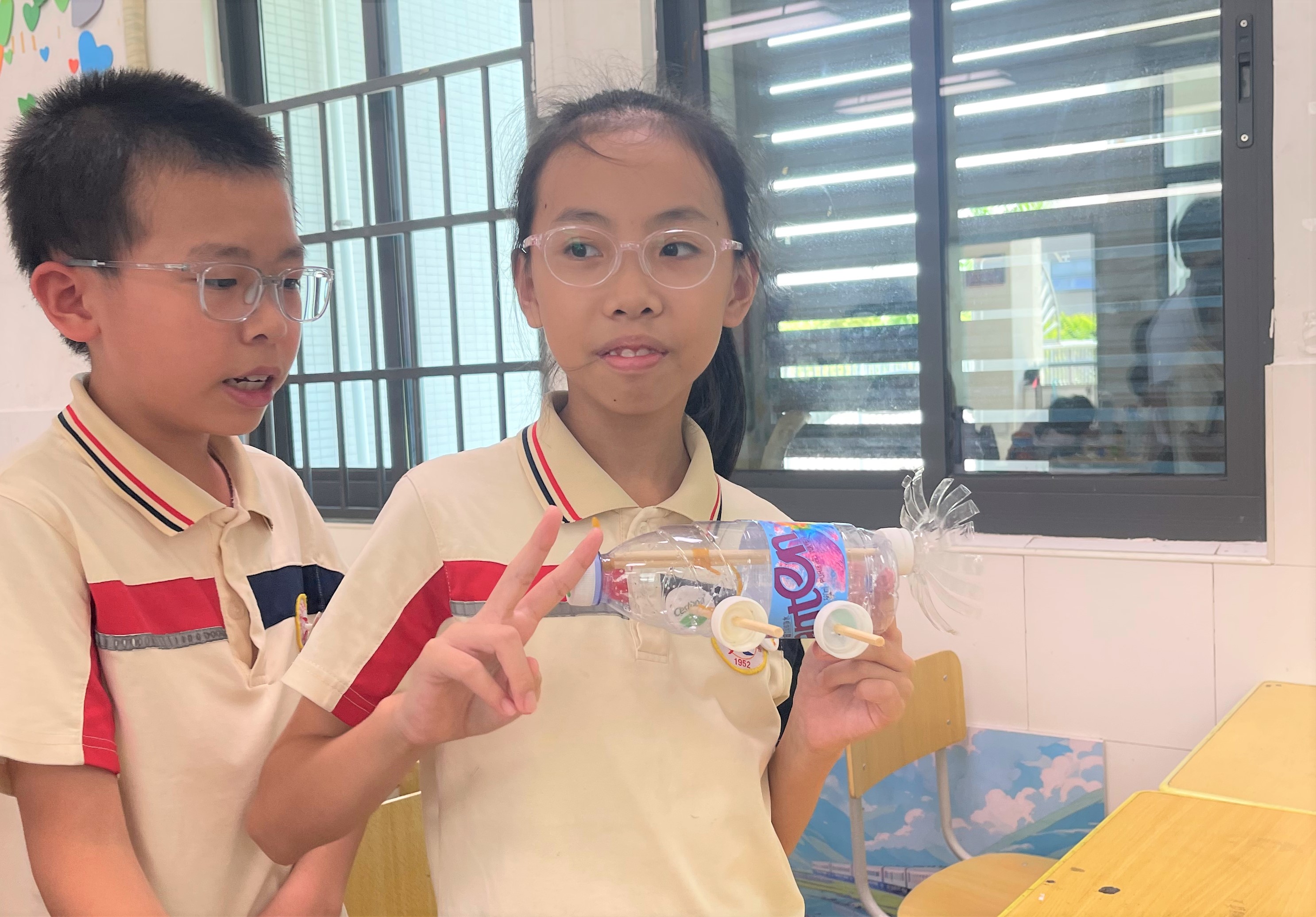 实践队精心设计了手工环节,四位同学组成一队,废弃的塑料瓶摇身一变成了会跑的小汽车,齐心协力变废为宝。