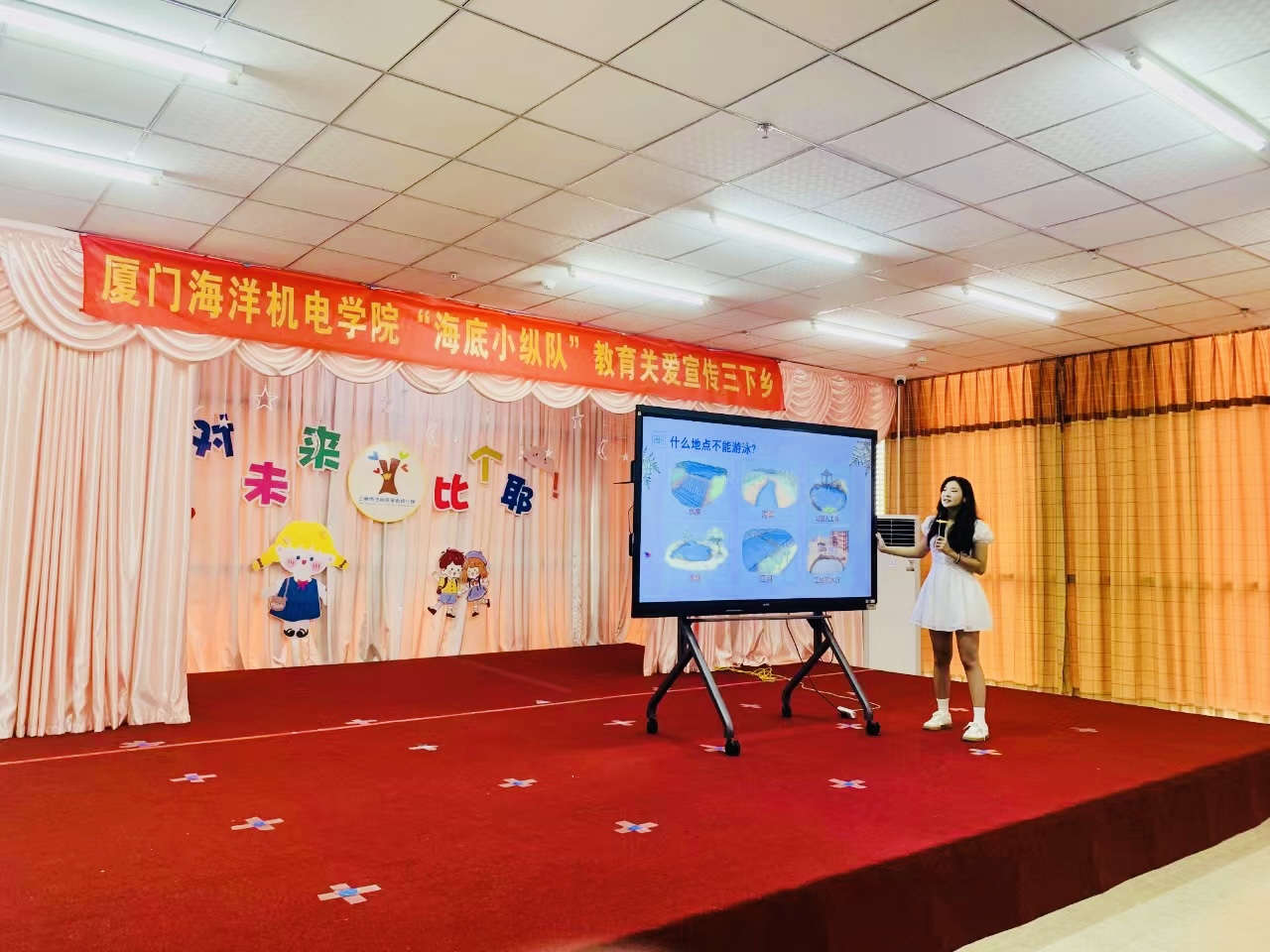 活动现场,海洋机电学院的志愿者们为孩子们带来了一堂生动的安全教育课,通过PPT展示、动画视频和游戏卡片等多种形式,让孩子们在轻松愉快的氛围中了解了溺水的危害和防溺水的基本知识。