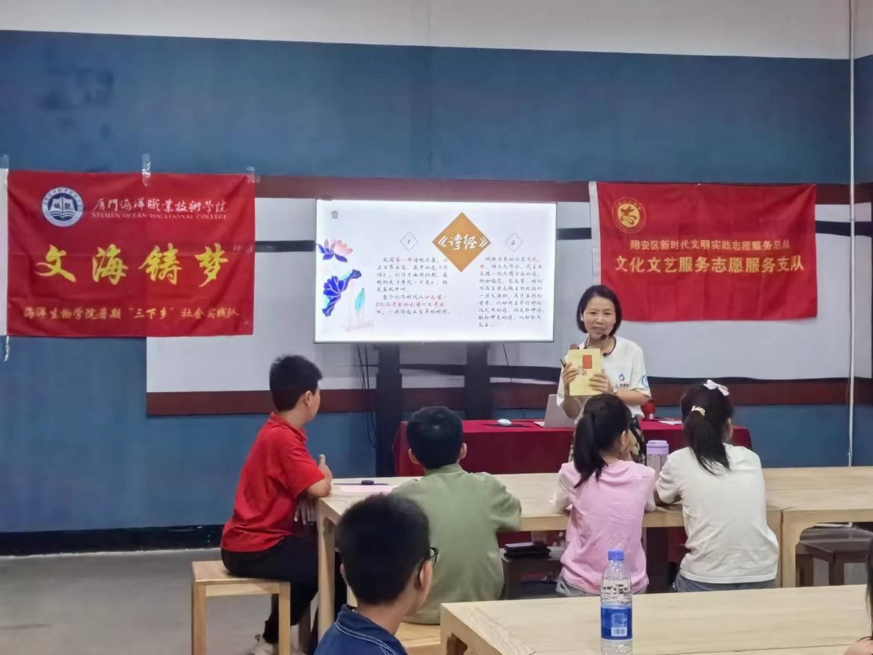 为深入学习贯彻习近平文化思想,6月30日,厦门海洋职业技术学院文海铸梦暑期“三下乡”社会实践队携手翔安区金海街道办事处、翔安区新时代文明实践中心和翔安区图书馆,在澳头社区举办“传承经典,守护文明”主题活动。