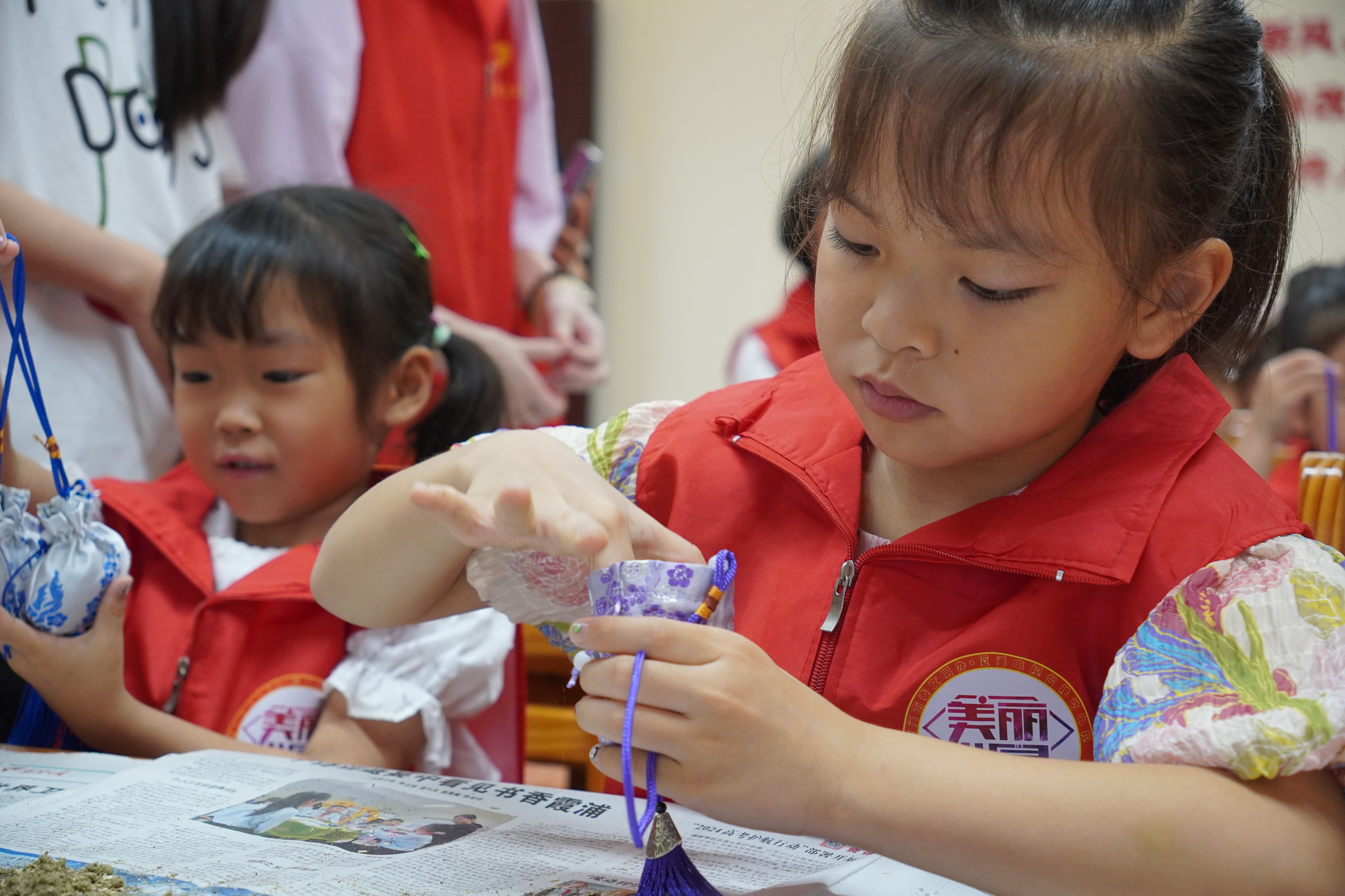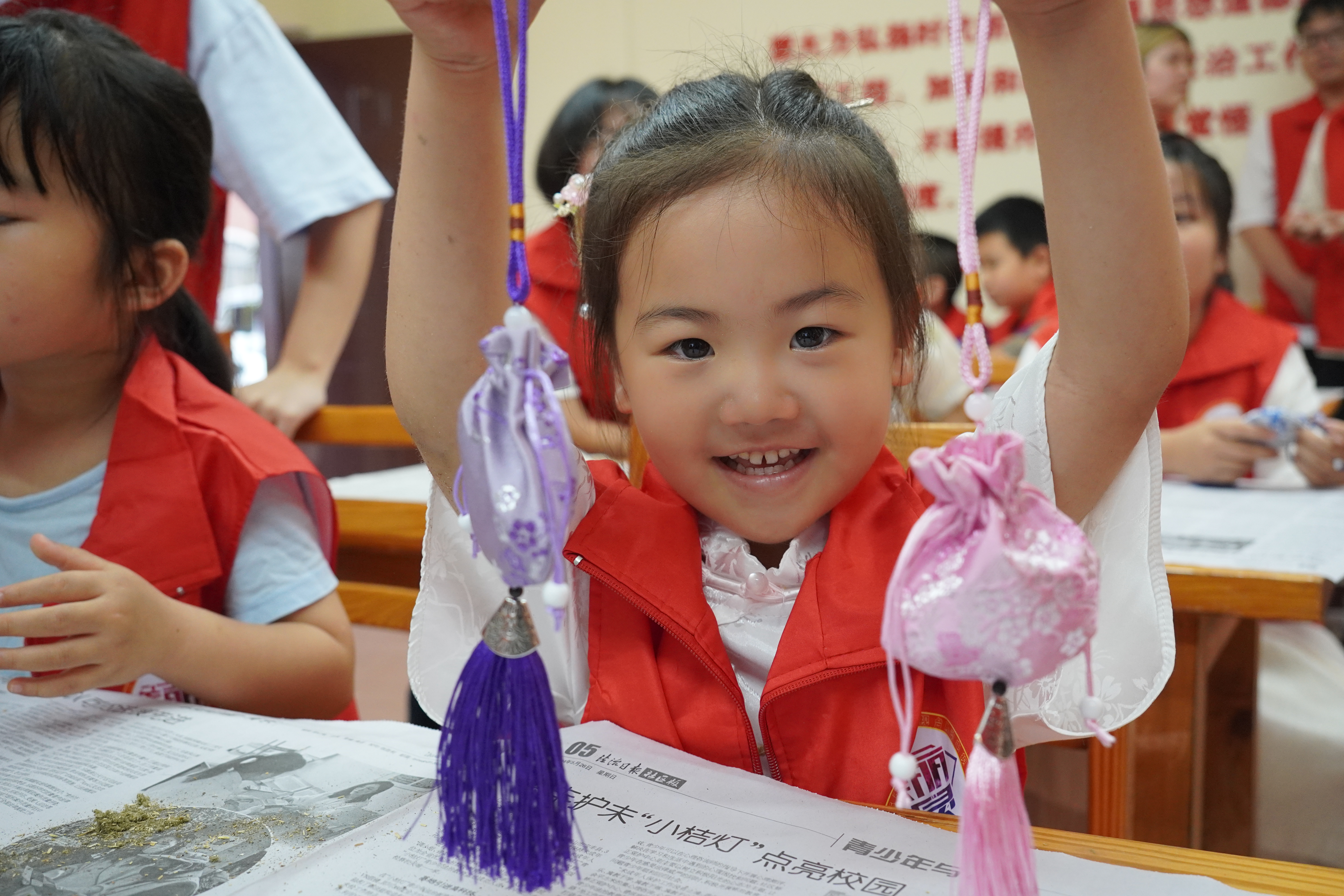 端午节有采草药和佩戴香囊的传统。将藿香、艾叶、薄荷等有芳香开窍的中草药,按照一定的比例制作成香囊,随身佩戴,有清香、驱虫、避瘟、防病的功效。在制香囊环节,邹钰同学在讲述香囊的制作步骤后,在团员志愿者的帮助下,小朋友们有序挑选、称量、填充,制作成一个个精美香囊。