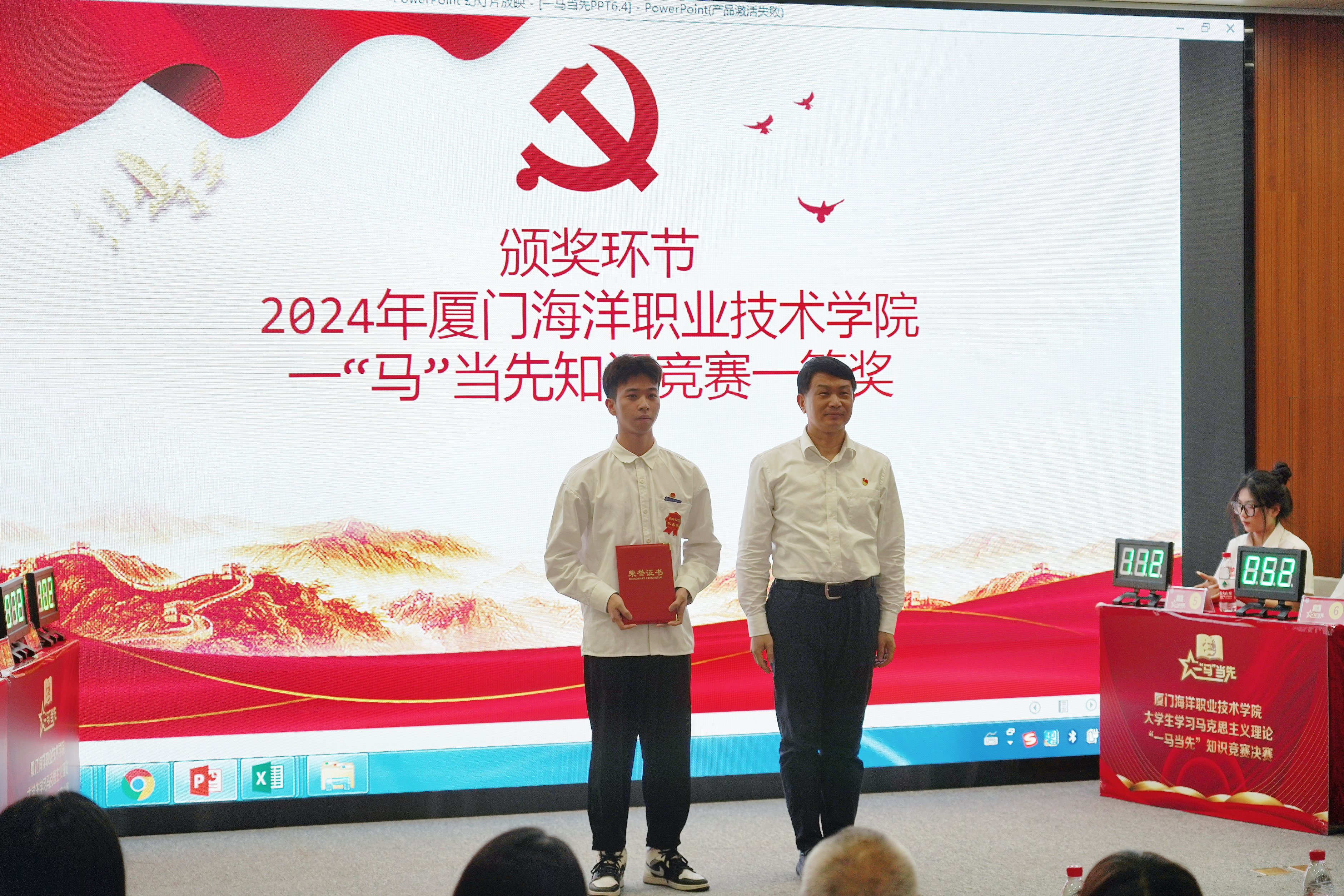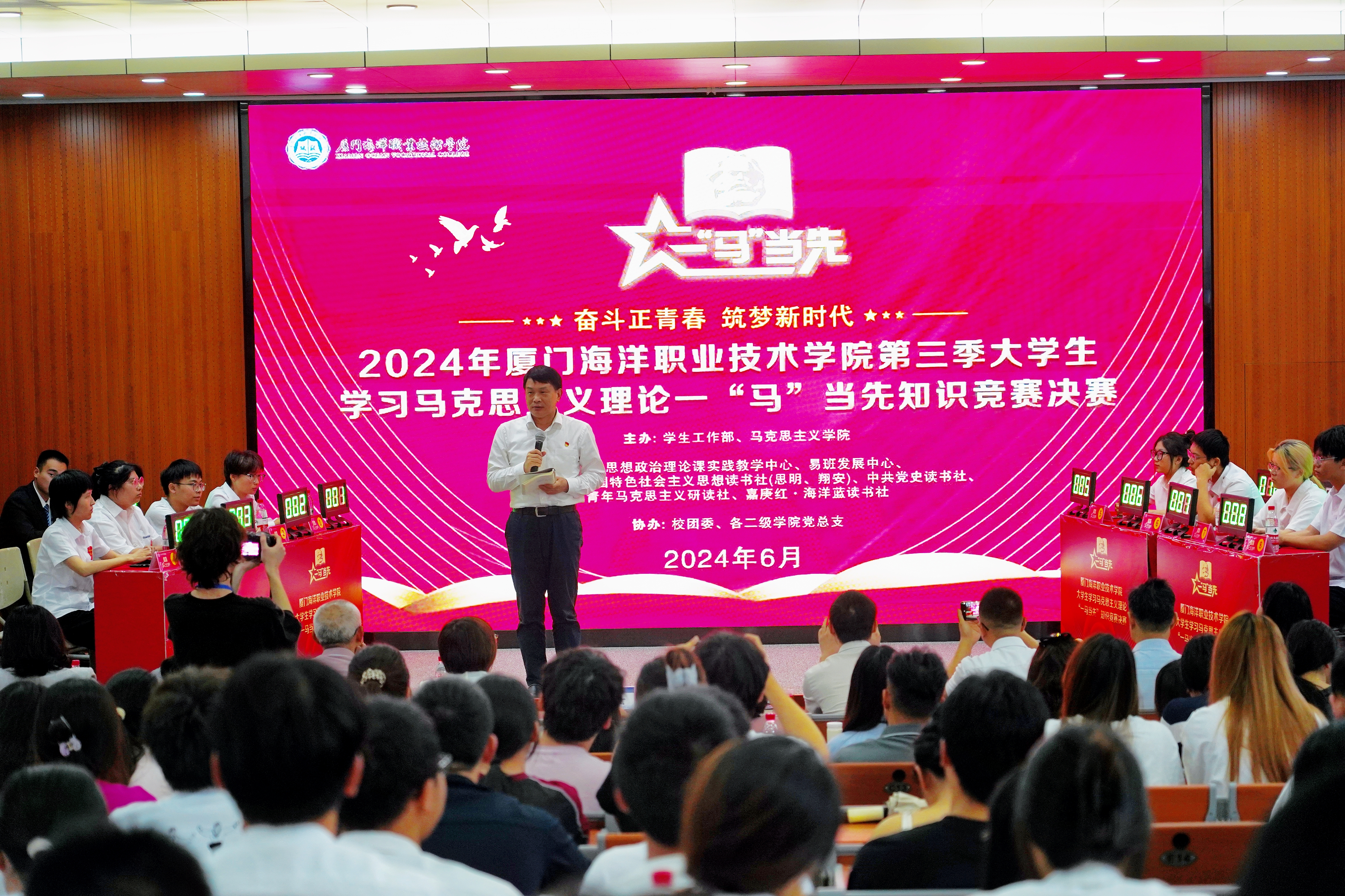 6月4日,由学生工作部、马克思主义学院主办,思想政治理论课实践中心、易班发展中心及各思政理论读书社联合承办的校第三季大学生学习马克思主义理论“一‘马’当先”知识竞赛决赛在翔安校区梯二报告厅成功举行。党委书记陈一端、党委委员、副院长马国玄,学生工作部、宣传部、马克思主义学院以及各二级学院相关负责人出席活动。