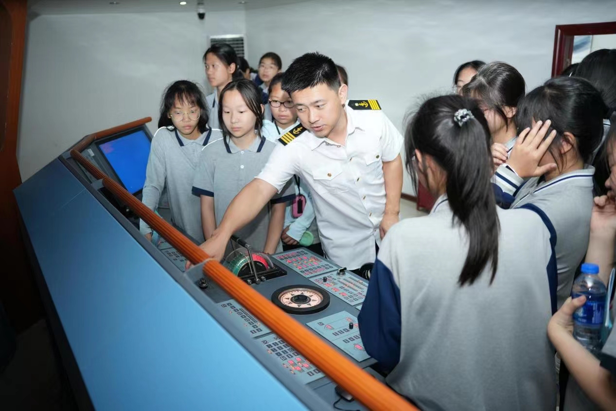在航海模拟驾驶室,参观者可以感受晴天、雨天、雾天等不同环境下的航行体验,了解船舶轮机的工作原理及其操作流程。