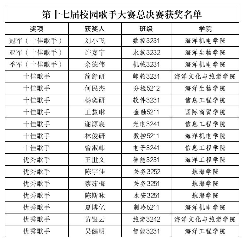 在经过评委老师的综合评定后,11号选手余德伟凭借充满故事感的嗓音与深厚的情感张力,赢得了观众们的欢呼,获得校园歌手赛季军。16号选手许嘉宁的《爱的回归线》情感浓烈,音色饱满,令人耳目一新,最终赢得校园歌手赛亚军。而9号选手刘小飞以一曲舒缓悠长,表演灵动的《就在这瞬间》将气氛推向高潮,荣摘桂冠,斩获冠军。