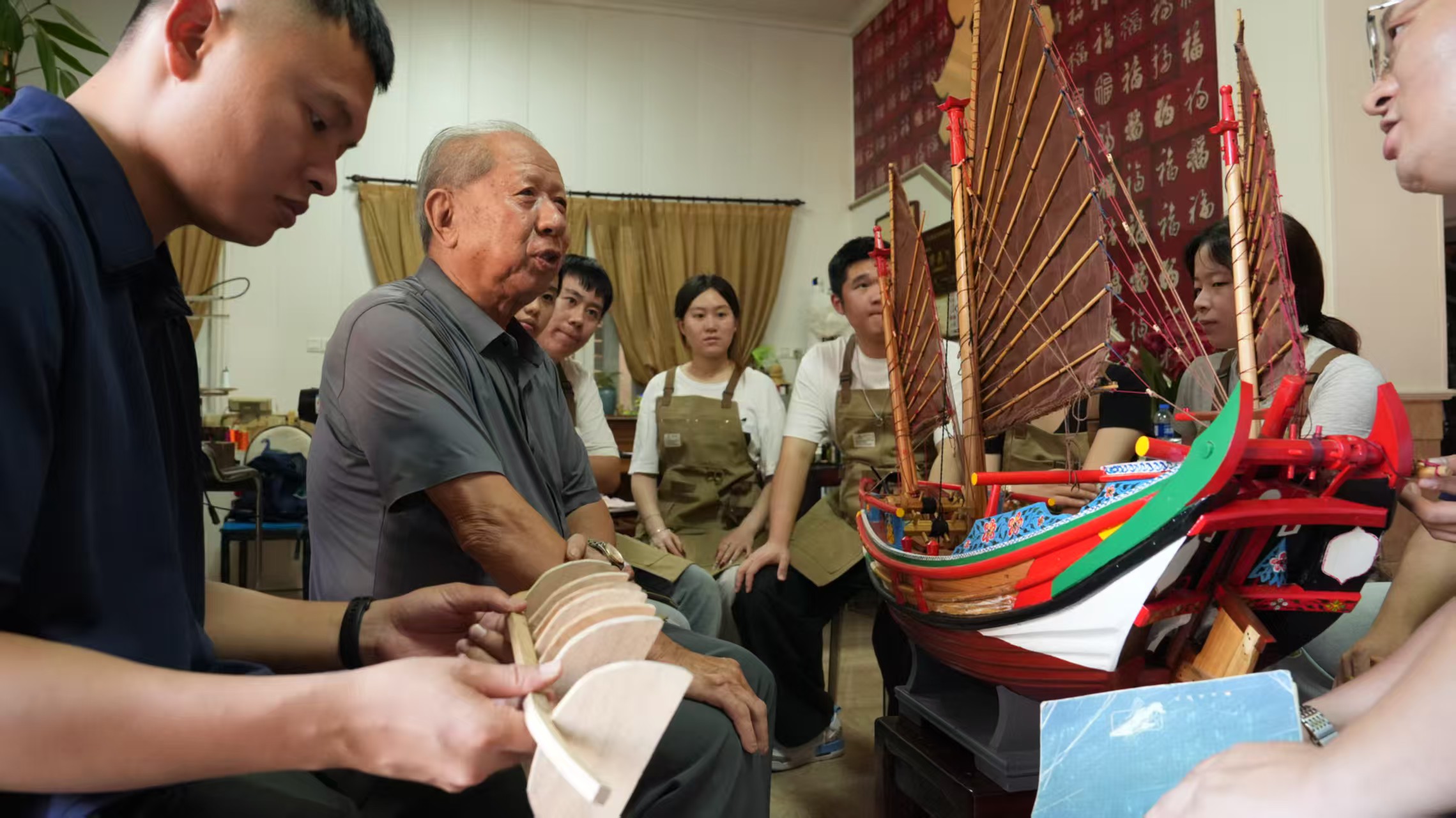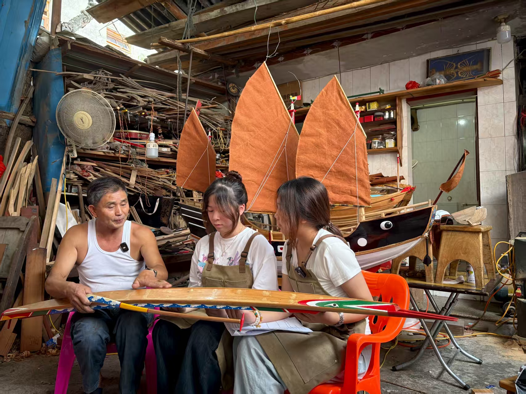 6月28日至7月4日,实践队进入集中调研阶段,按照规划路线,深入20余个调研点记录闽南传统造船技艺。在厦门,走访翔安欧厝、同安丙洲等地,学习杨育锥、陈建民、许福安等师傅的技艺经验;在漳州月港,实践队观摩郑水土、郑海根等师傅的榫卯结构与薯莨染帆工艺;在泉州,团队赴晋江深沪、惠安小岞、泉港峰尾等地,访谈陈著纯、洪玉生、黄文同等20余位传承人,系统记录水密隔舱、船模彩绘、桅杆结构等技艺,完成超300G影像素材采集、20万字口述史录音整理、收录超过100艘船模作品图片;先后登上“马可波罗·浪荡子号”“海丝福船18号”2艘仿古木质真船进行2次船模创新班校外授课。