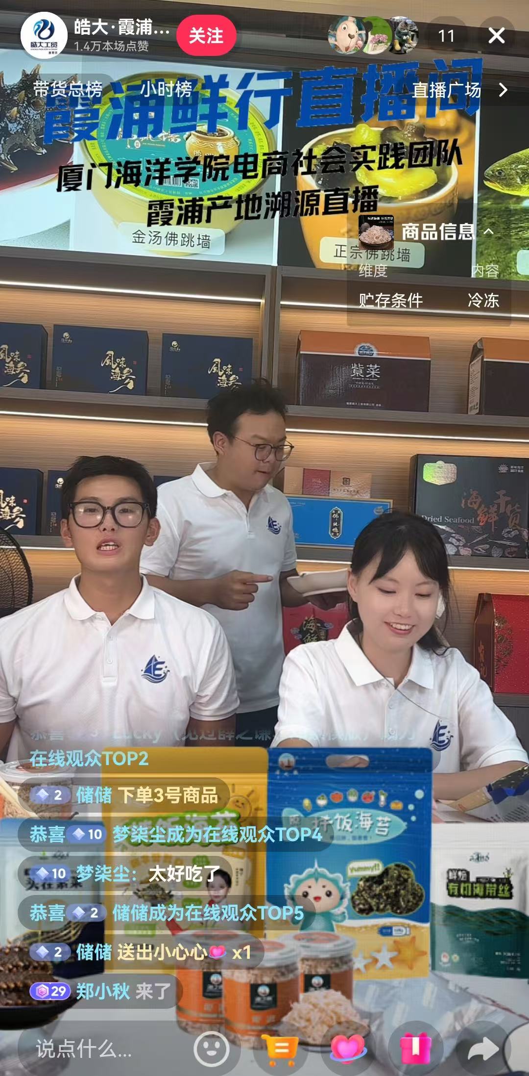 实践队还策划并开展海产品专场直播助农活动。队员们担当主播,热情洋溢地向网友推介霞浦优质海带、紫菜、海参等产品。直播反响热烈,直播GMV为1046.22,曝光人数1908人,进房人数272人,收获2.4万次点赞。实现了从“流量”到“销量”的成功转化,为合作企业带来了直观的经济效益,也充分检验了实践队电商赋能的实际效果,为当地企业开展电商直播提供了可借鉴的范例。