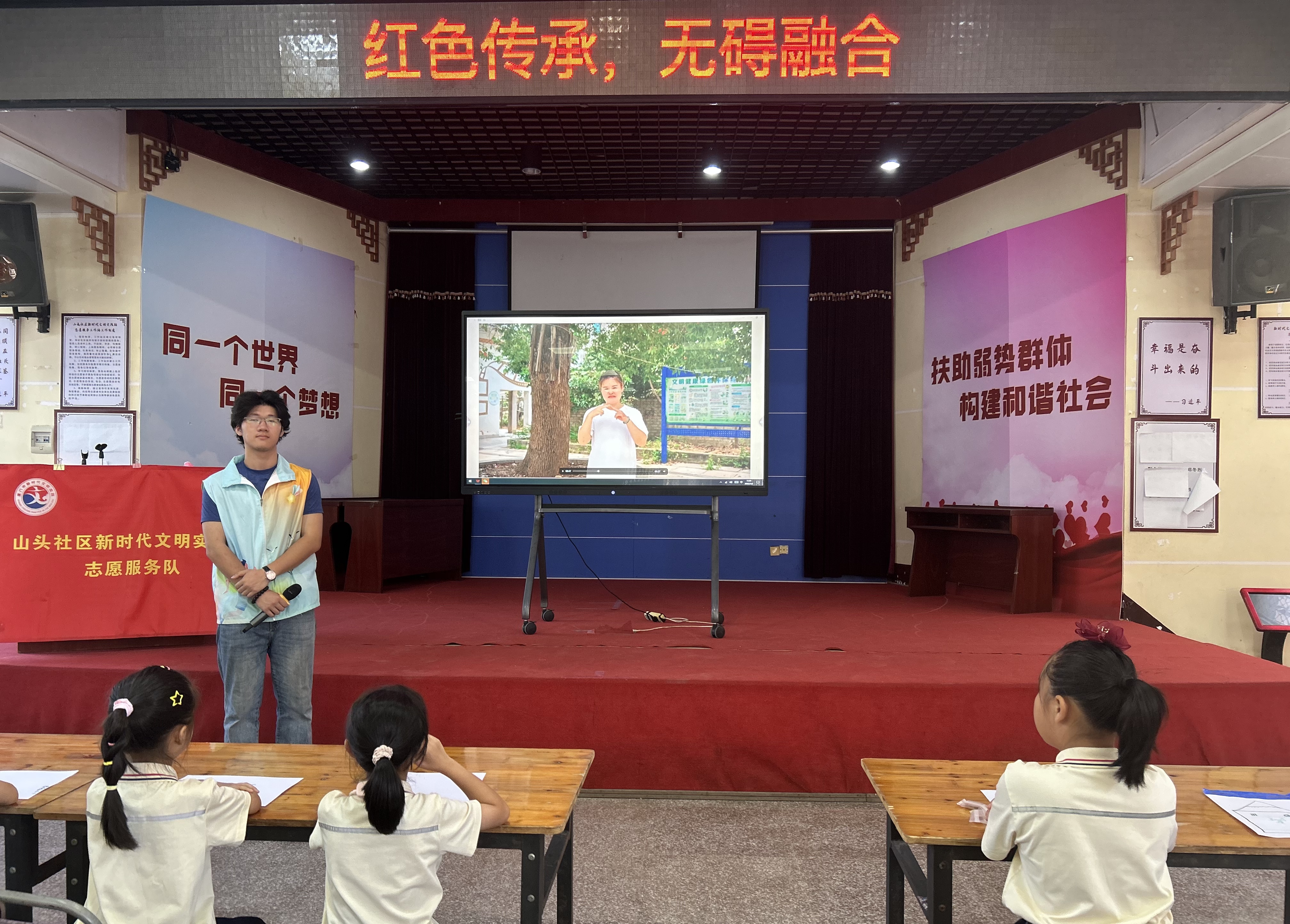 在山头社区新时代文明实践站,实践队举办"红色传承·无碍融合"专题展览,通过展播红色助残影像与助残课堂作品,向下一代传递自强不息的革命精神,播撒包容与传承的种子。