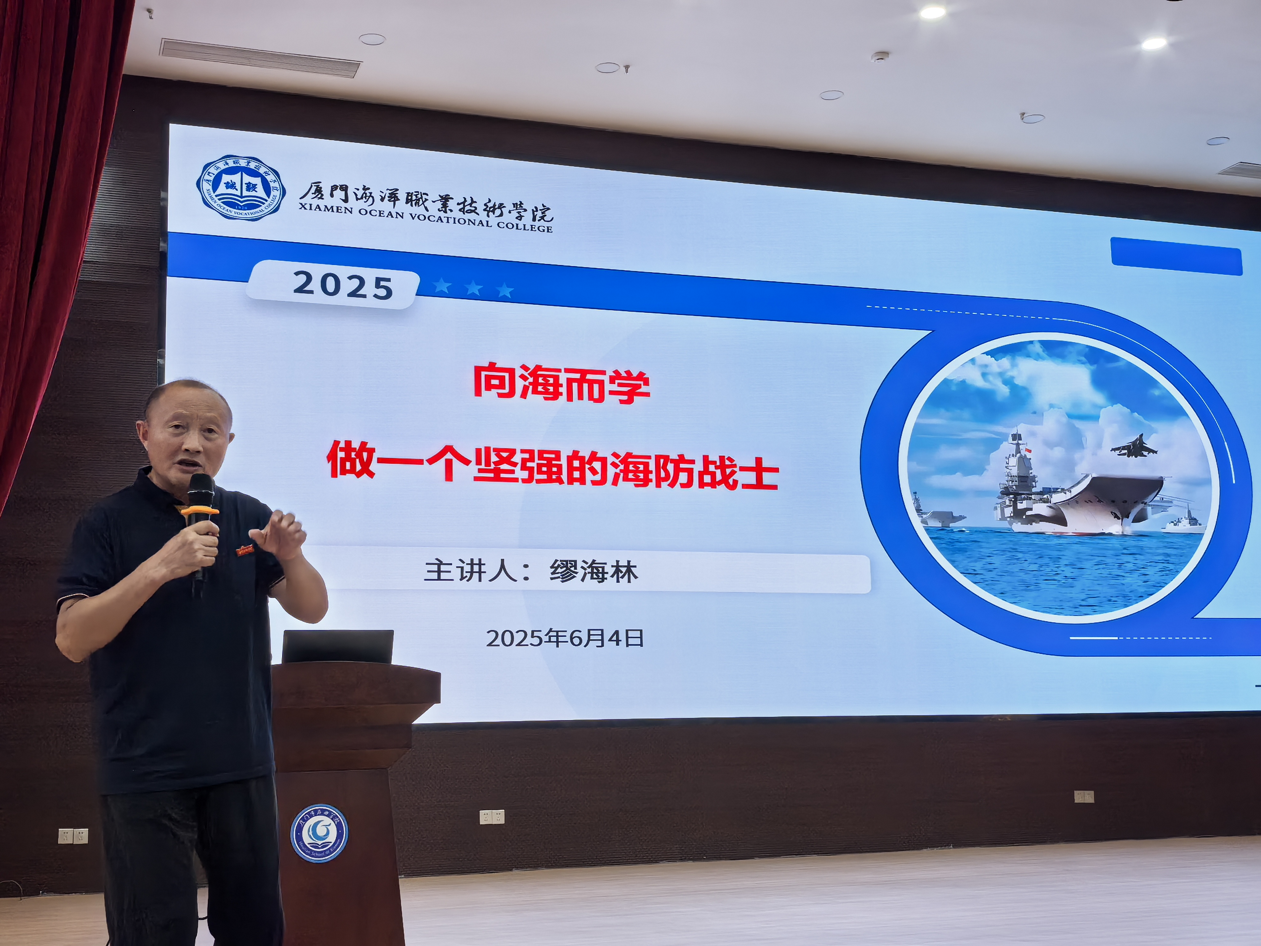 我校公共教育学院正高级工程师缪海林老师开展“向海而学,做一个坚强的海防战士” 主题讲座。他从近代中国海防历史讲起,用生动事实讲述今天的人民海军,在习近平强军思想引领下,人民海军加快转型建设步伐,逐步发展成为一支能够有效维护国家主权、安全、发展利益的海上武装力量。他鼓励学生要爱党、爱国,热爱人民军队,立志做一位坚强的海防战士。