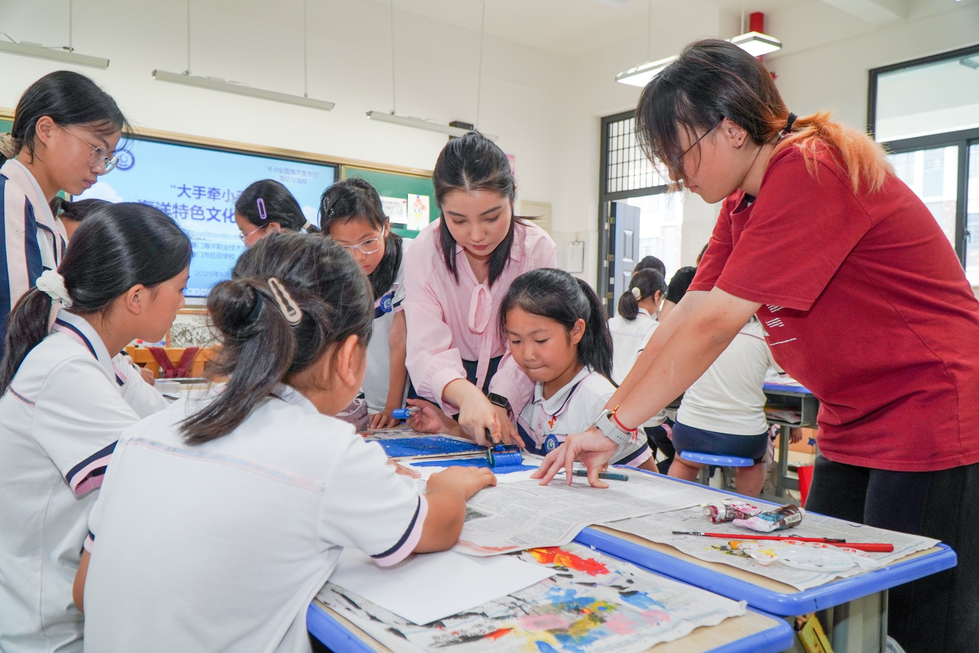 我校公共教育学院张冰倩老师带来的版画艺术课别具一格。她以独特的艺术视角,将 “海洋蓝色文化” 与 “古田会议红色文化” 巧妙融合,引导孩子们在创作中感受蓝色海洋生态之美与红色革命精神之魂的碰撞。