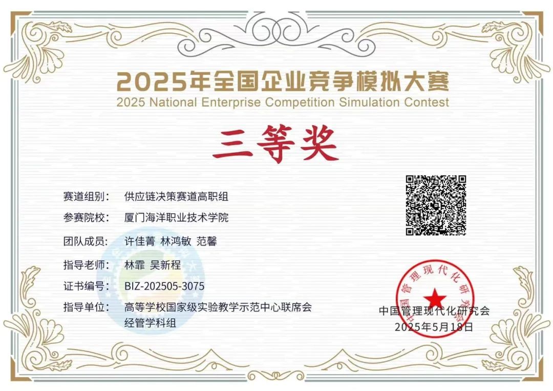 我校团队由许佳菁、林鸿敏、范馨三名同学组成,在老师的悉心指导下,他们积极备赛,深入研究供应链决策相关知识,不断优化策略。在比赛过程中,团队成员充分发挥各自优势,紧密协作,面对复杂多变的市场环境和强劲的竞争对手,冷静分析、果断决策,最终凭借出色的表现斩获全国三等奖。
