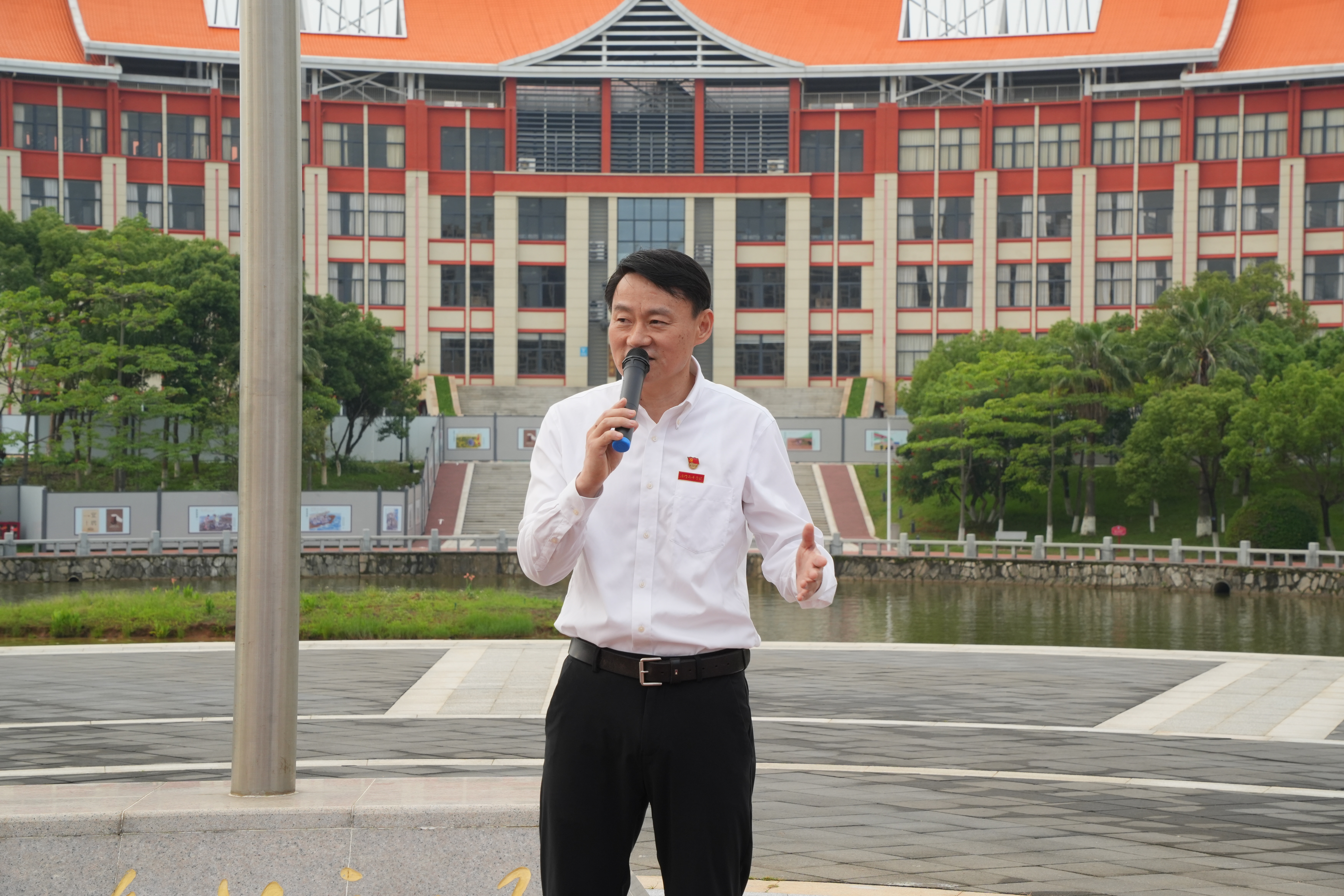 机械5211团支部书记尤铭城在国旗下领读了名篇《爱莲说》,同学们铿锵有力地跟颂,声声廉洁之音伴随五月的晨风飘荡在含章池上。