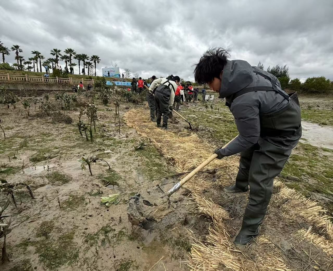 当日上午,与会嘉宾共同前往翔安区下潭尾红树林公园参加种植红树林活动。本次种植的红树林树种为秋茄,其种子在母树果实内完成萌发,成熟后脱离母体插入滩涂淤泥实现“自然定植”,能够有效抵抗潮汐和洪水冲击,具有减缓风浪,调节水流,稳固海堤基床、维护岸线稳定的作用。