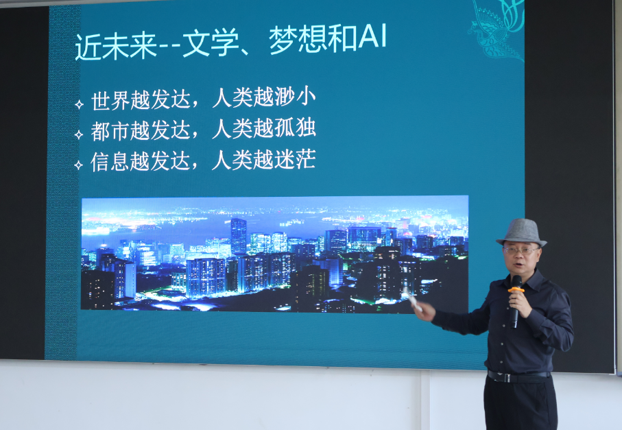 夏炜以《近文学——文学、梦想与AI》为题,从”文学的无用之用便是最大之用“为引,结合相关图片从人类进入人工智能和信息化时代展开。他从不同角度阐释碎片化阅读时代,鼓励同学们多在碎片化时间里沉浸式阅读。