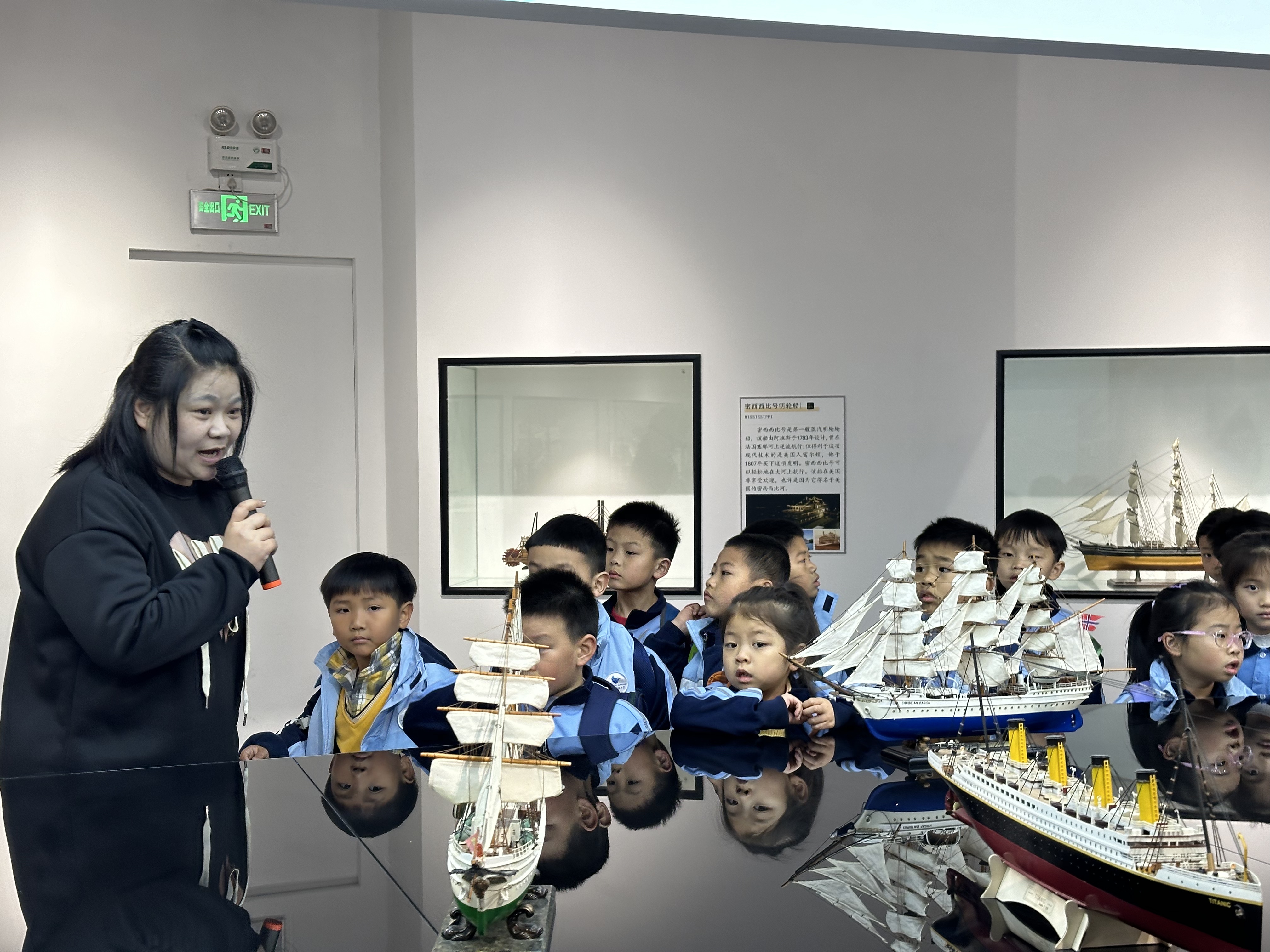 在学院志愿者的引导下,滨海小学的师生们走进我校世界船模文化展览馆。船模馆以“‘船’承百年诚毅,匠起吾辈同心”为主题,陈列有上百艘船模。讲解员老师为滨海小学的师生们讲述船模背后的历史故事,介绍了人类航海事业的辉煌历程。这不仅让孩子们增长了知识,还激发了他们对历史和海洋的兴趣。