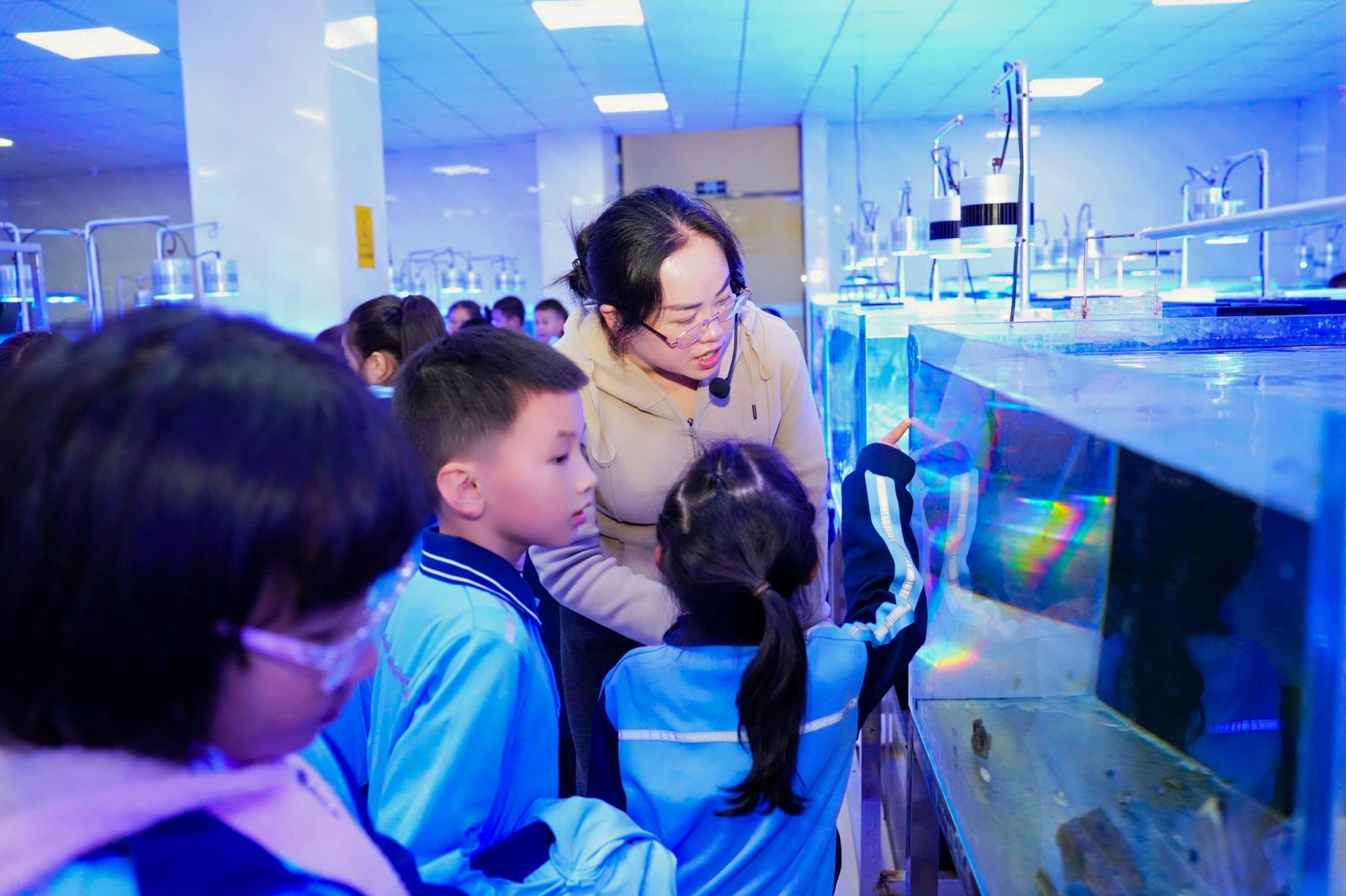 在珍稀海洋生物繁育研究中心,专业老师带领孩子们近距离欣赏了五颜六色、形态各异的活体珊瑚。孩子们兴奋不已,纷纷表示这是他们第一次见到如此丰富的珊瑚种类,感到大开眼界。通过生动的讲解,孩子们深入了解了珊瑚的生长周期、培育条件及其在海洋生态系统中的重要作用。