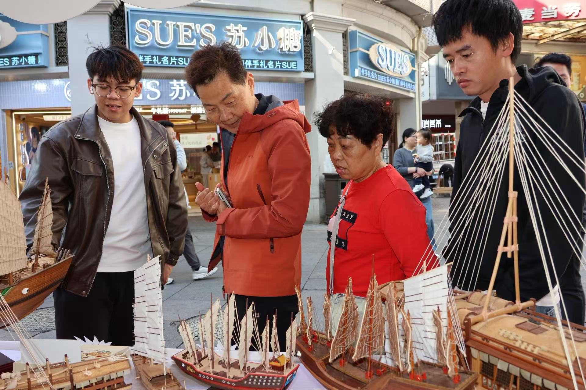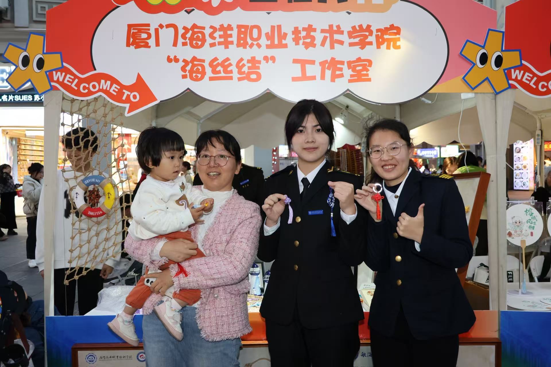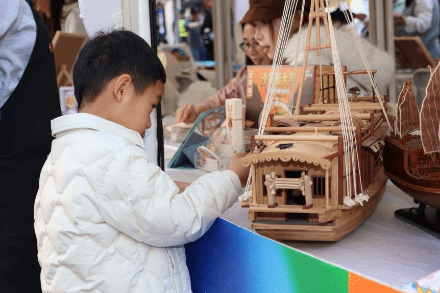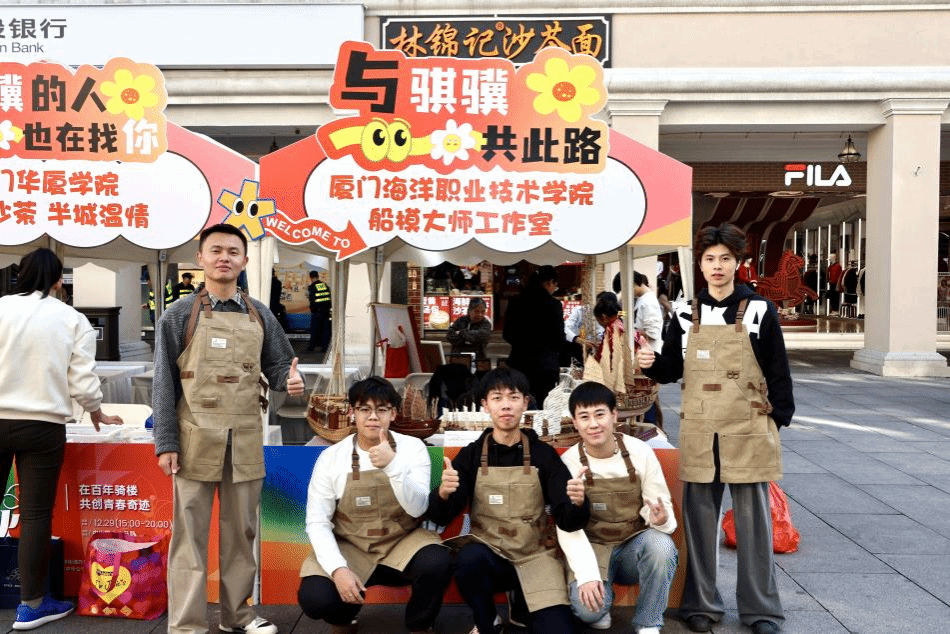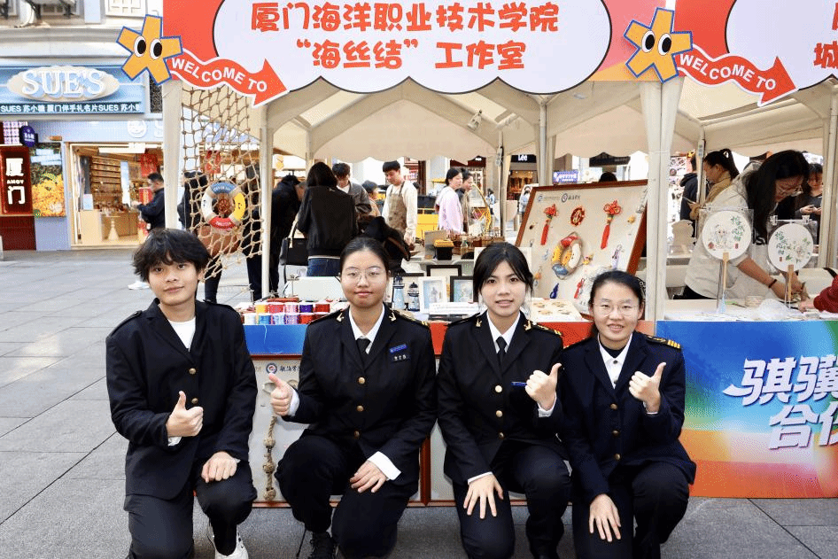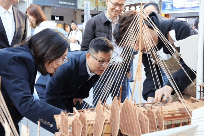 活动现场,我校航海学院船模大师工作室与“海丝结”工作室携手布展,呈现了精美的非遗船模与创意绳结文创作品。木质船模承载着海洋记忆,手工绳结编织着海上丝路的故事,在繁华街区中生动展现传统工艺的当代魅力。展位前游人络绎不绝,或驻足细赏,或交流询问,在赞叹工匠精神的同时,也深切感受到传统技艺与现代生活融合的活力。
