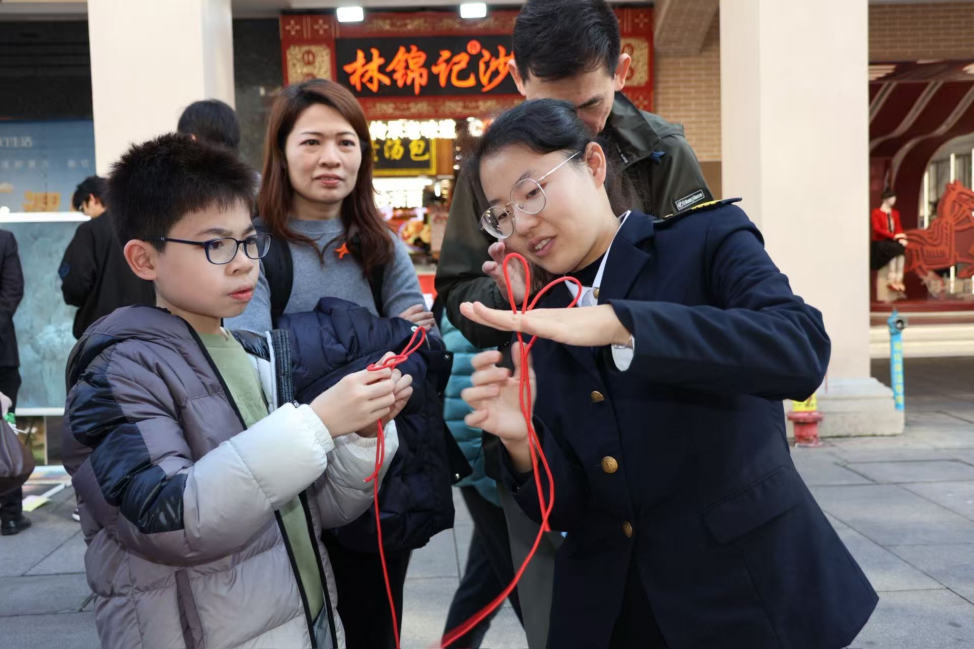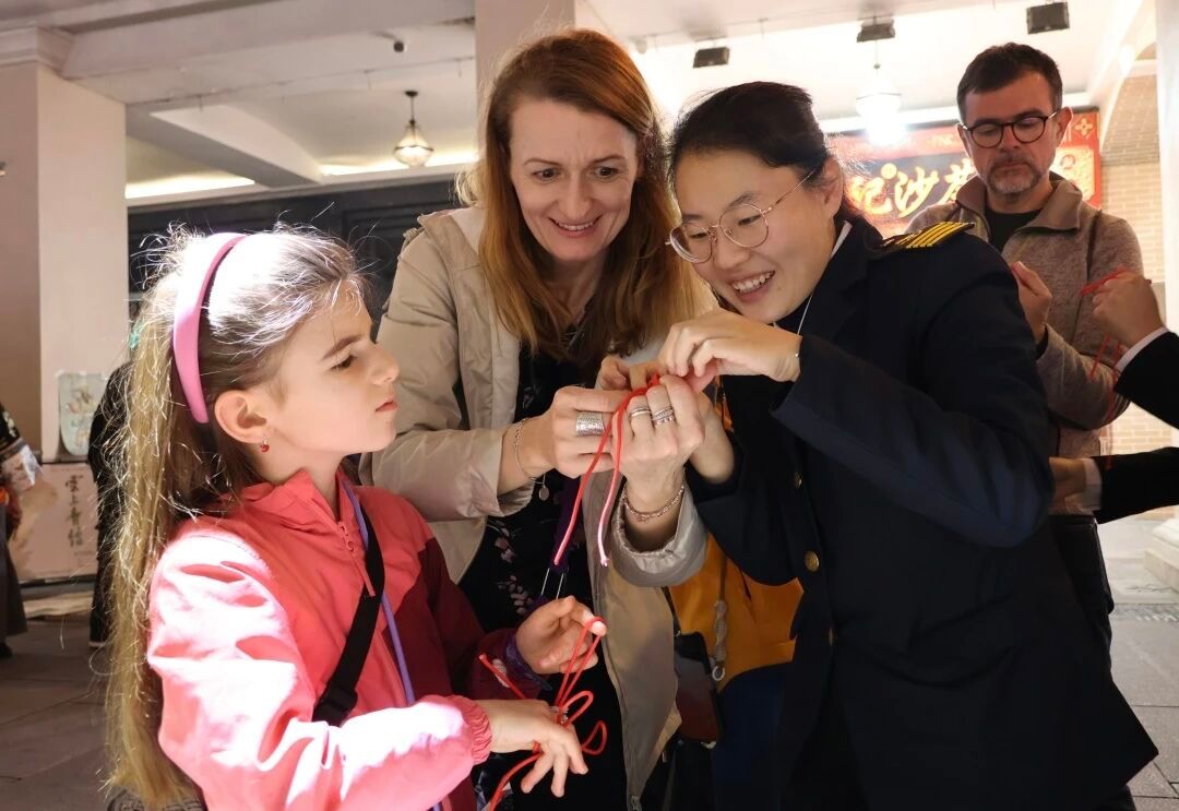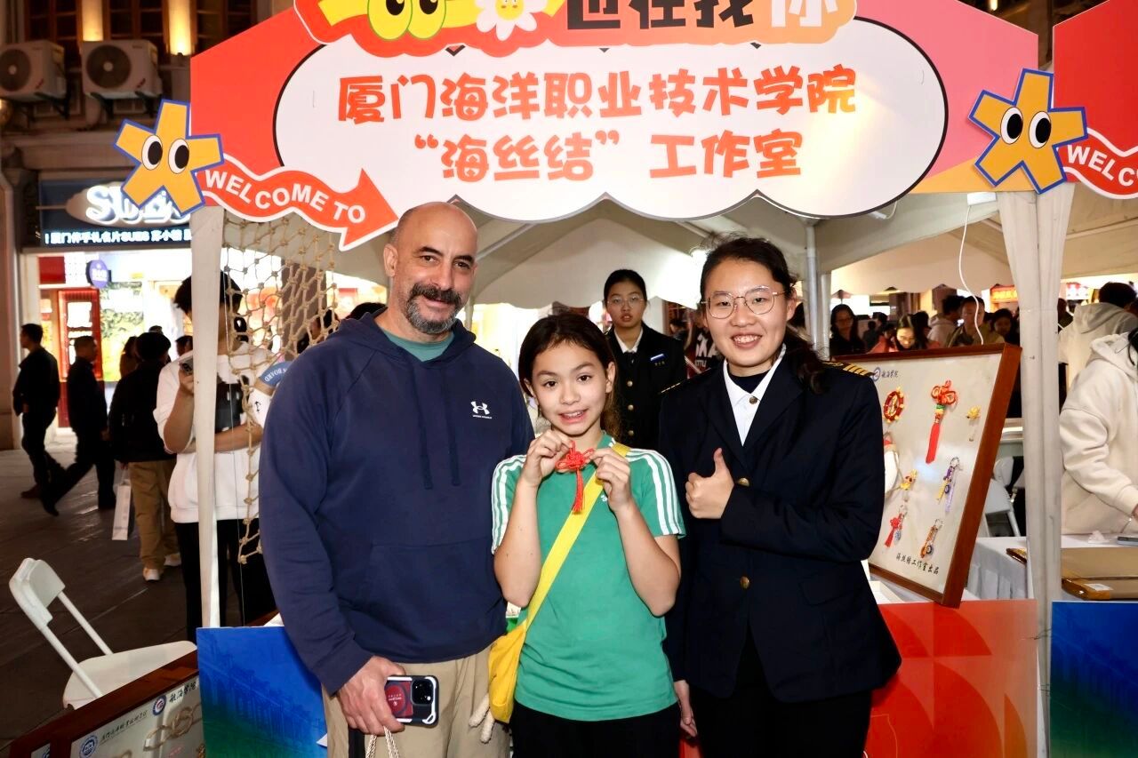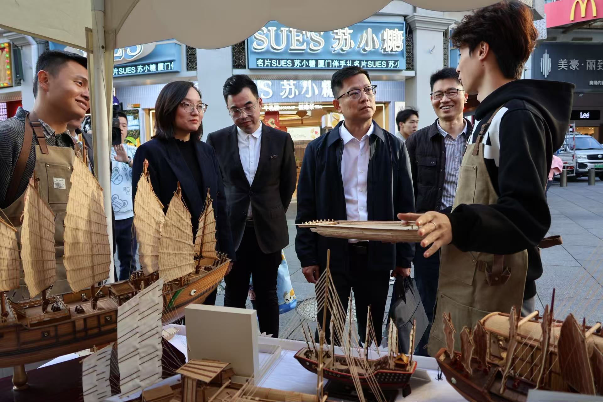 活动现场,我校航海学院船模大师工作室与“海丝结”工作室携手布展,呈现了精美的非遗船模与创意绳结文创作品。木质船模承载着海洋记忆,手工绳结编织着海上丝路的故事,在繁华街区中生动展现传统工艺的当代魅力。展位前游人络绎不绝,或驻足细赏,或交流询问,在赞叹工匠精神的同时,也深切感受到传统技艺与现代生活融合的活力。