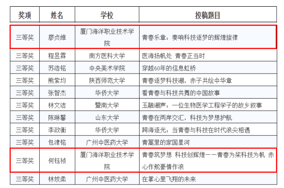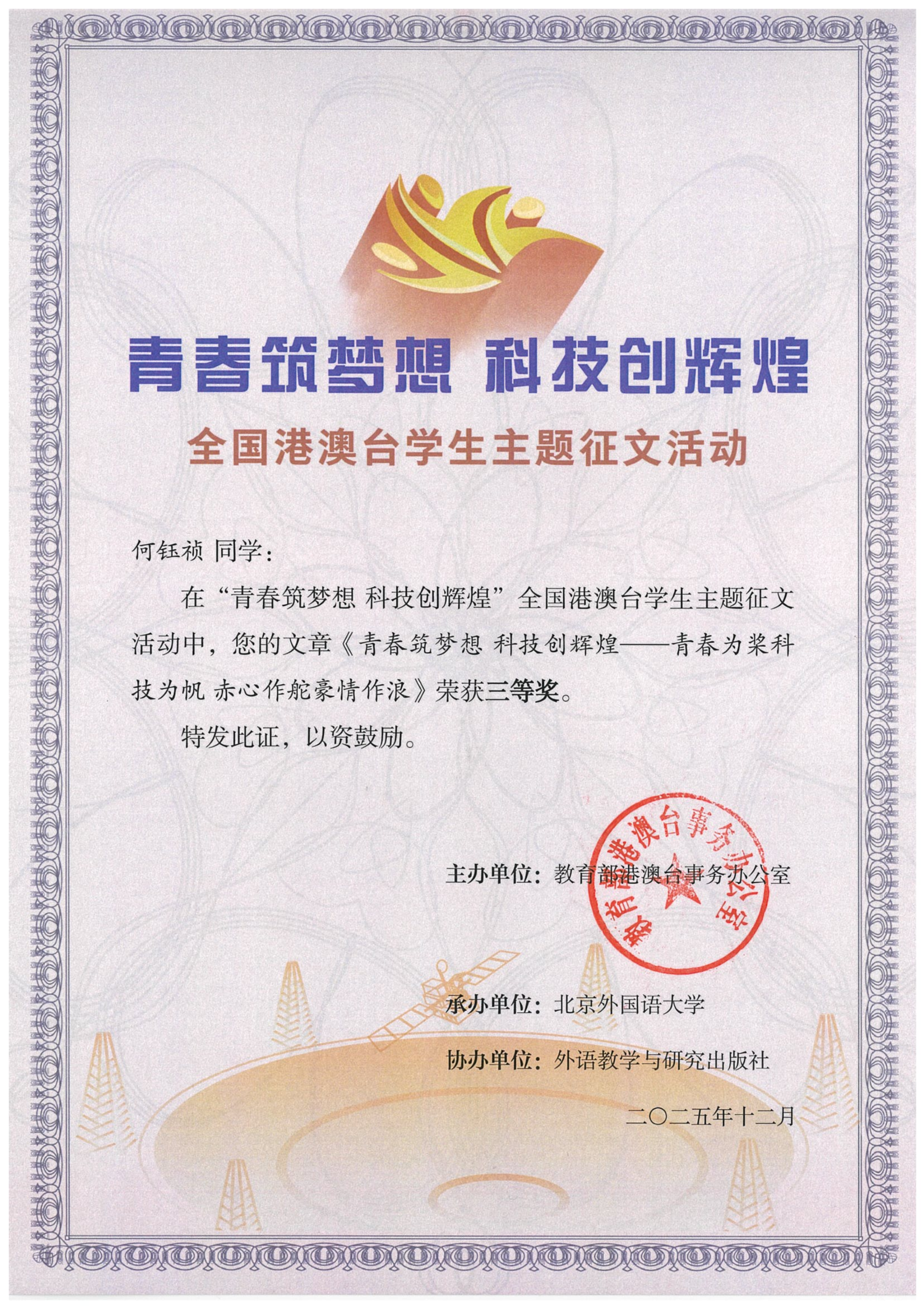 近日,由教育部港澳台事务办公室主办的“青春筑梦想 科技创辉煌”港澳台学生主题征文活动获奖名单正式公布。我校林能兴老师指导的何钰祯、廖贞维两位同学凭借扎实的文字功底与深刻的主题表达脱颖而出,双双荣获三等奖。