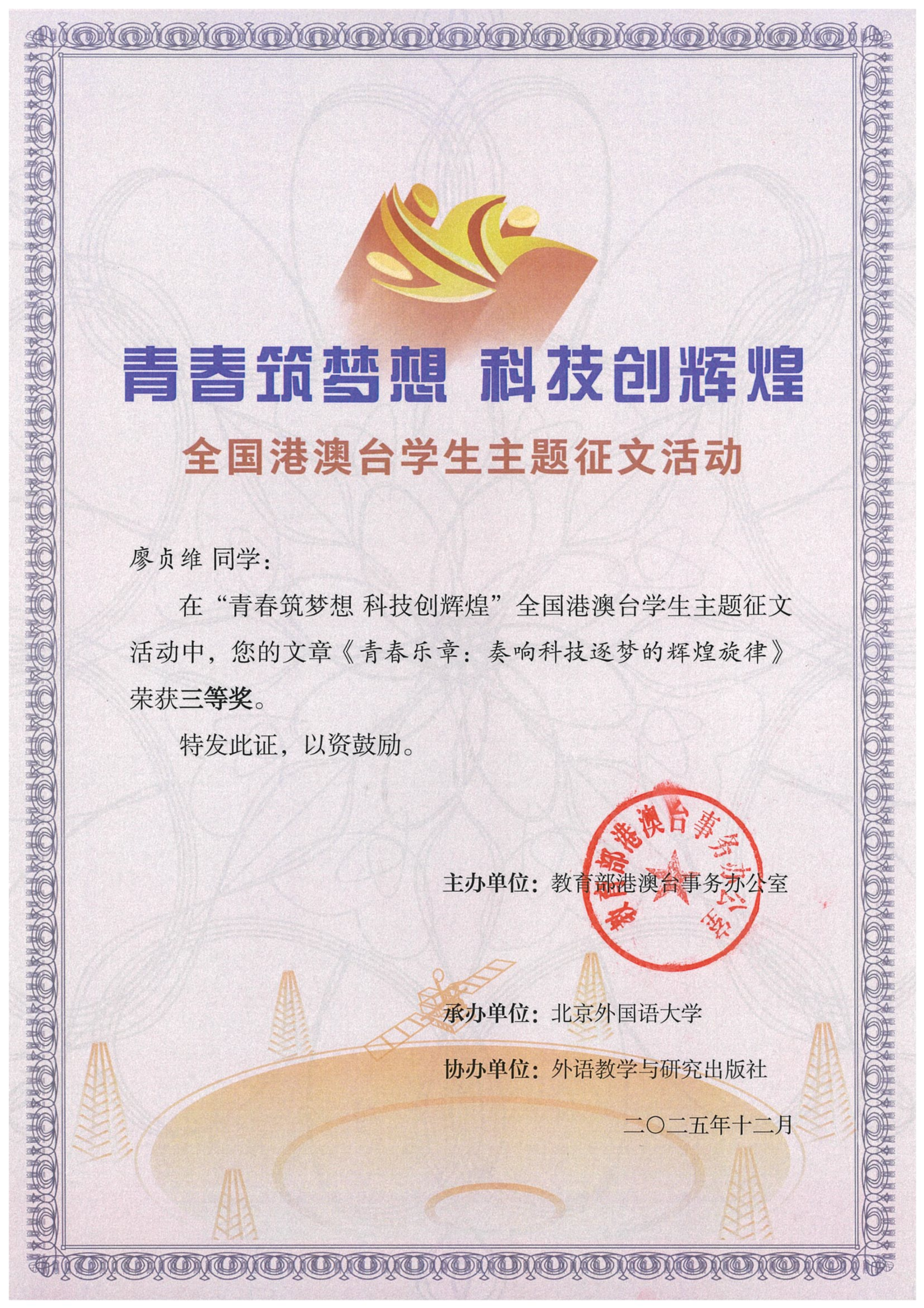 何钰祯同学以《青春筑梦想 科技创辉煌——青春为桨科技为帆 赤心作舵豪情作浪》为题,将青春志向与科技发展相结合,用生动笔触描绘新时代青年逐梦科技、报效祖国的昂扬姿态;廖贞维同学的作品《青春乐章:奏响科技逐梦的辉煌旋律》,则以诗意表达奏响科技与青春的共鸣,传递对祖国大陆与港澳台融合发展的美好期许与青年一代的创新热情。“能够参与此次活动并获奖,是一份认可更是一份激励。”谈及获奖感受,两位同学表示“创作过程中,我们更真切地感受到祖国科技发展的蓬勃生机,也深刻体会到中国同胞血浓于水的情谊。未来,我们会继续以文字为桥,以行动为证,用青春力量为祖国繁荣发展添砖加瓦。”