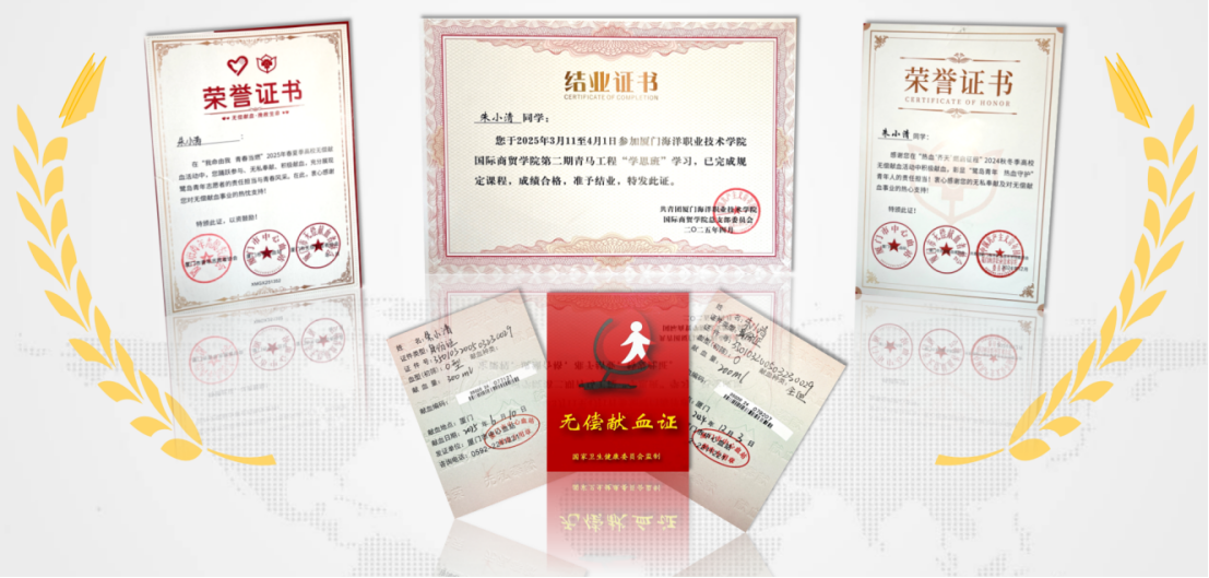 “青年者,当坚守初心,勇担使命。”作为入党积极分子,朱小清始终秉持坚定的理想信念与无私的奉献精神。她积极要求思想上进,2025年3月至4月参加国际商贸学院第二期青马工程“学思班”学习;她主动践行社会责任,累计献血量超500ml,用热血传递爱心。