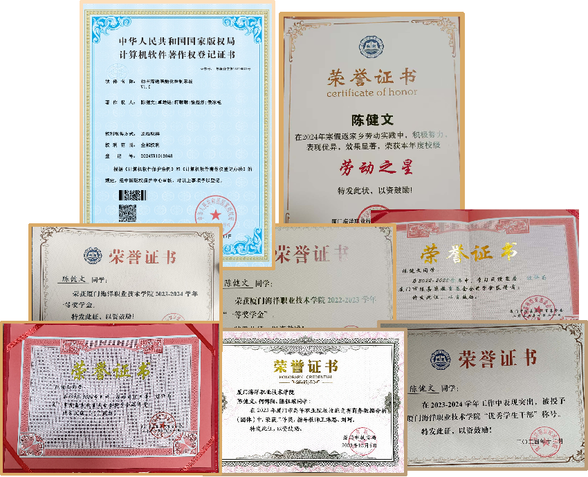 陈健文勤于思考,敢于创新,他多次参加各类竞赛,获第十三届“挑战杯”福建省大学生创业计划竞赛银奖、厦门市商务数据分析竞赛三等奖、校36小时创业训练大赛一等奖、校数学极限挑战赛三等奖等多项荣誉。