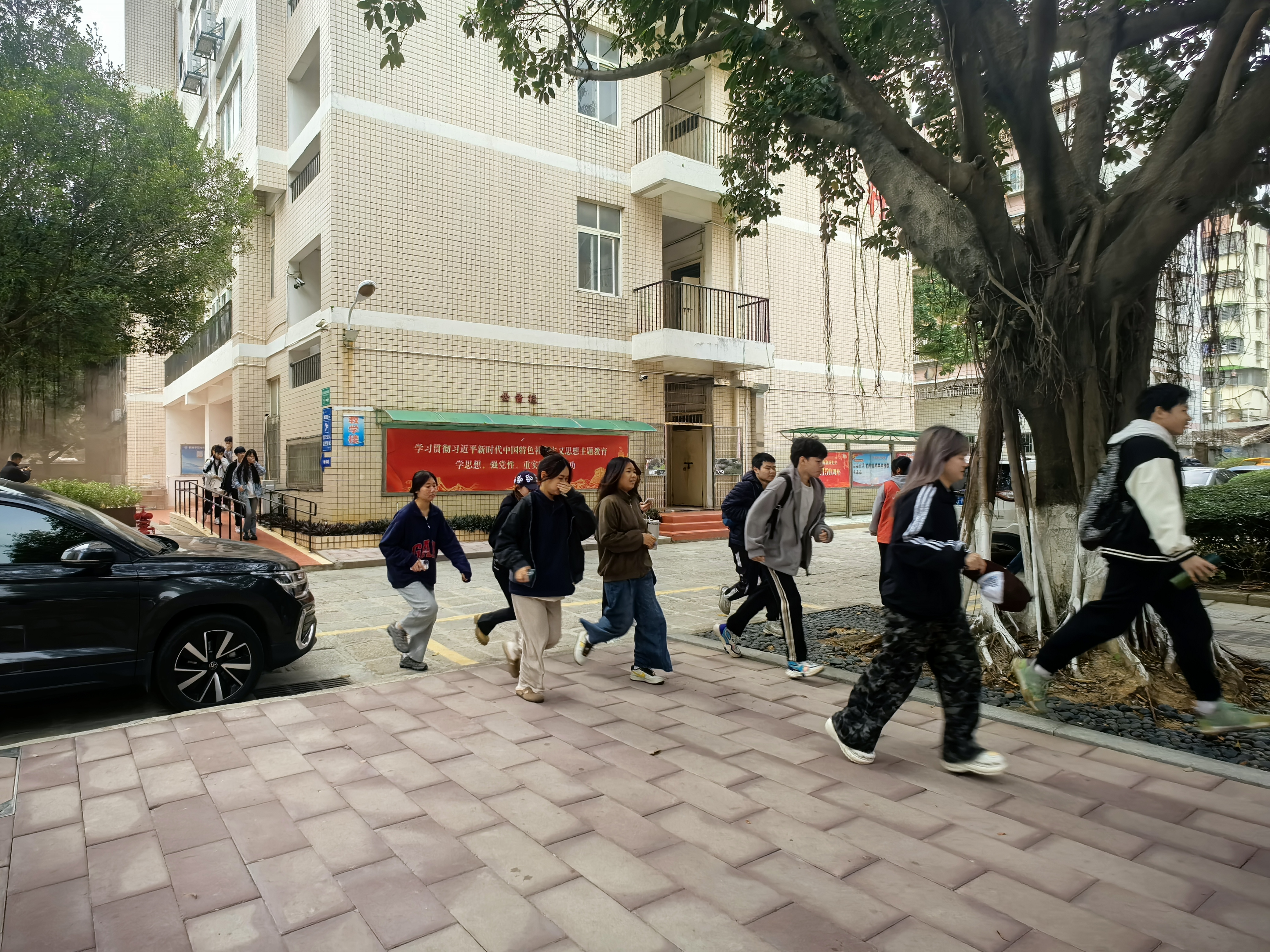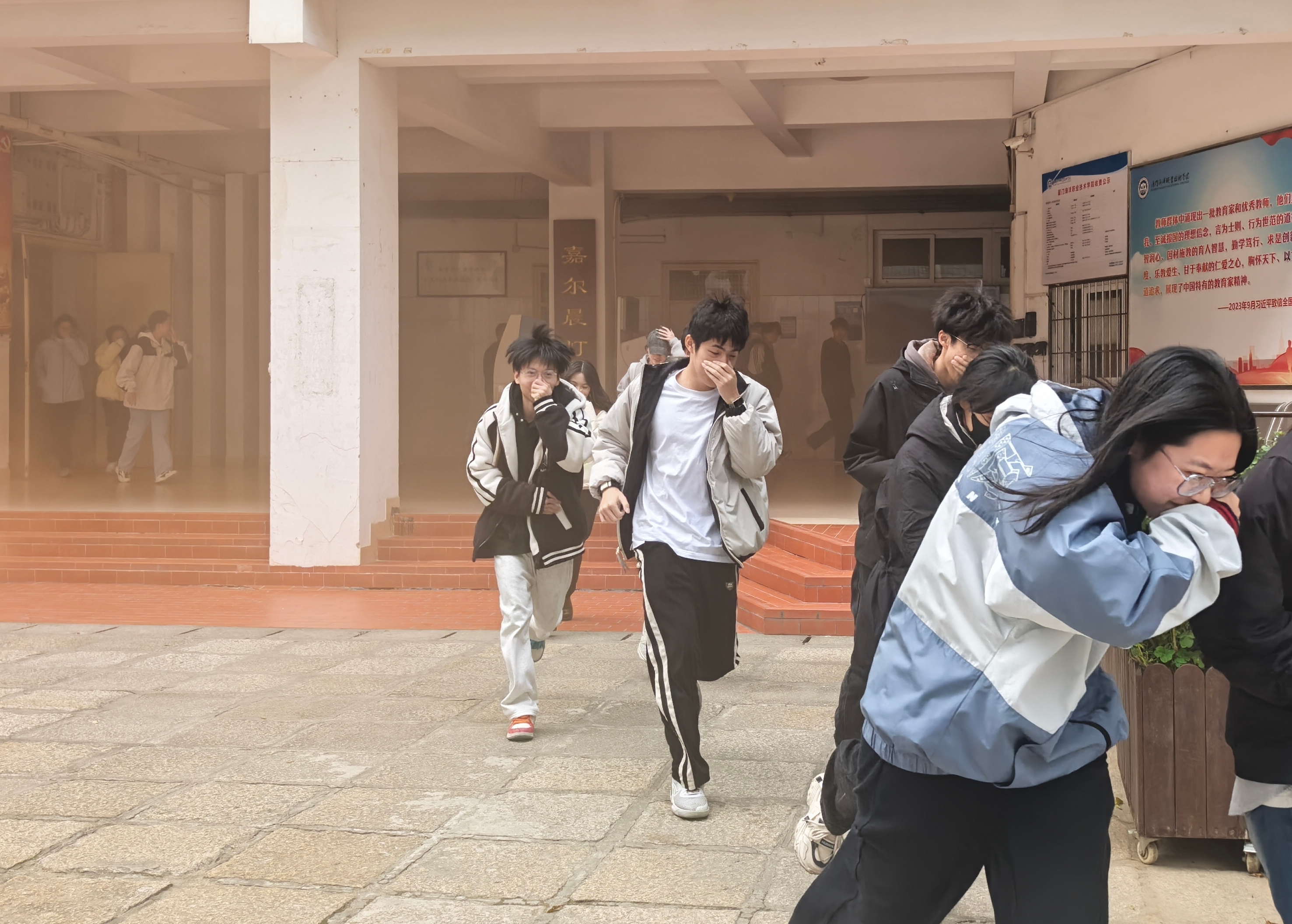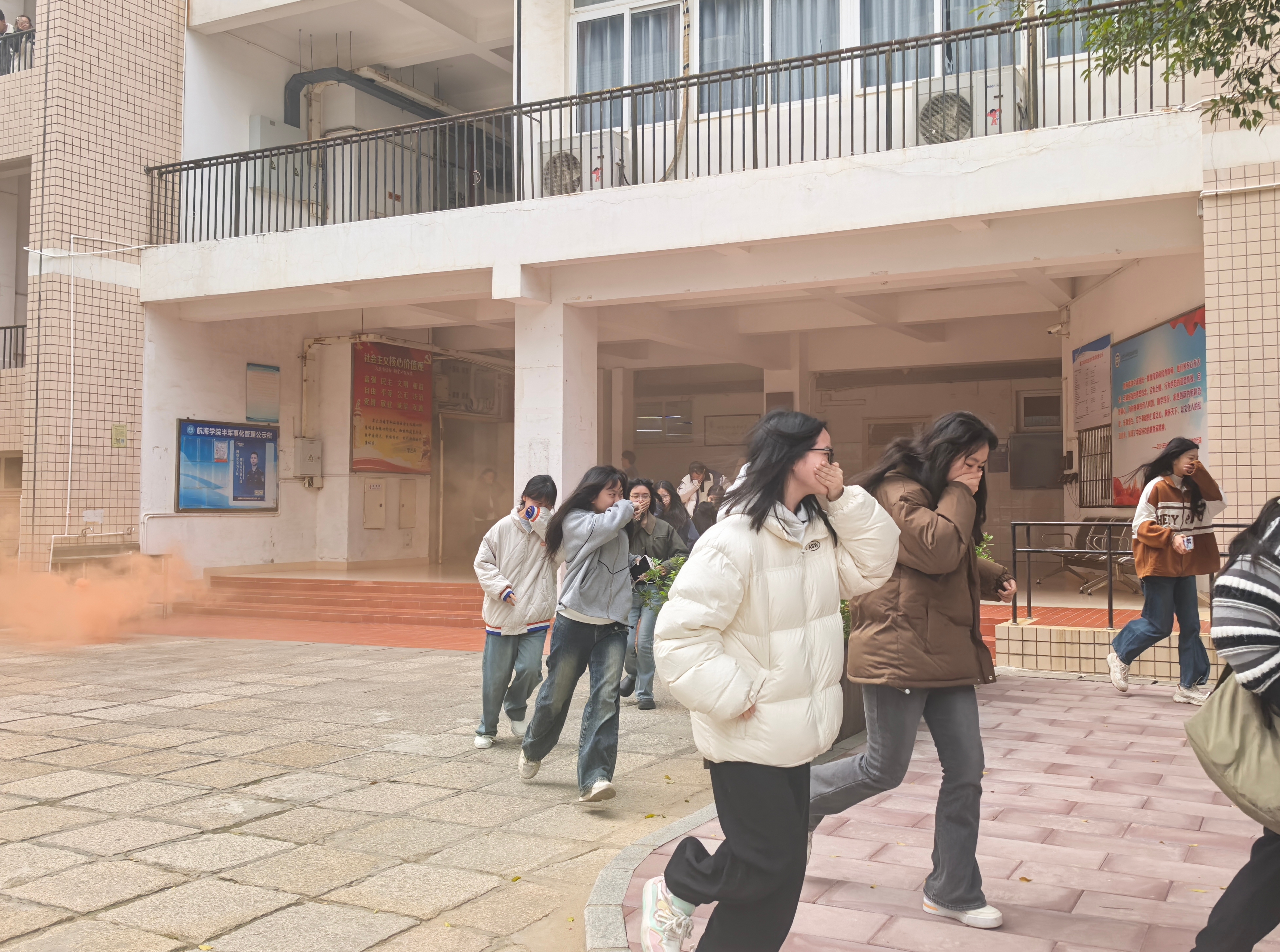 警报声响起,逃生演练正式开始。教学楼区域的同学们在课任老师和辅导员的组织下,迅速捂住口鼻、弯腰小跑,根据现场疏散标志快速撤离,有序向操场的安全区域疏散。集合后,各班级相关负责人立刻清点人数,报告总指挥,确保所有人员已安全撤离。