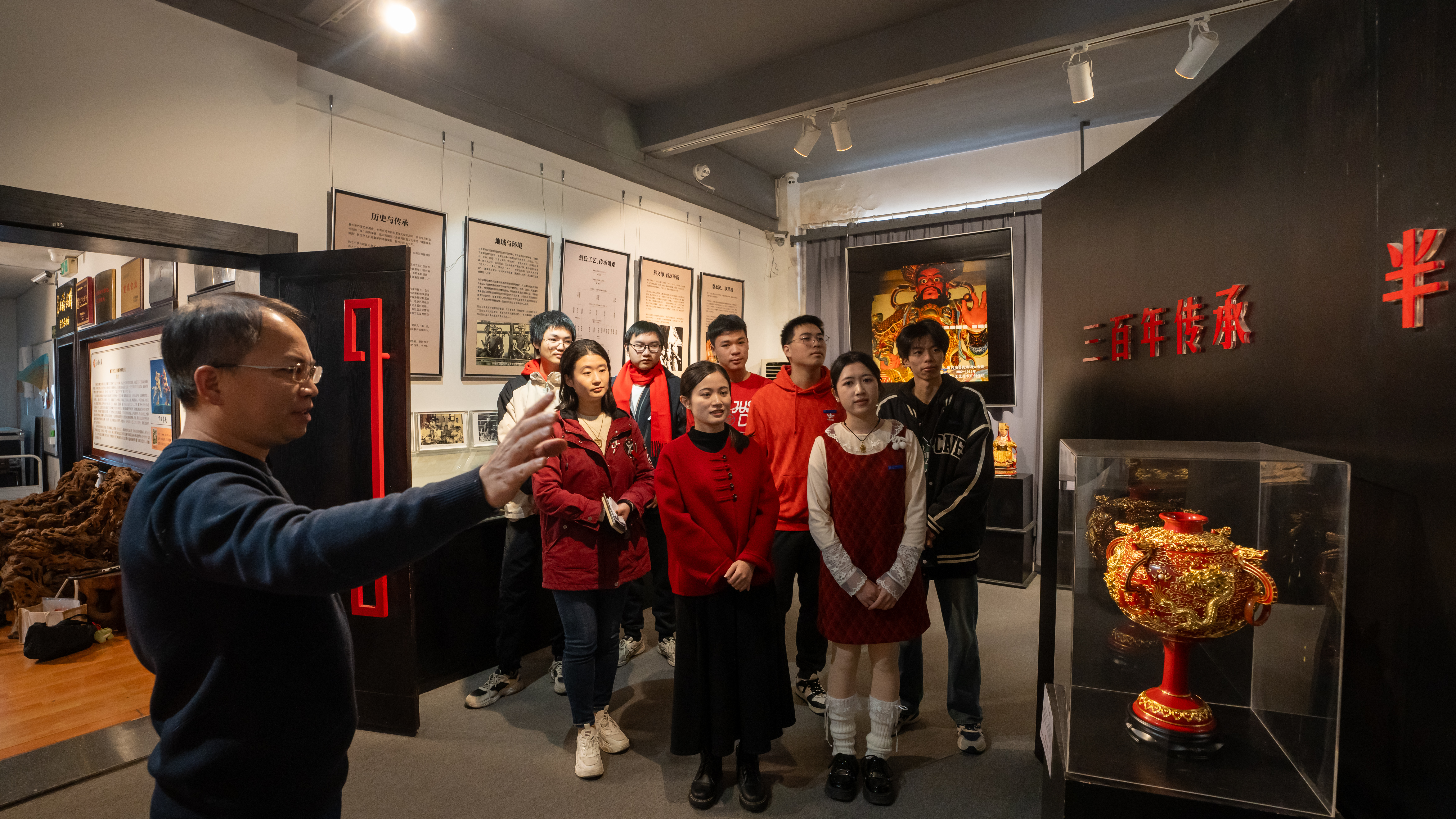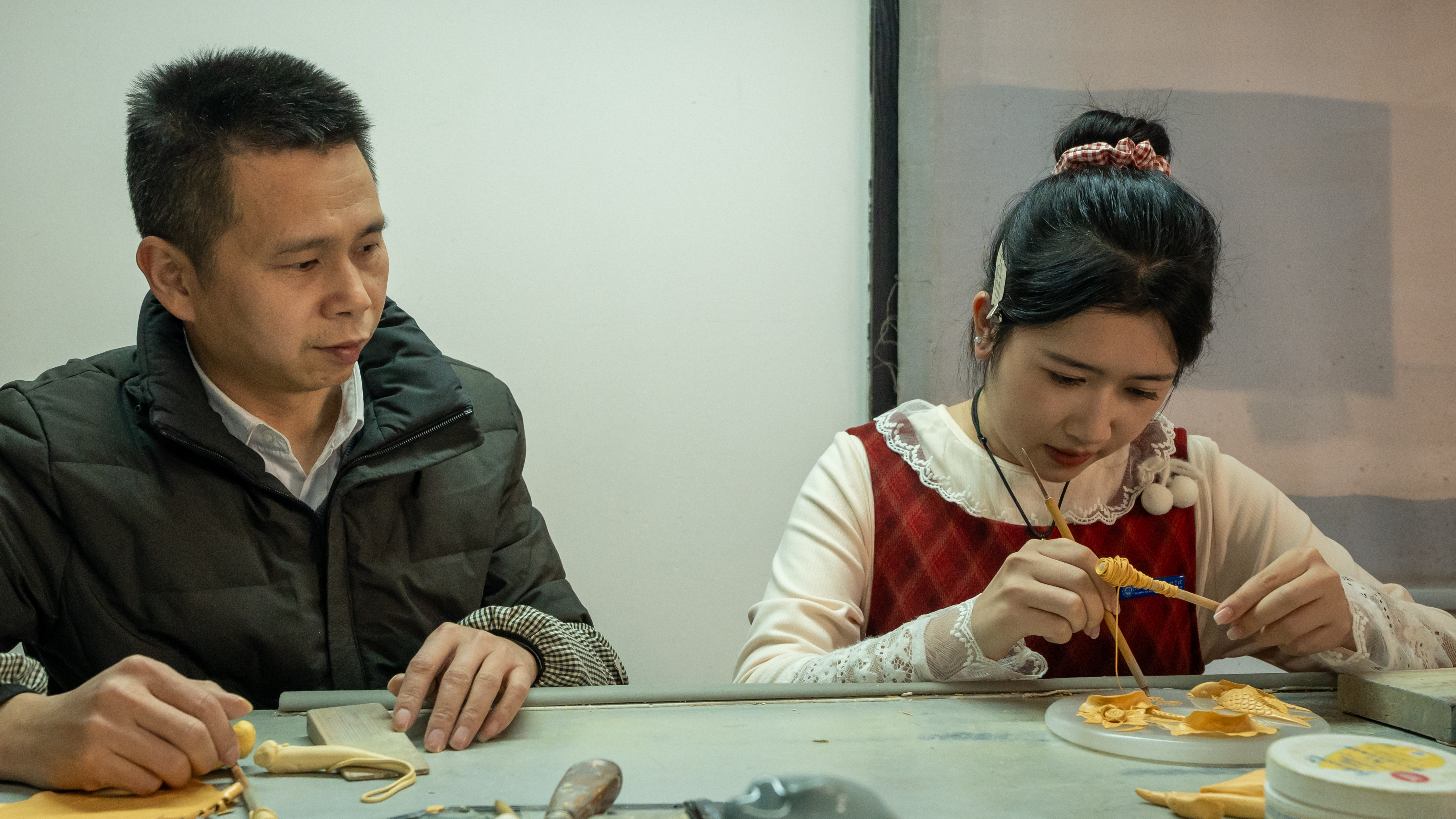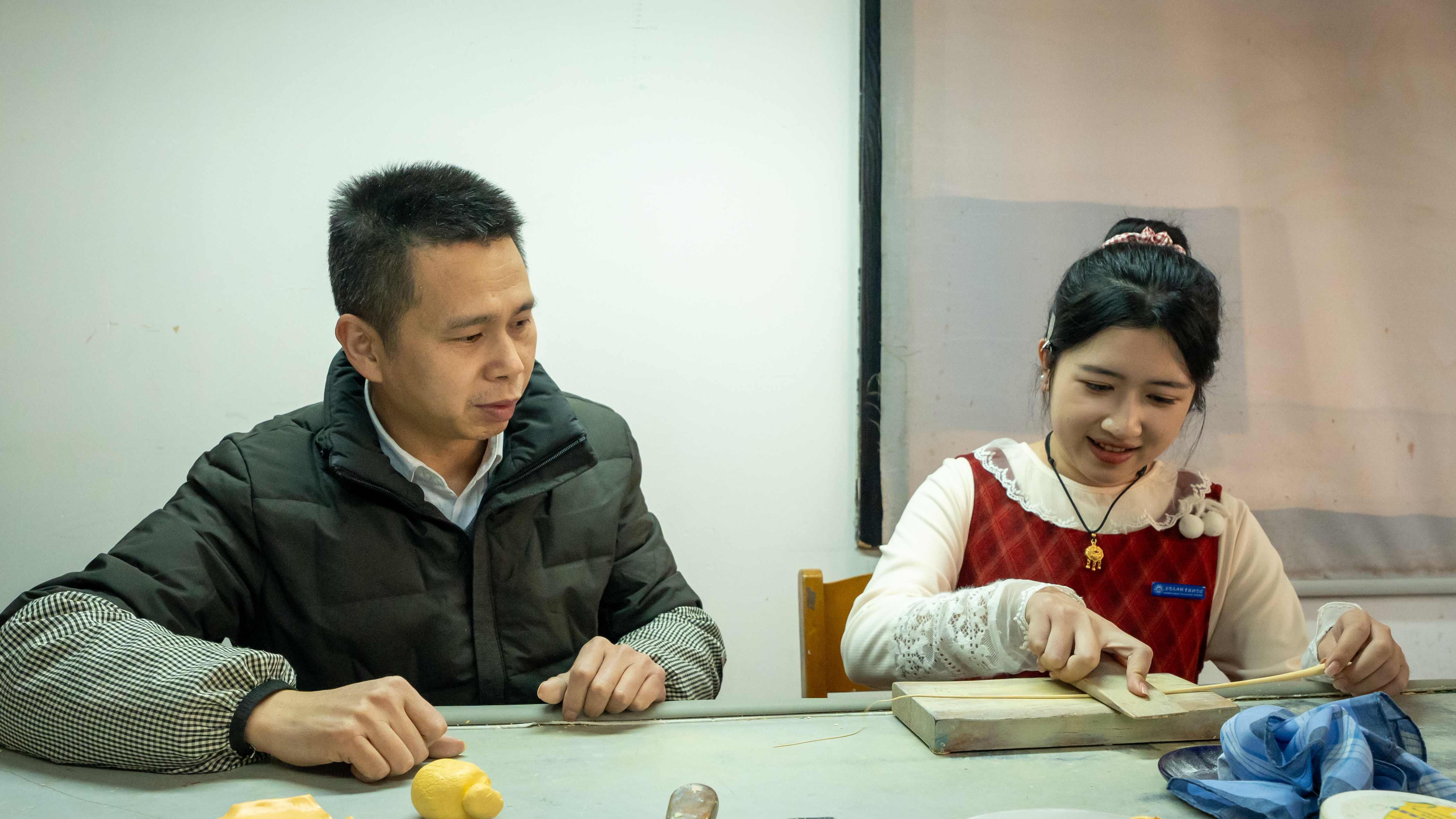 在活动现场,实践队认真聆听传承人的讲解,亲身体验漆线雕作品的制作过程。从雕塑到粉底,从漆线装饰到妆金填彩,做工精细宛如绣花。灵手巧做,一件件富有生命力的艺术品在轻挑慢捻中孕育而生。