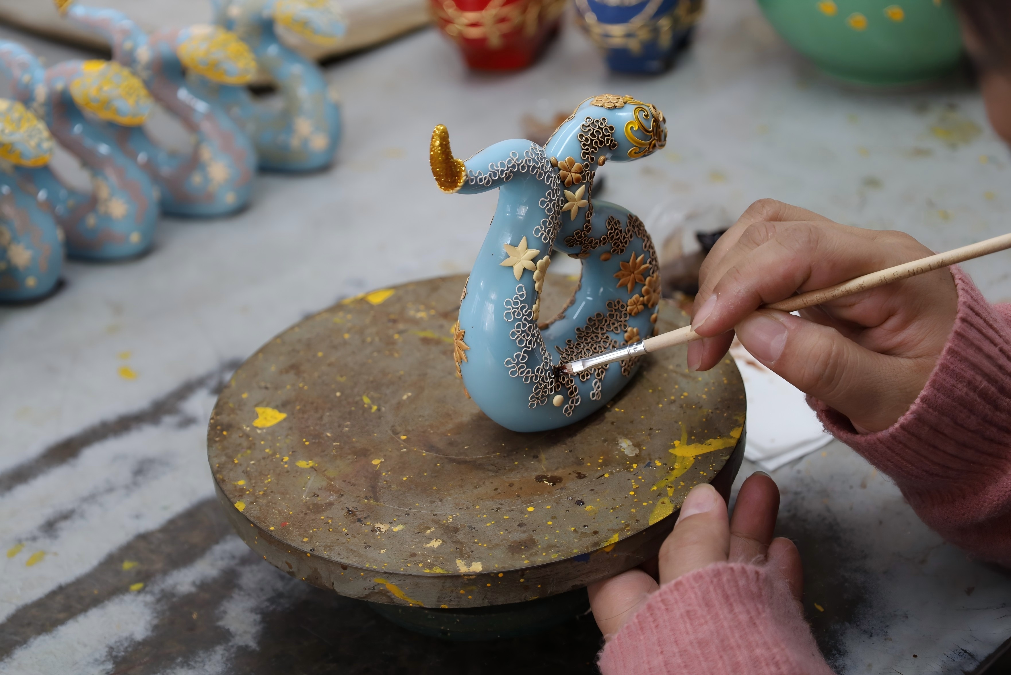 非遗春节,文化新生。作为闽南独有的传统技艺,漆线雕技艺走进校园、走进社区,参加非遗展演,赴新春之约。蔡氏漆线雕上架蛇年生肖款作品喜迎新春。淡蓝色的蛇形胚体,利用3D建模研发而成,再结合传统漆线雕工艺进行纹路装饰。