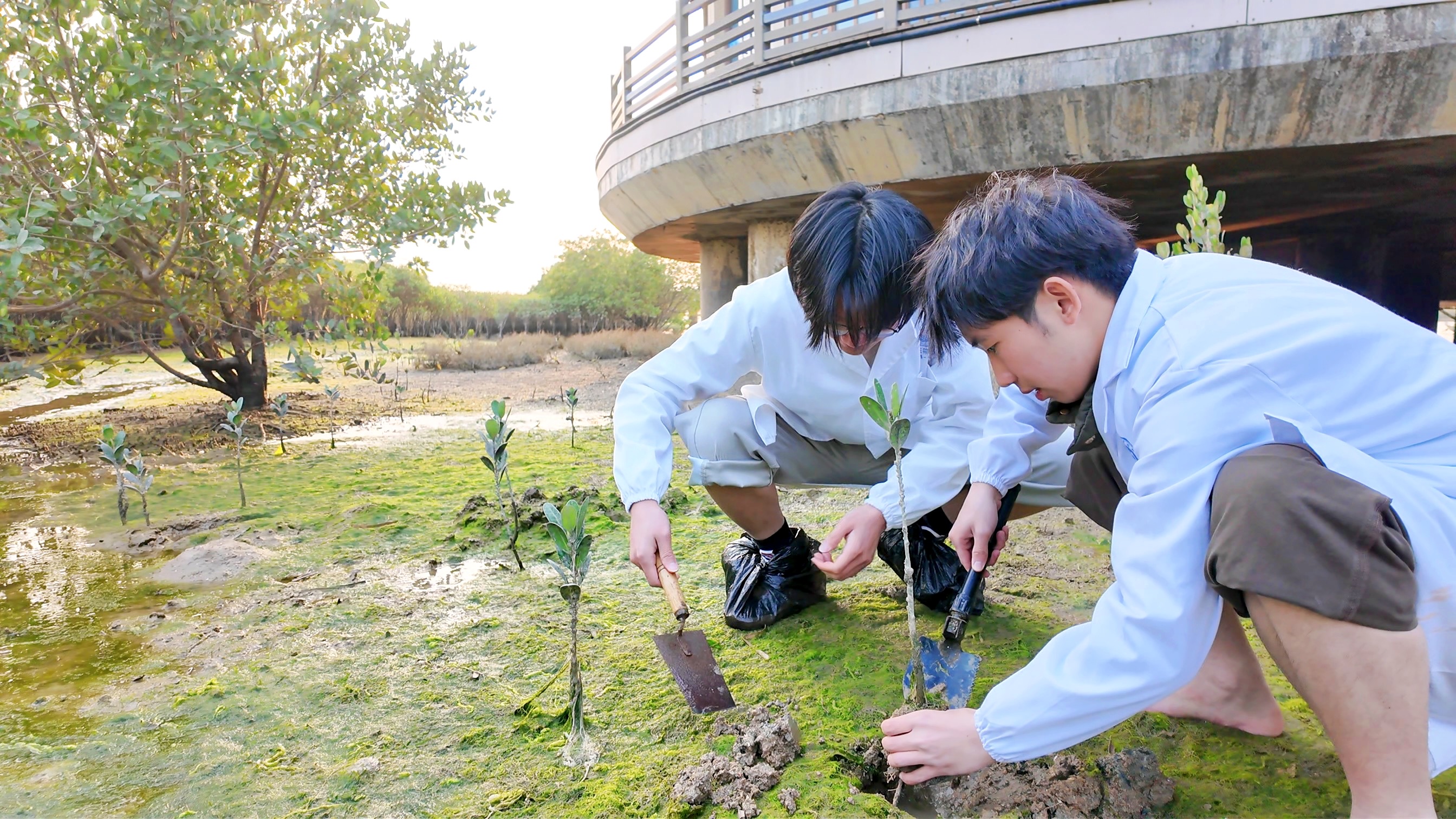 团队成员体验红树林树苗种植