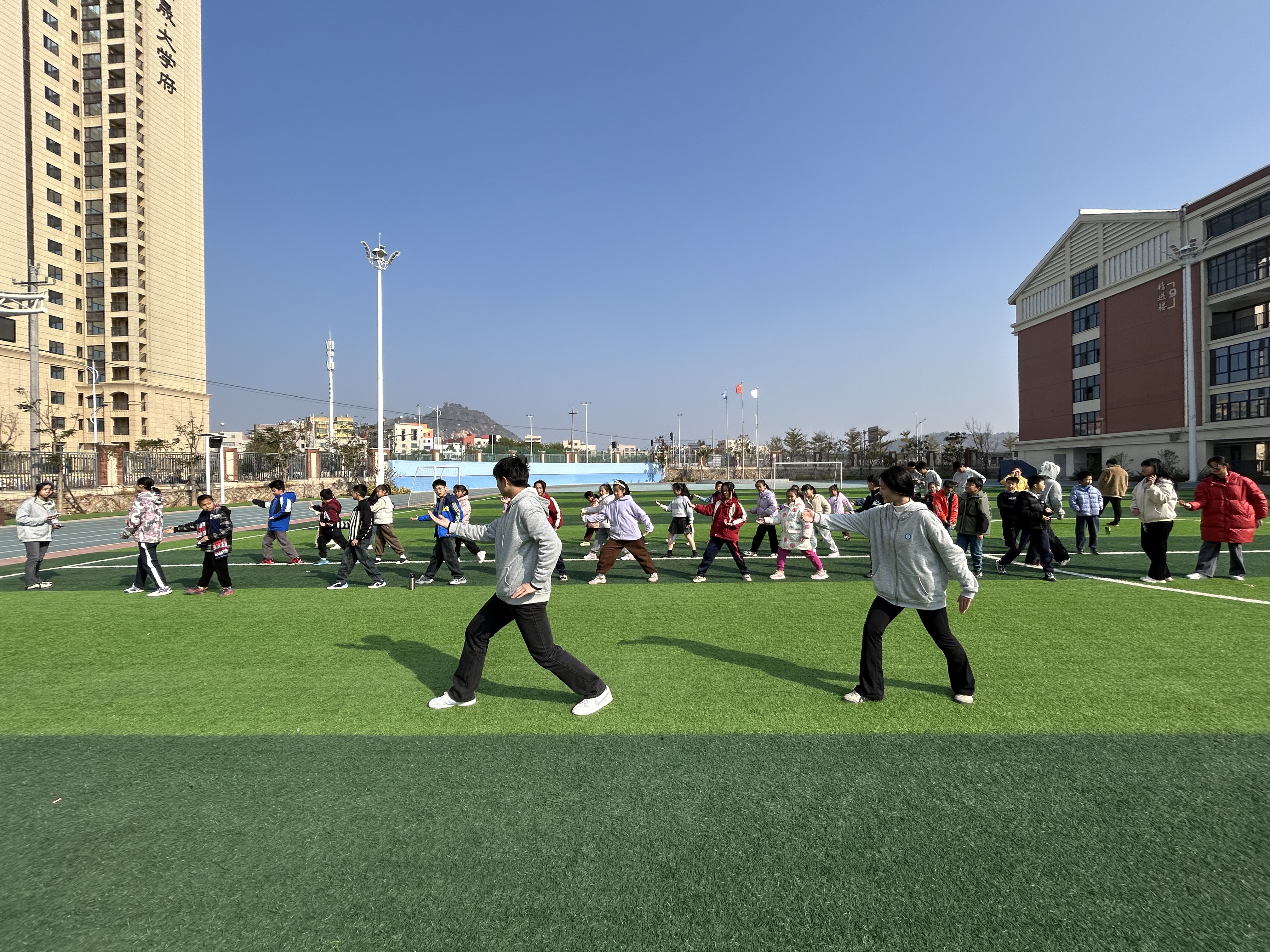 实践队队员们展示的太极拳教学也深受大中小学生喜爱。在队员们手把手的教学中,一招一式刚柔并济、行云流水,在场的小朋友充分认识到太极拳作为中华传统武术瑰宝的深厚内涵与强身健体之益处。