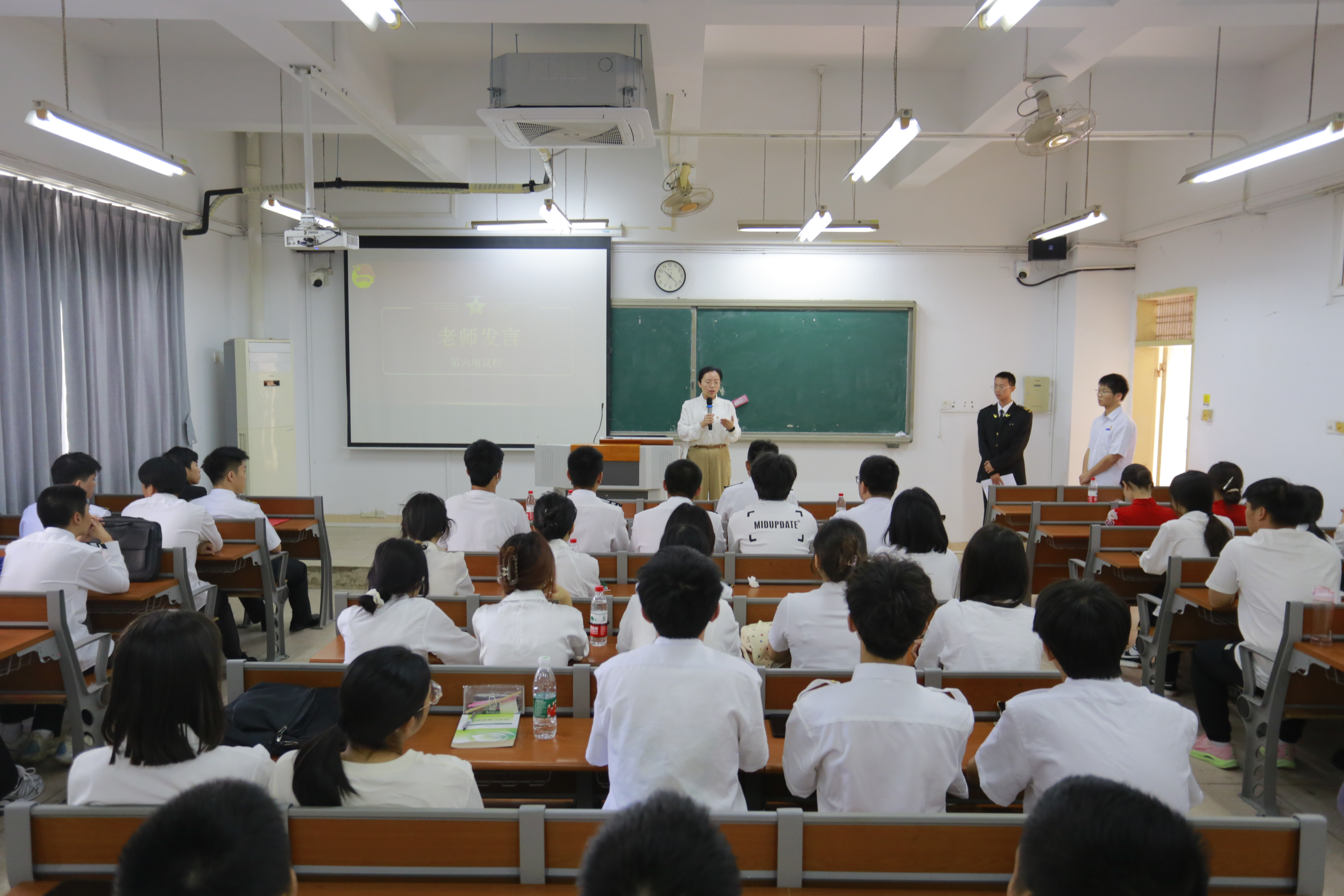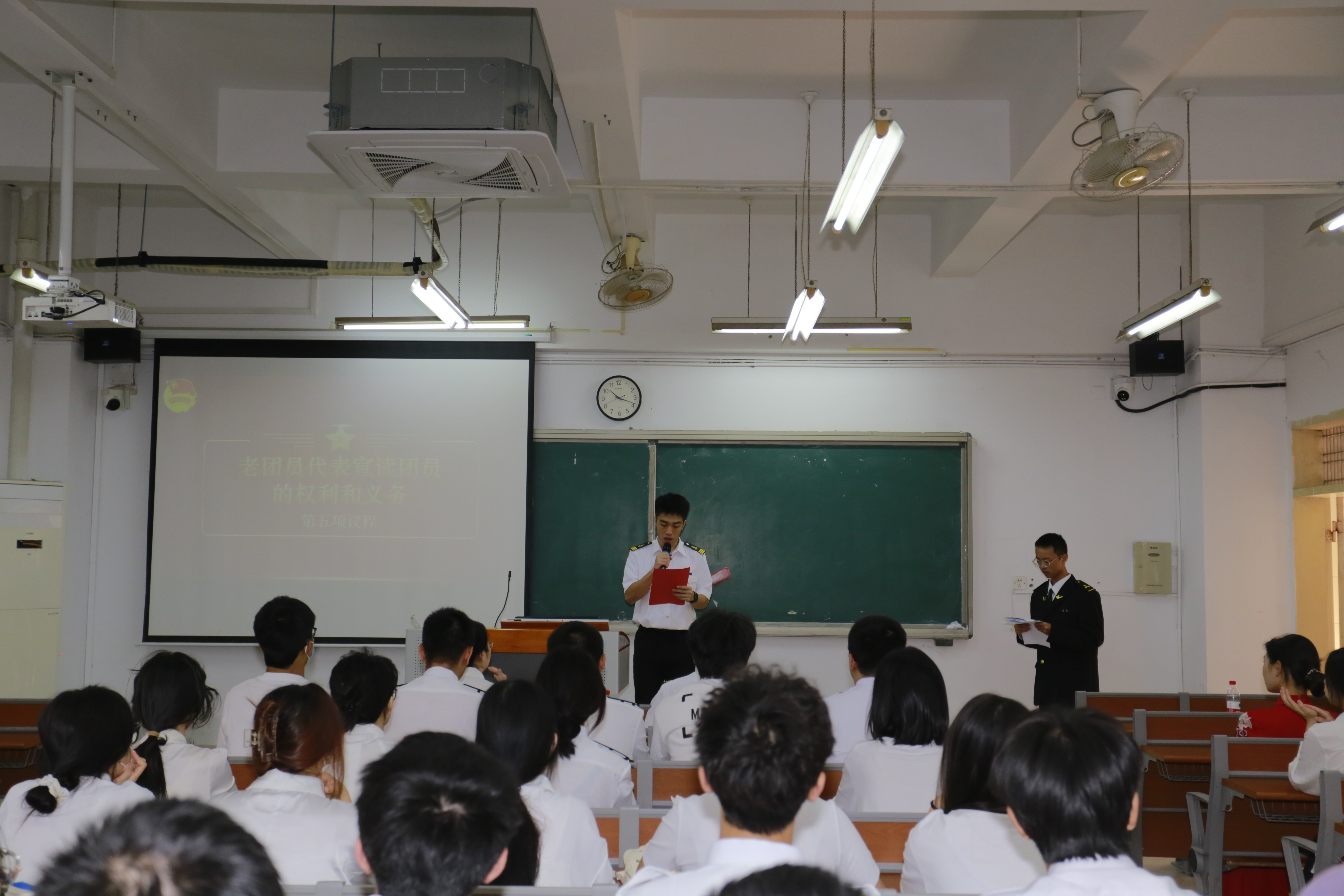 在领誓人的带领下,新团员们举起右拳宣誓。每一句铿锵的誓言都是团员们对共青团的忠诚承诺,也是对自己及社会的责任与担当。航海学院新团员吴杰煜和体育部部长康柯嘉,分别代表新老团员进行发言。他们提到,面对新时代的广阔舞台,作为年轻人应不懈奋斗,努力成长为能够肩负起民族复兴重任的时代新人,为实现中华民族伟大复兴的中国梦贡献自己的青春力量。