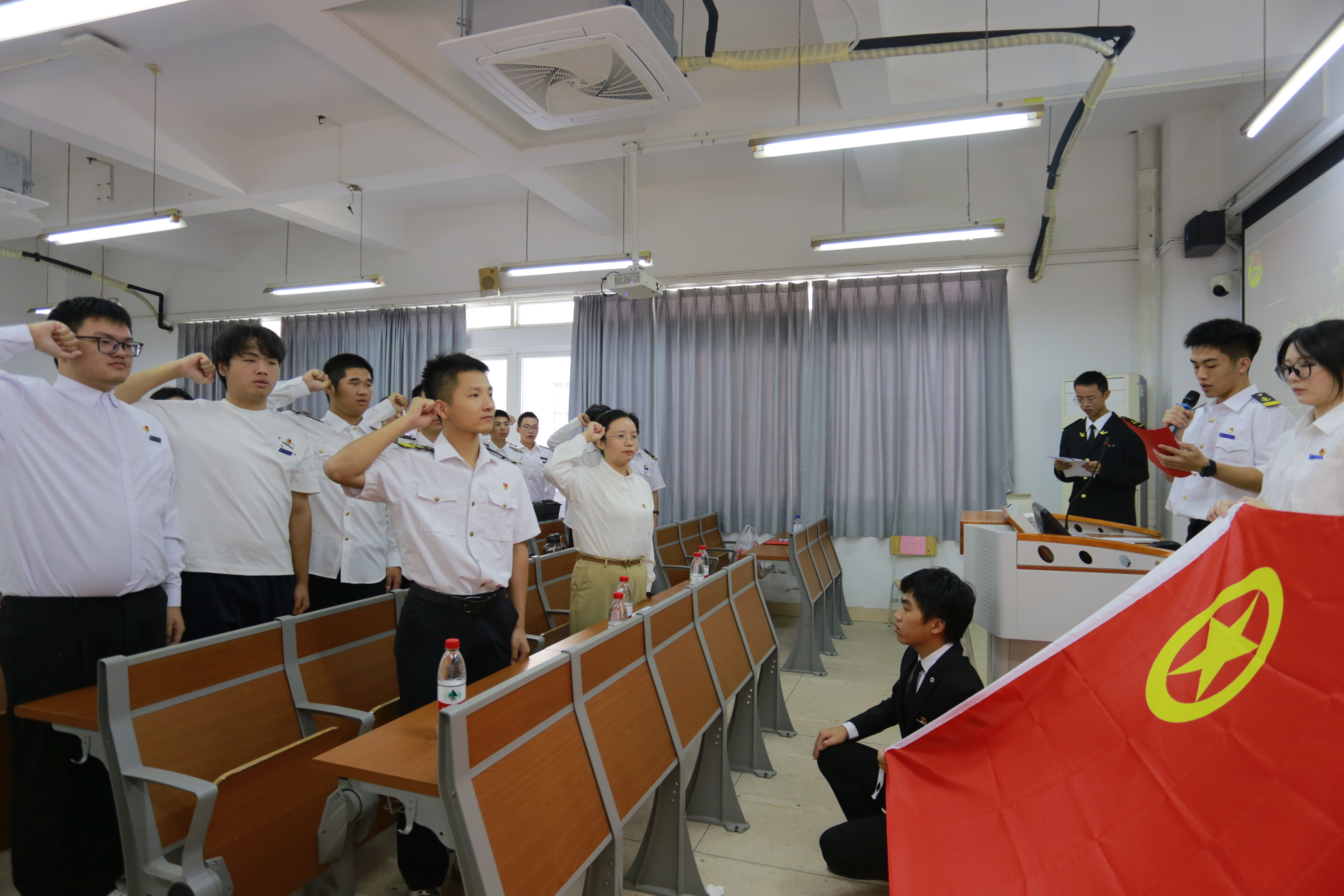为激发团员的荣誉感与使命感,使团员们能更坚定地拥护团组织,在学习与生活上发挥模范作用,11月7日上午,航海学院举办第二十一期新发展团员入团宣誓仪式暨五四特别主题团日活动。团总支书记吕文庭、团总支副书记朱云鹏及二十八名新团员和三十余名老团员到场参会。