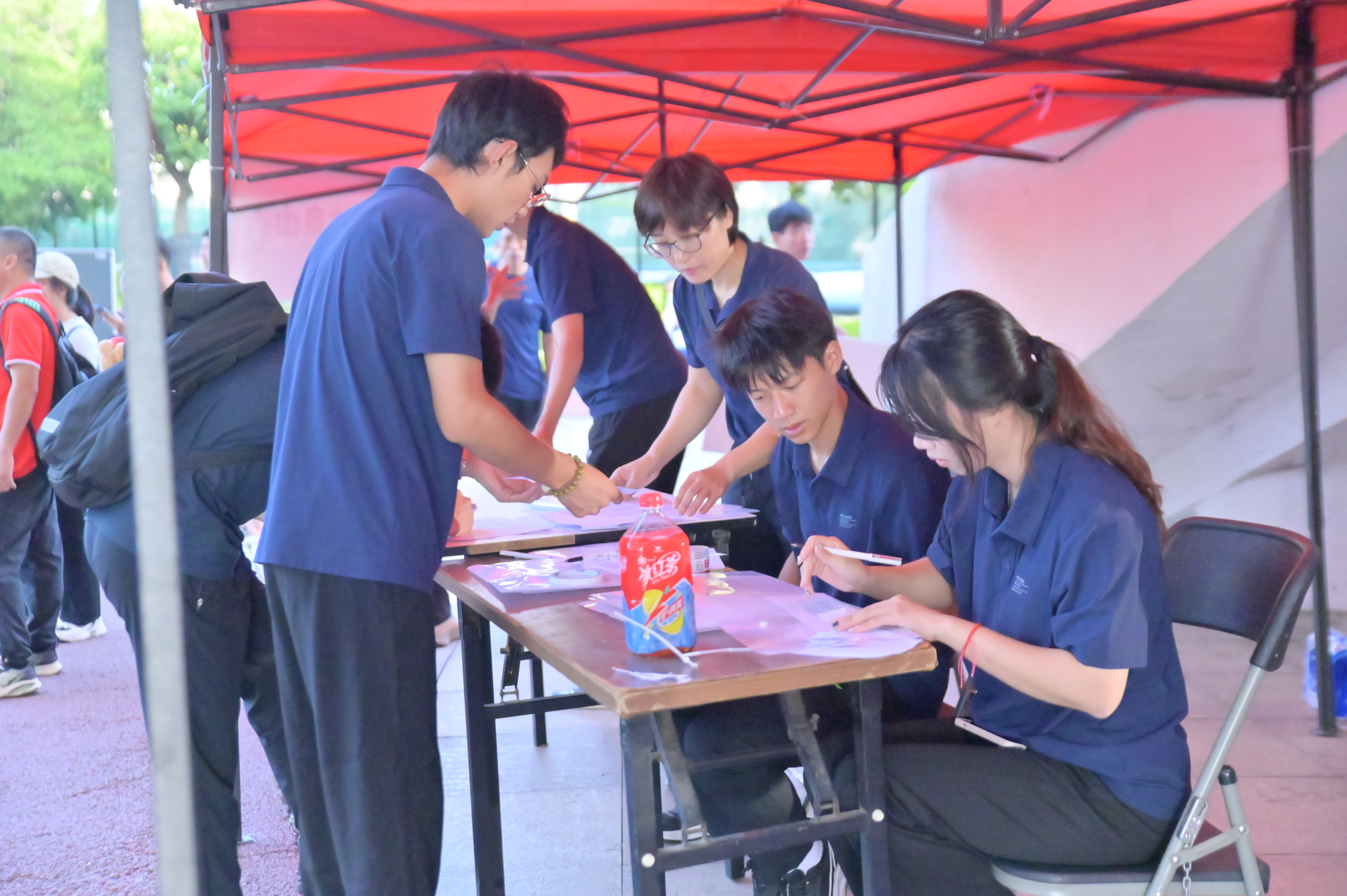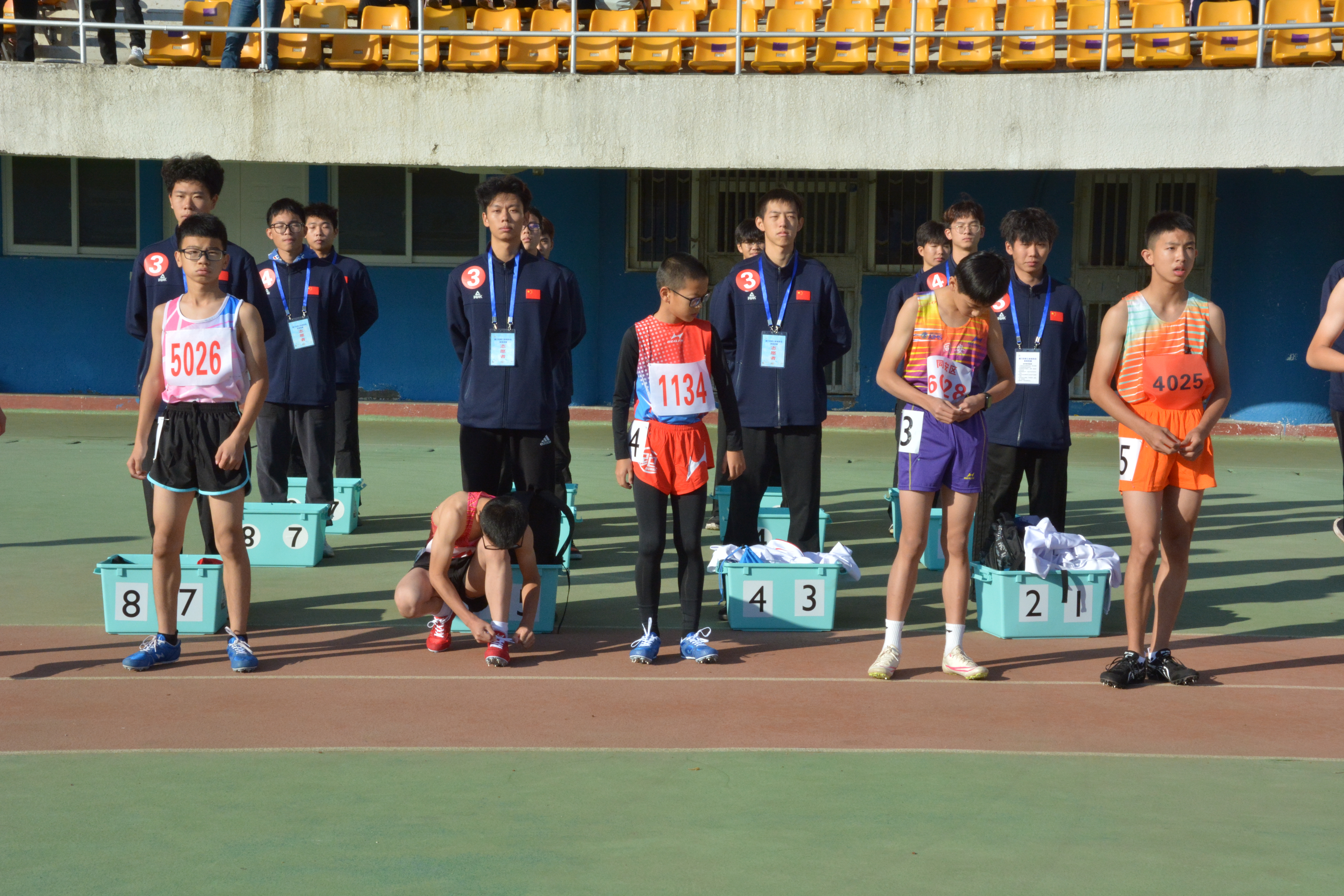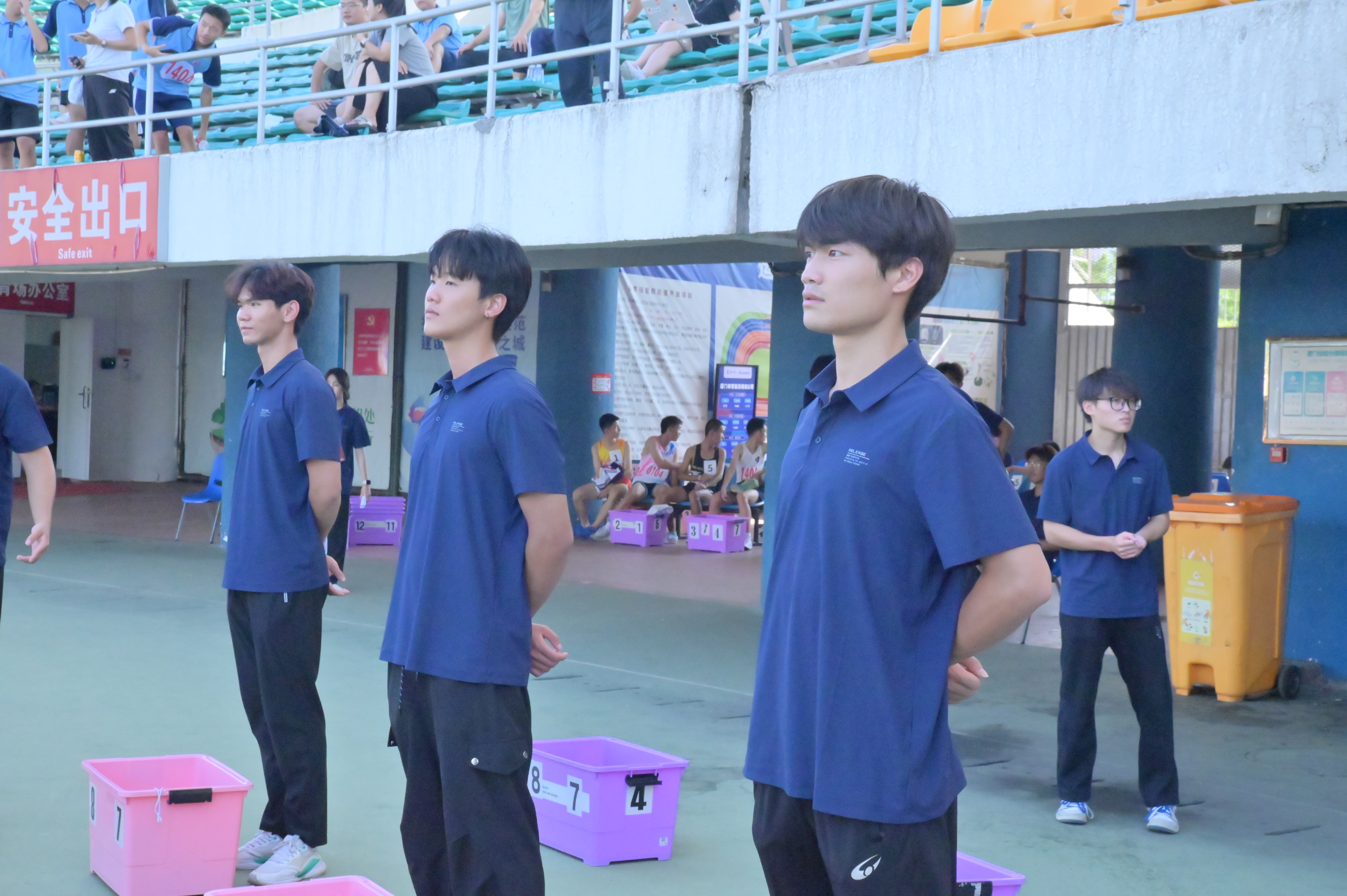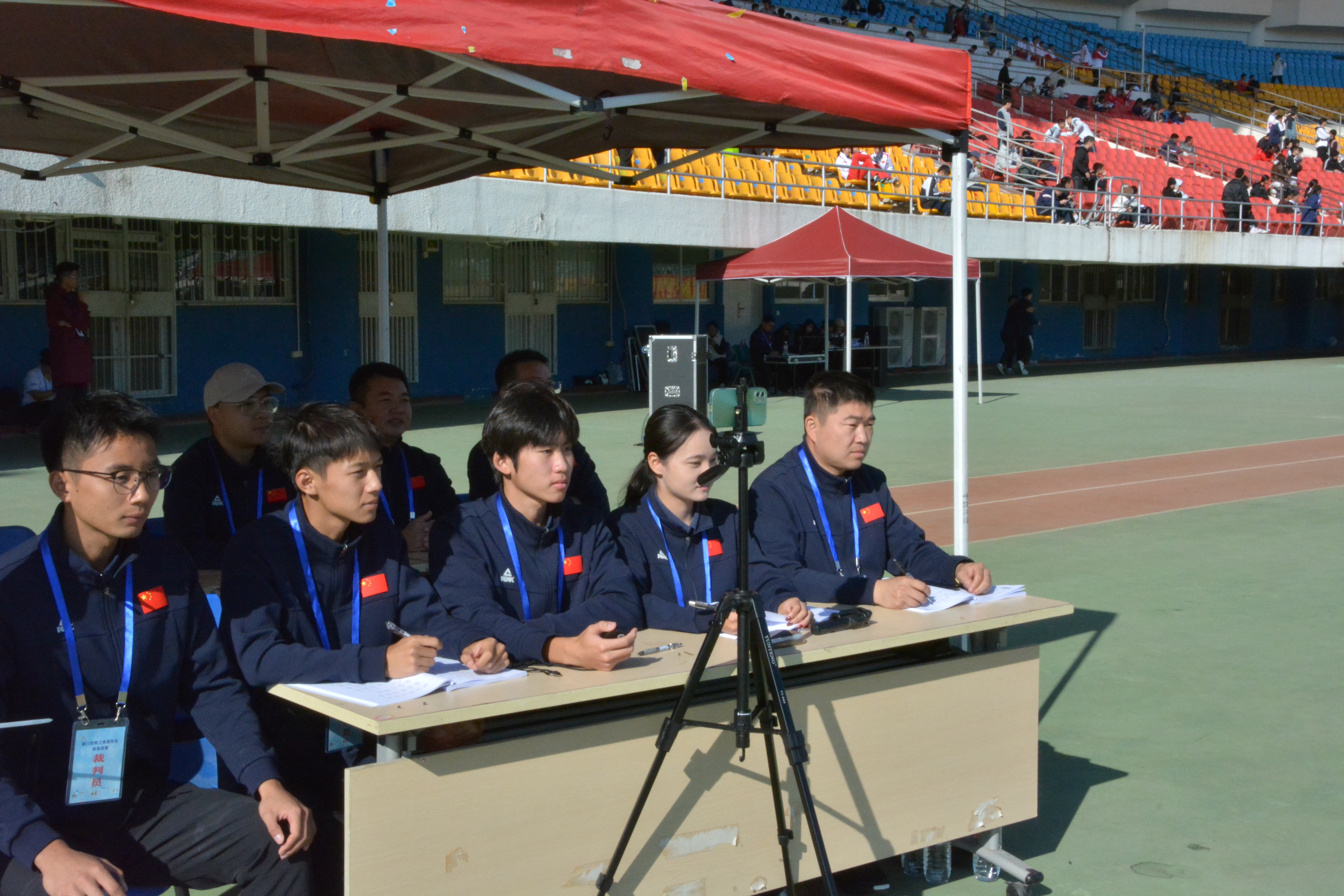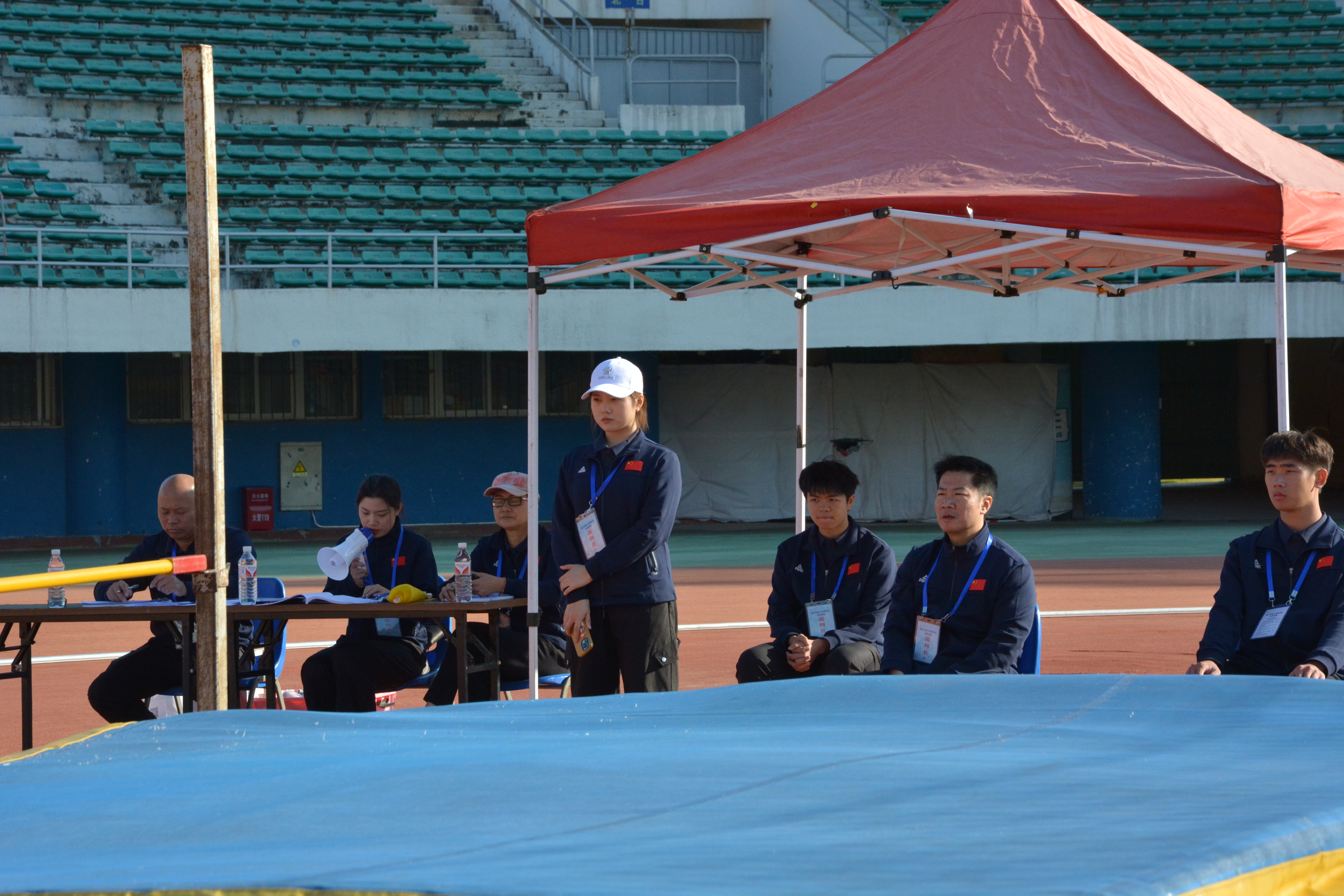 跳高比赛,从左到右依次是计时员、播报员、主裁判、录像裁判、志愿者、高度员