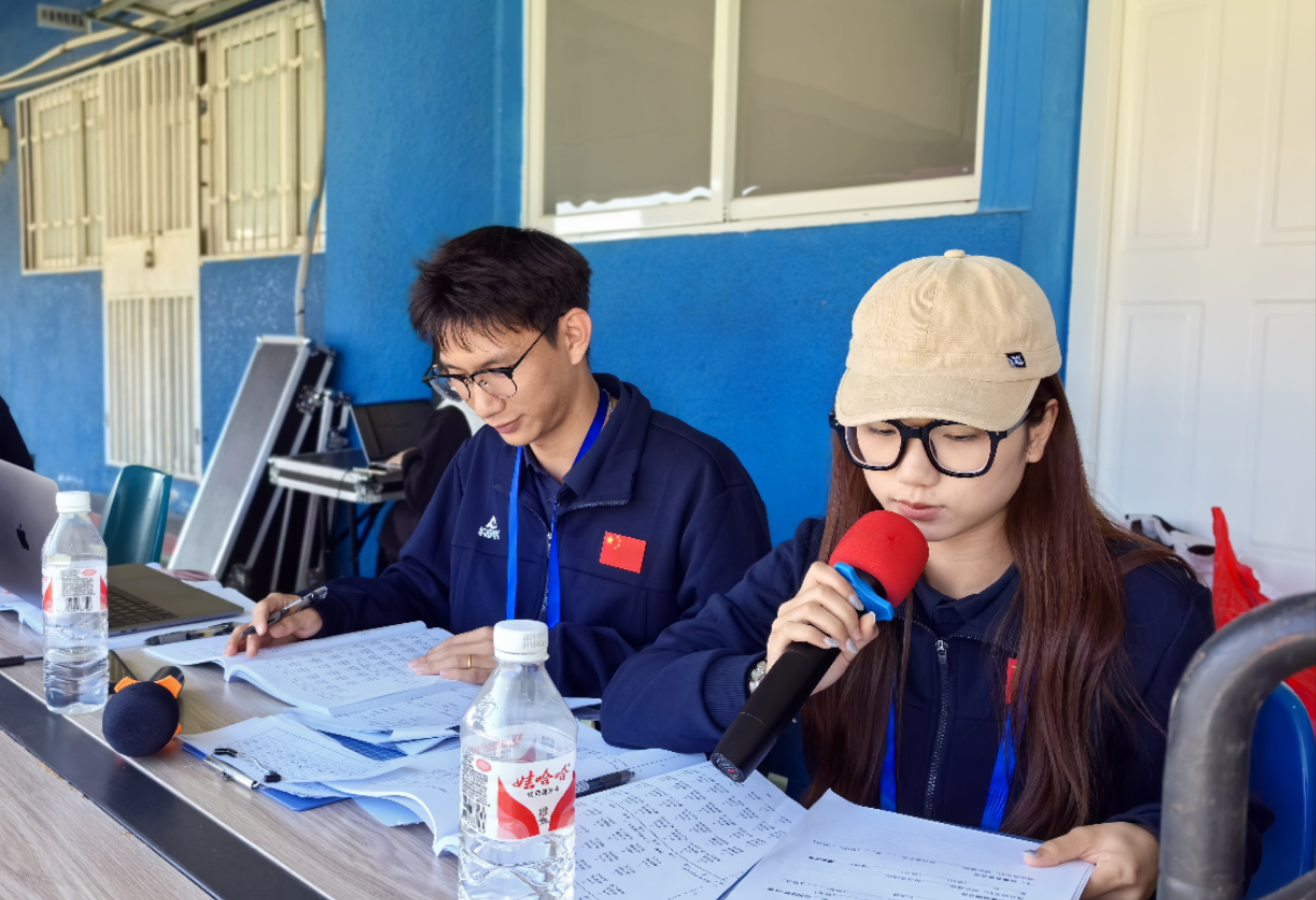 赛场后方宣告员播报赛事成绩情况