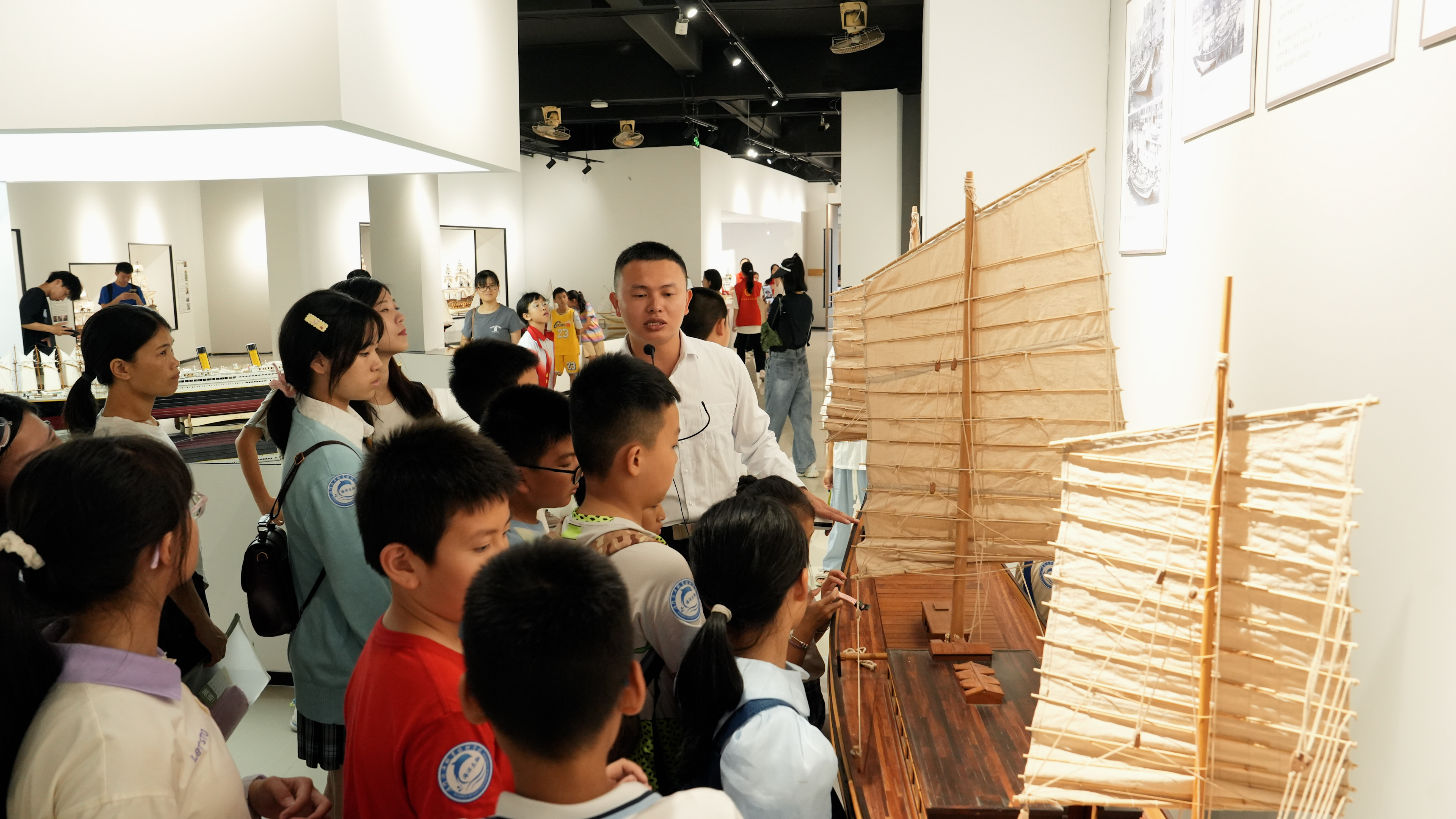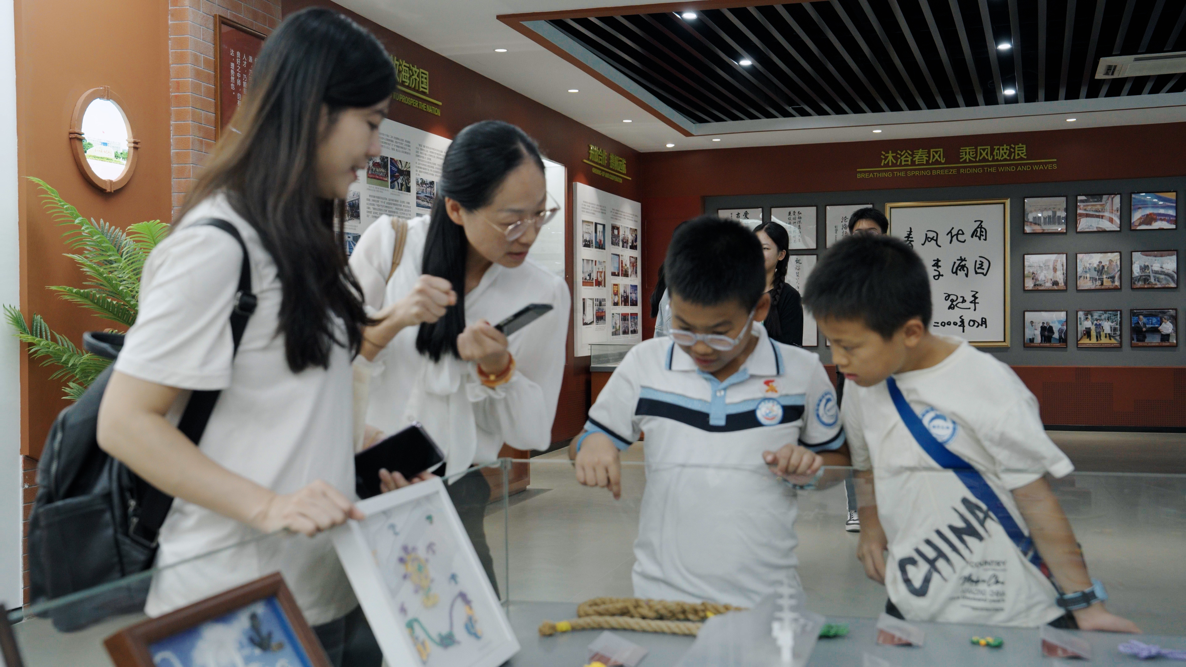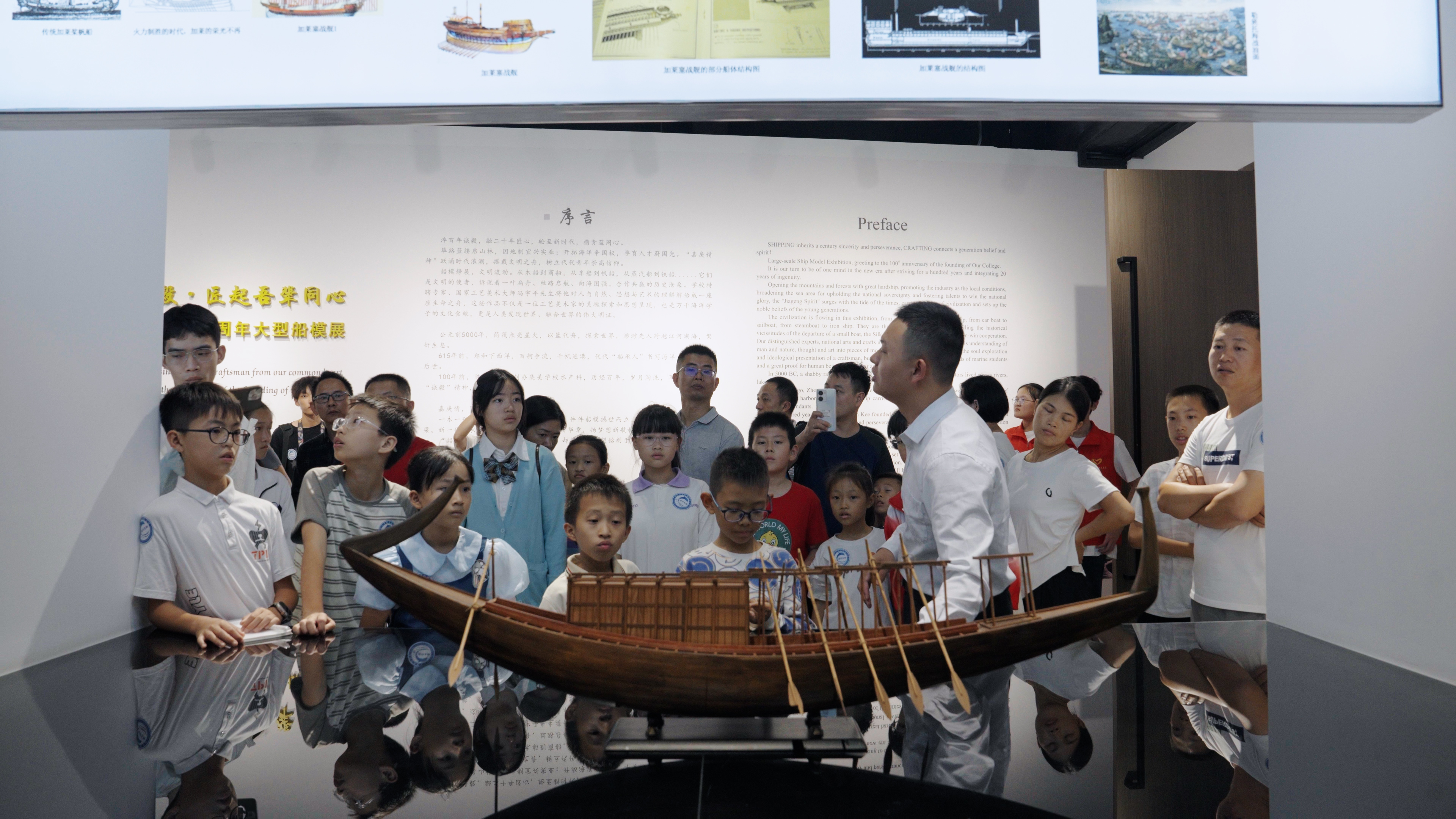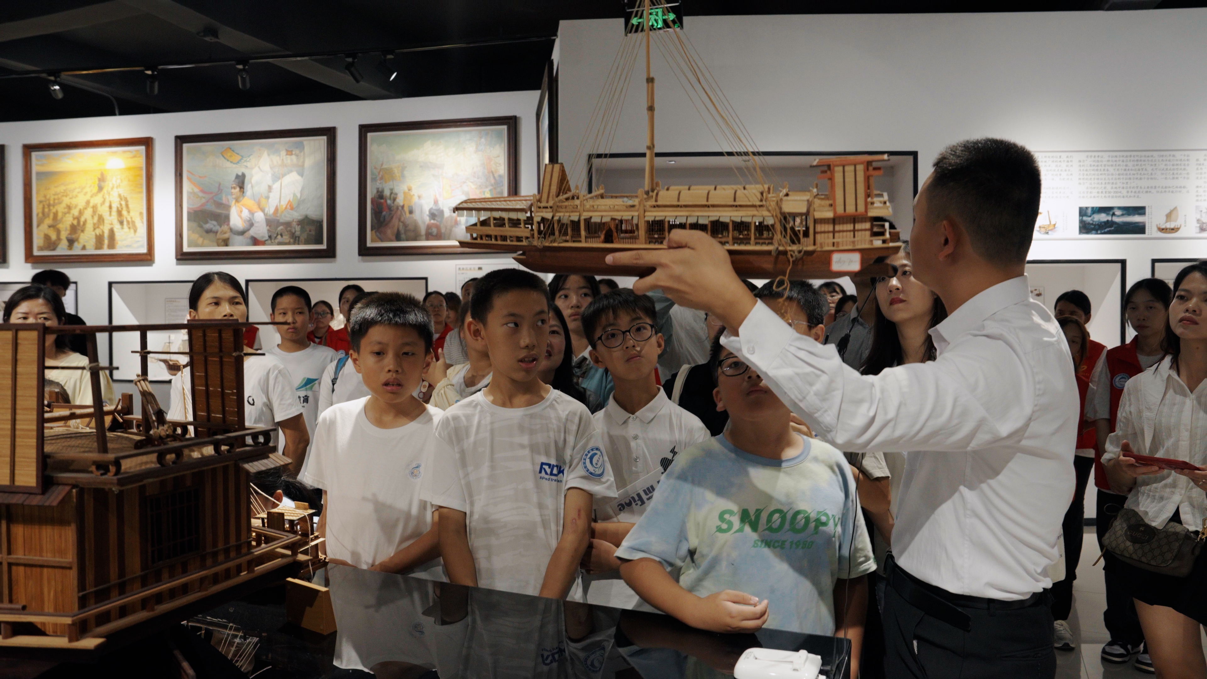 在世界船模文化馆,航海学院洪裕荣老师向青少年展开了一幅舟、筏、船舶、蒸汽船、柴油船演变的历史画卷,讲述东西方航海文化的起源、演变及传承,带领青少年领略郑和七下西洋波澜壮阔的历史片段,描绘蒸汽时代向海图强的历史巨变,讲述现代柴油船时代贸易与和平的互利互赢,感受人类对海洋的探索与征服。