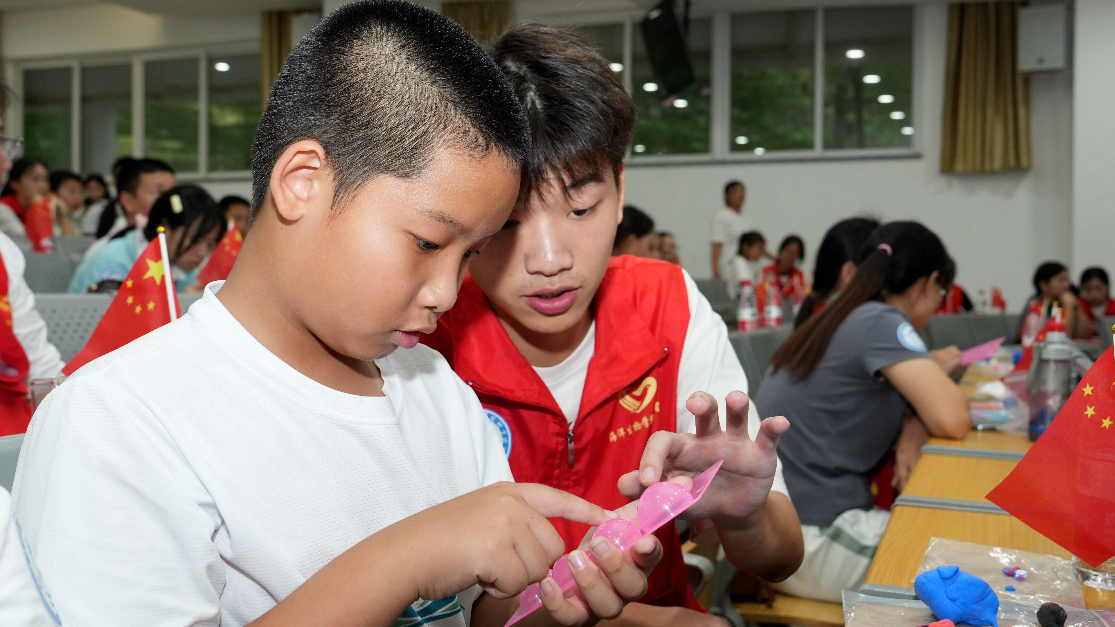 海洋生物学院加工3221班的黄益辰同学给现场的研学团队带来非遗文化体验—手工“面塑”。他拥有6年的食品雕刻经验,在校创立“奉心巧契”工作室,曾获多项省级创新创业竞赛奖项。“奉心巧契”工作室结合海洋生物专业特色,给在场的研学成员面对面、手把手地传授“小海豚”制作方法。一只只栩栩如生的海豚作品活灵活现,深受孩子们的喜爱。