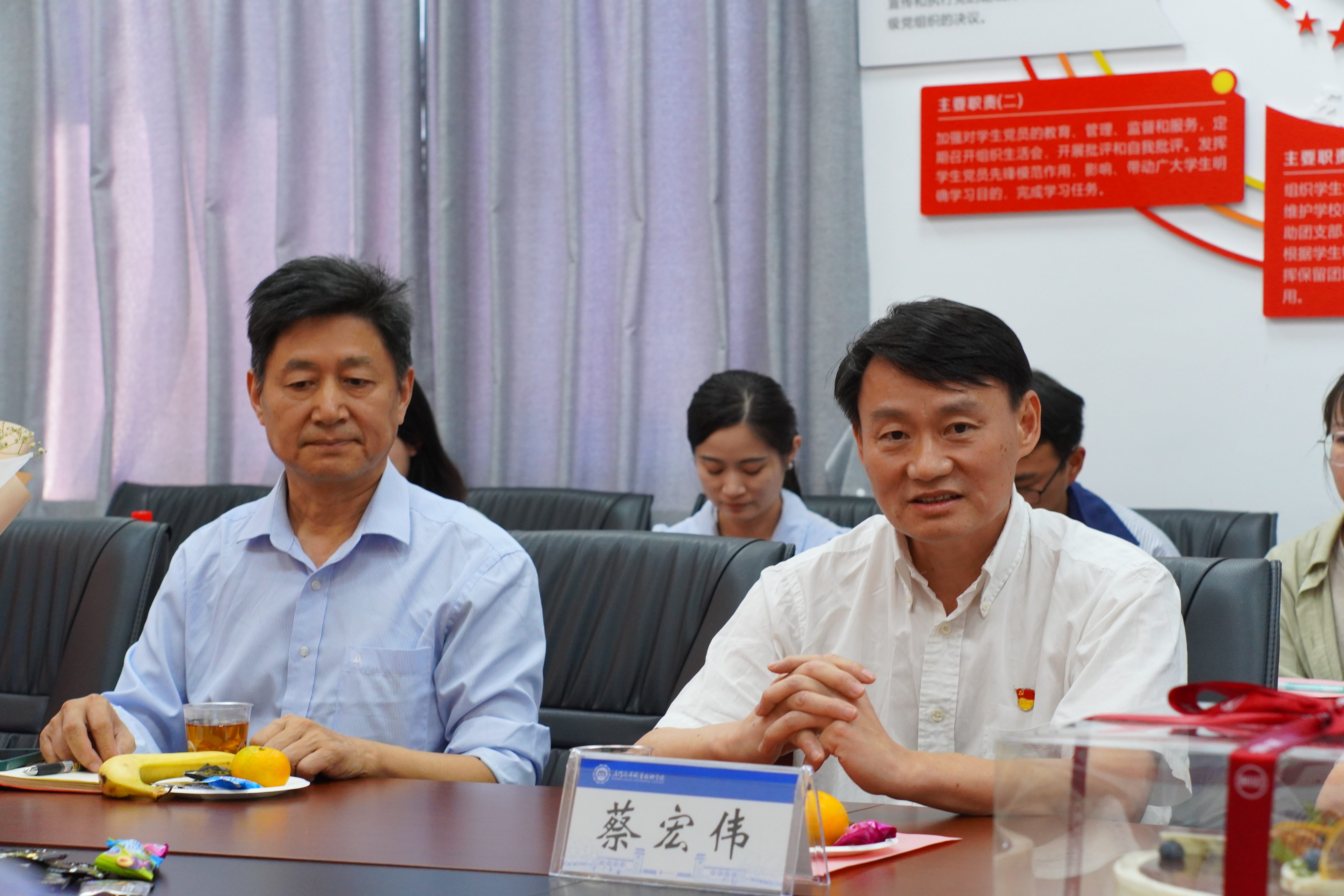 蔡宏伟发表致辞,对王斌书记多年来为学校所作出的贡献予以高度评价;他表示退休不仅是职业生涯的落幕,也是崭新生活的序曲,是一场心灵的归宁,引用“莫道桑榆晚,为霞尚满天”“不用名山访真诀,退休便是养生方”等诗句表达对王斌书记由衷的祝福;同时他还对新教师的加入表示欢迎,强调献身教育事业要“扣好第一粒扣子”,加强理论学习、弘扬“嘉庚精神”和“诚毅”校训,践行教育家精神,做心中有爱,眼里有光的“四有”好老师。