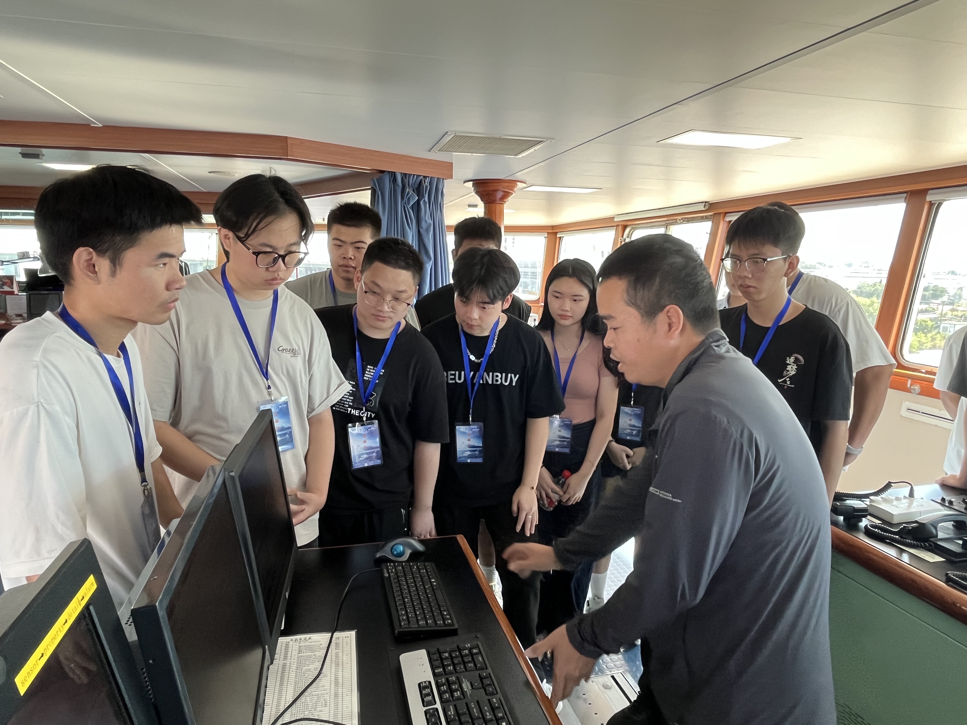 在综合控制台和综合仪器室,学生们深入了解了控制船体运动的技术,包括雷达系统和北斗导航系统,以及用于水流测量、海底地形地貌探测等科学研究的先进设备。通过实际案例,详细解释了这些仪器如何帮助科学家分析海洋环境和地质构造。