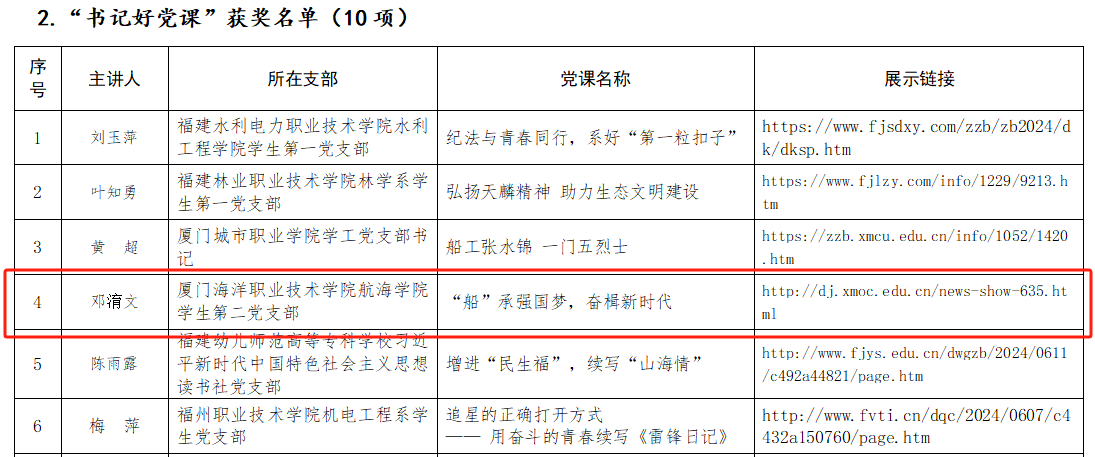 近日,中共福建省委教育工作委员会公布了关于高校党支部工作“立项活动”优秀成果和“党员好故事、书记好党课、支部好案例”评选结果,航海学院学生第二党支部副书记邓淯文老师主讲的党课《“船”承强国梦,奋楫新时代》入选“书记好党课”获奖名单。