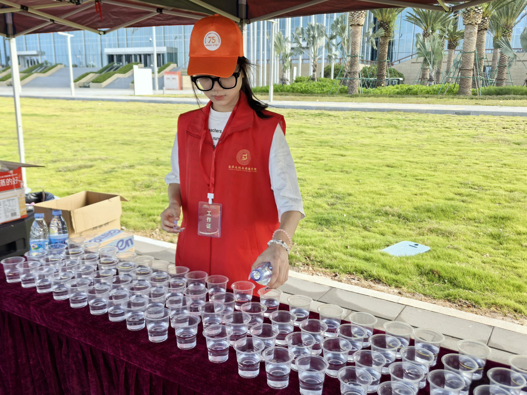 海洋文化与旅游学院学生身着红马甲,忙碌而有序,分发着活动所需的各类物资,确保每一个环节都能顺利进行。随着主会场宣布活动开幕,骑行与健步行的队伍浩浩荡荡地出发,志愿者们化身为队伍的守护者,为他们指引方向,确保安全。志愿者们成为沿途一道亮丽的风景线!每一次挥手致意,每一次加油鼓劲,都是对健步、骑行参与者最真挚的祝福。