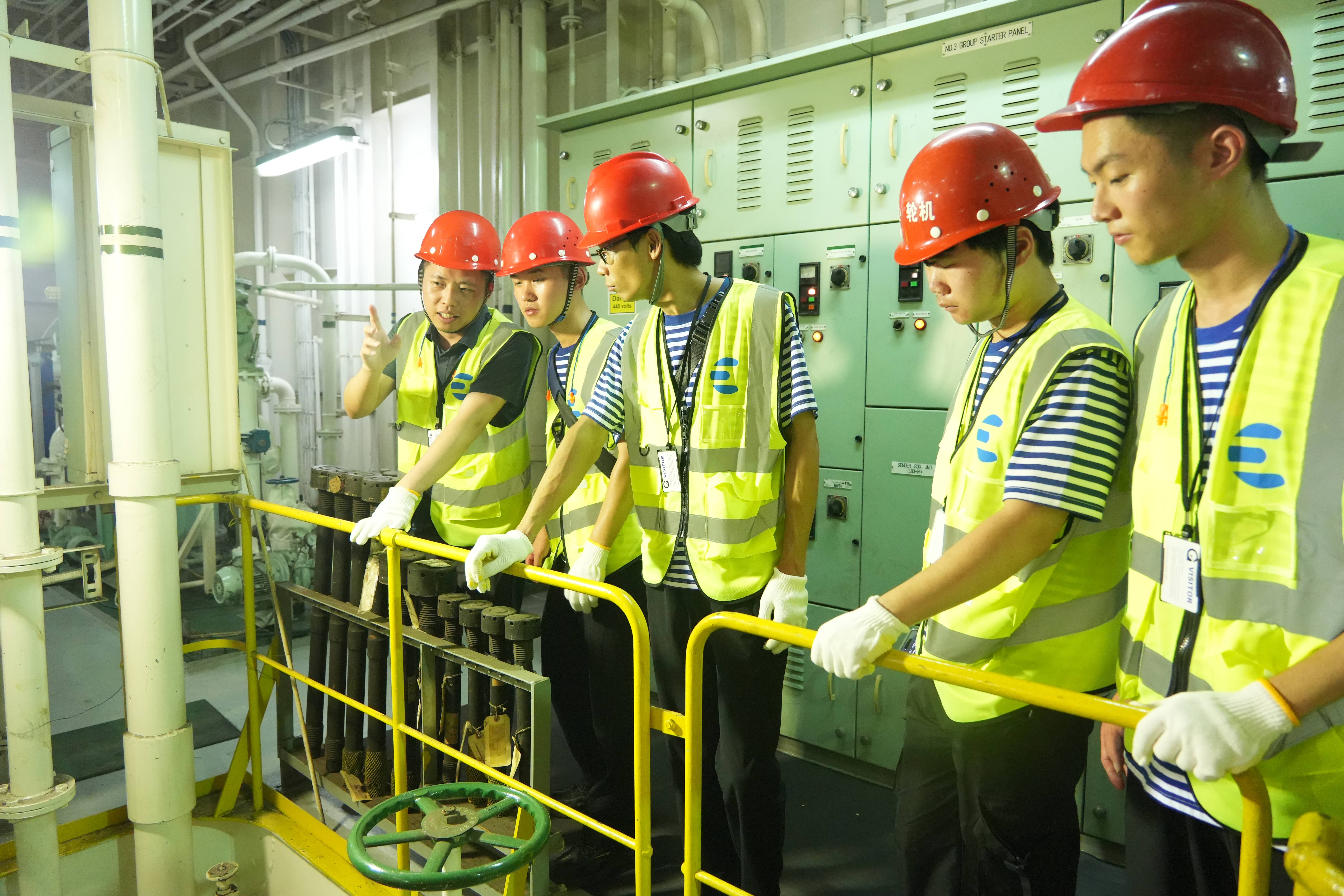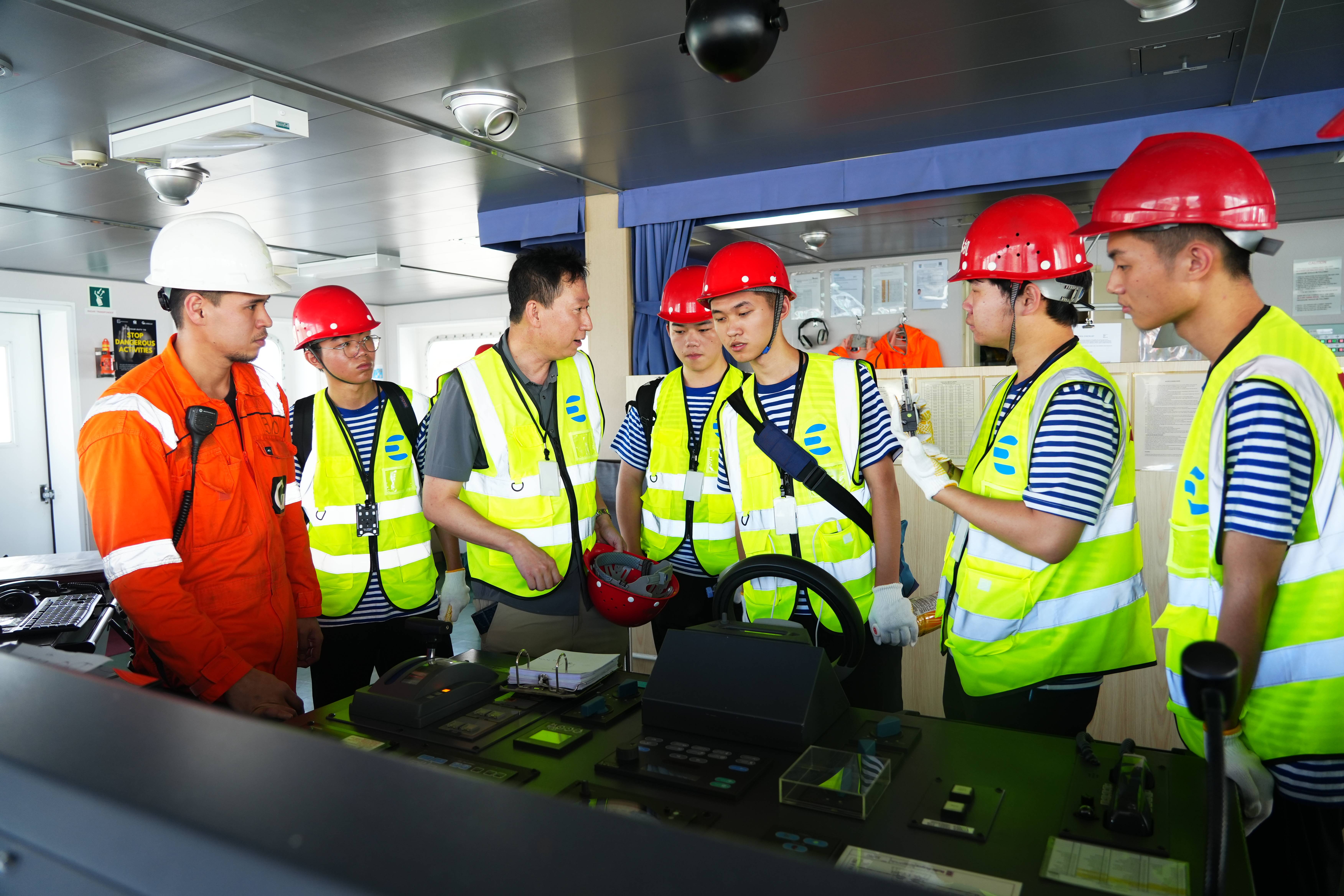 在张成桥船长的带领下,实践队师生穿戴工作装备,登上Maitaca Arrow号实地调研船舶的机舱、驾驶台、货物装载操作室等工作场所。实践队队员们直观地了解船舶的结构、设备、操作流程以及船员的工作环境。此次调研将书本上的知识生动地展现在了实践队队员们的眼前,使理论知识具象化,有助于实践队队员们全面而深入地了解航运事业,并为未来的航海职业生涯做好充分准备。