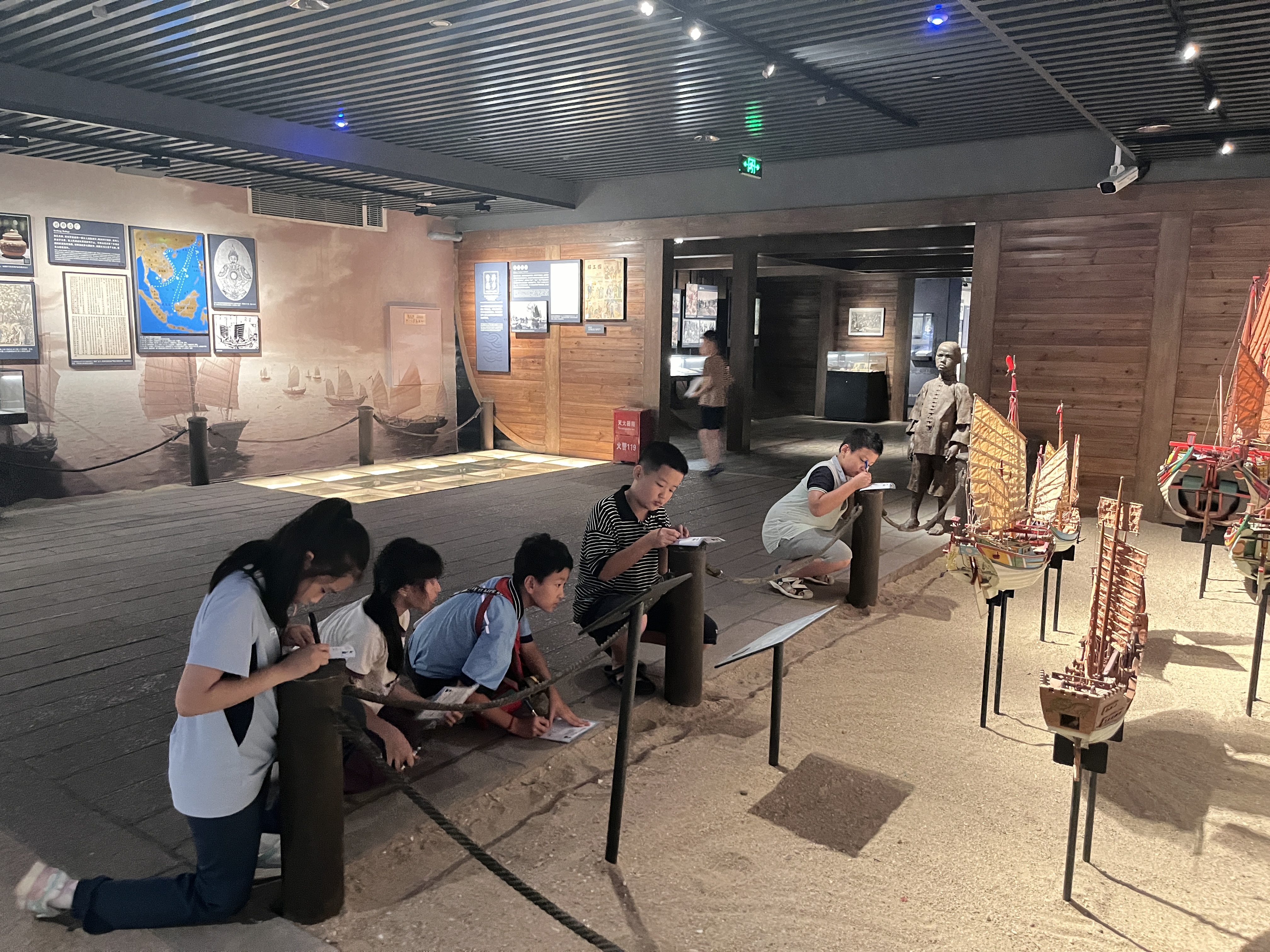 当孩子们踏入博物院,仿佛在一瞬间突破了时空的束缚,与华侨先辈们一同搭乘福船,开启了一场海上的奇幻冒险之旅。在探寻答案的征途上,他们深刻领略到我国海洋文化的博大精深,并沉醉于海洋的无尽魅力。这一切深深激发了孩子们对祖国的热爱,让他们更加尊重和珍视这片孕育了无数传奇的蓝色国土。孩子们纷纷化身为勇敢的探险家,穿梭在博物院的各个角落,仔细寻找每一个藏宝点。每个藏宝点都设有独特的海洋知识问答,他们认真思考,努力寻找正确答案,展现了极高的专注力和探索精神。