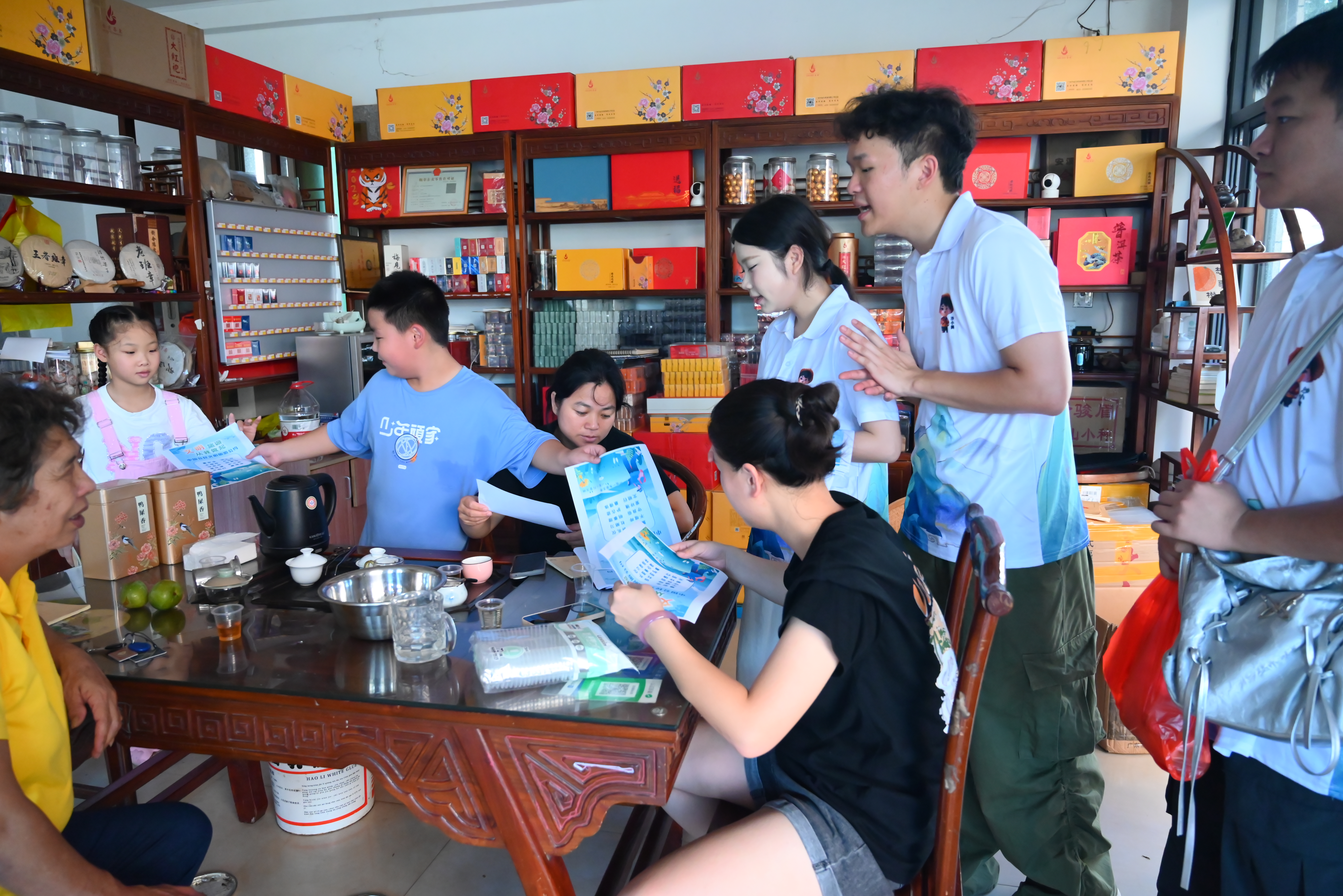 图为实践队队员在沙美社区商铺发放文明旅游宣传单 苏伊俊 摄