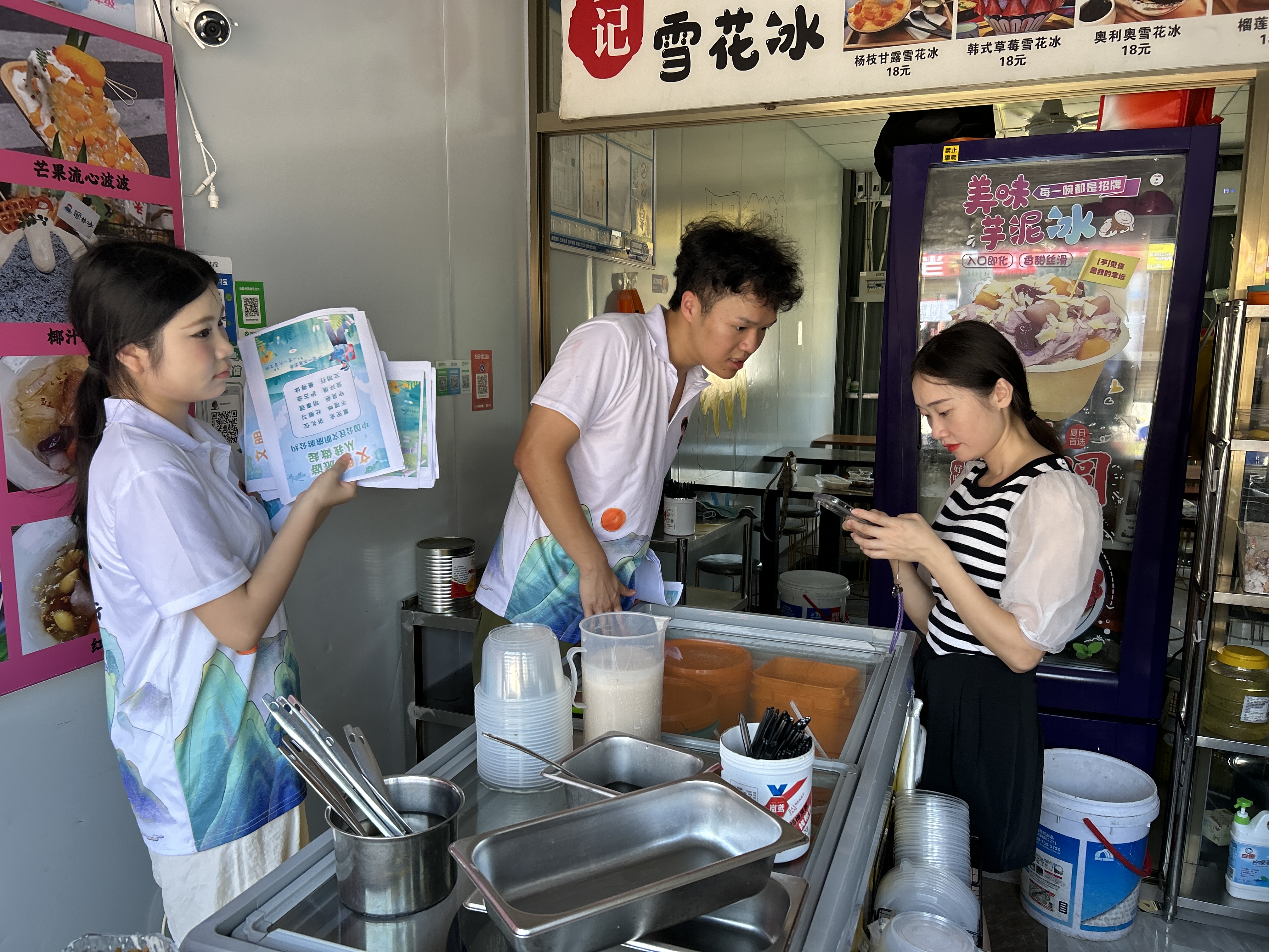 图为实践队队员在沙美社区美食街引导店铺老板完成文明旅游线上问卷 苏伊俊 摄