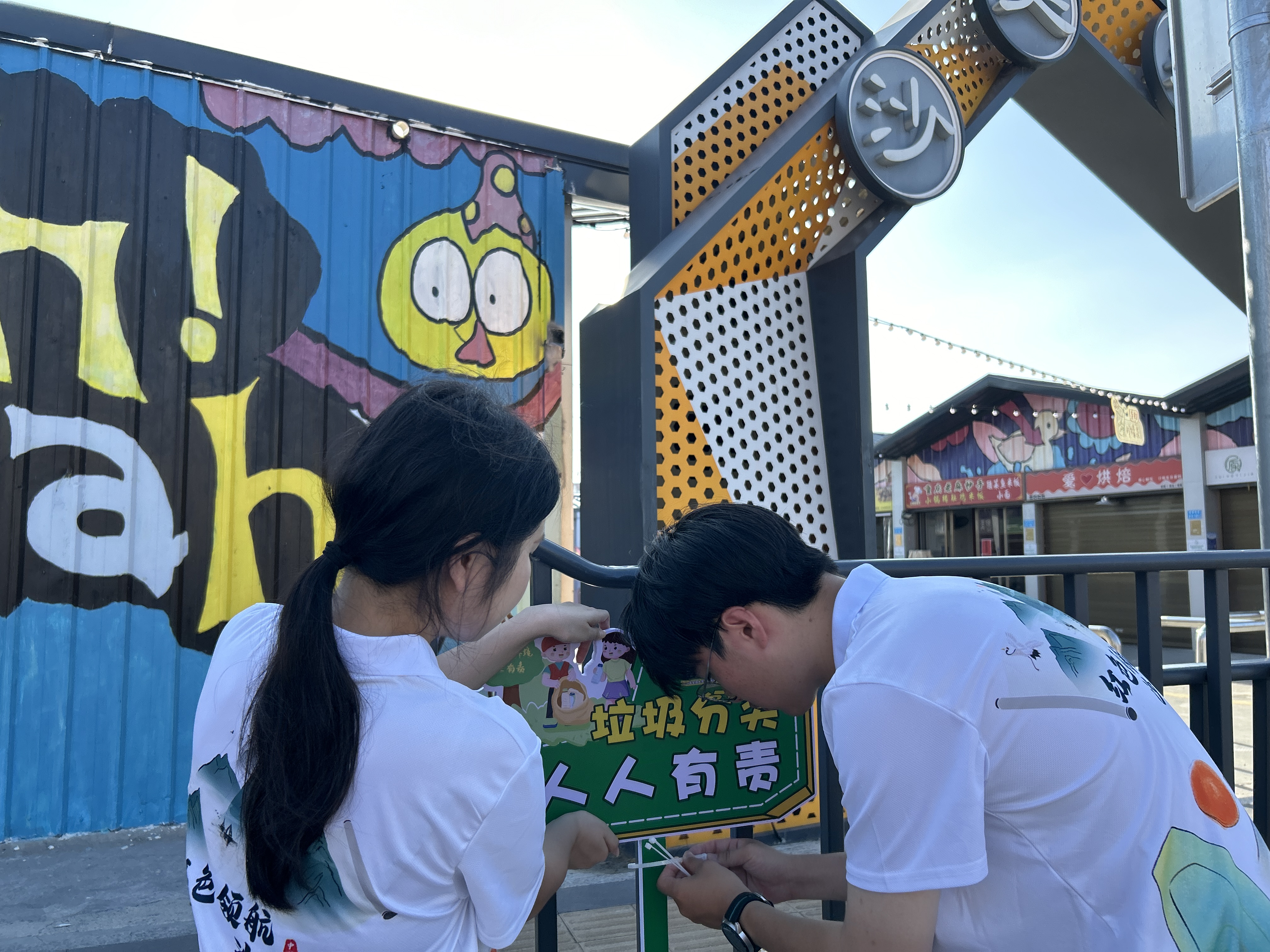 为进一步提升当地居民与游客的文明旅游意识,实践队精心设计了多块文明旅游宣传牌。这些宣传标牌上,不仅印有“垃圾分类,共建美好家园”等环保号召,还有“善待环境,关爱自然”的深情寄语,以及“文明旅游理性消费”的理性提倡,更有“旅途漫漫,文明相伴”等温馨提示。在沙美社区的每个角落,从生机勃勃的都市田园到庄严肃穆的革命烈士彭友圃故居,从书香四溢的图书馆到热闹非凡的沙美美食街,再到风景如画的公园,实践队成员们亲手将这些标牌安装到位,让每一块土地都承载着文明旅游的种子,让每一位踏入沙美的游客都能沐浴在浓厚的文明氛围中,自然而然地规范言行,共同守护这片美丽的土地。